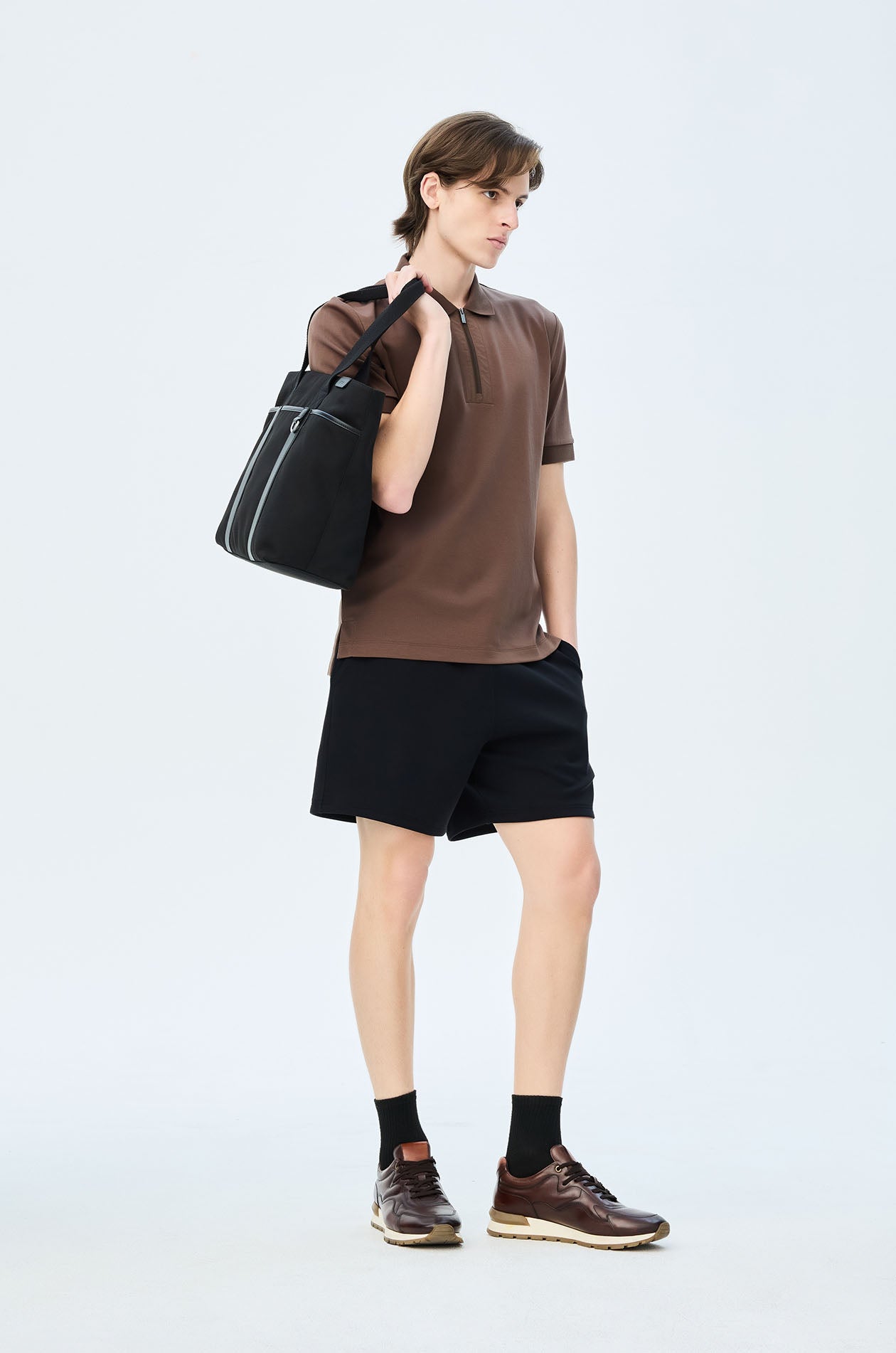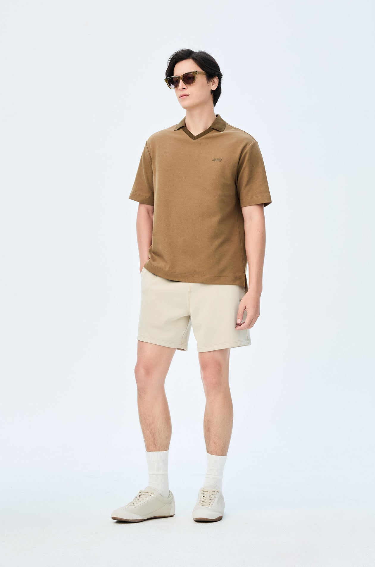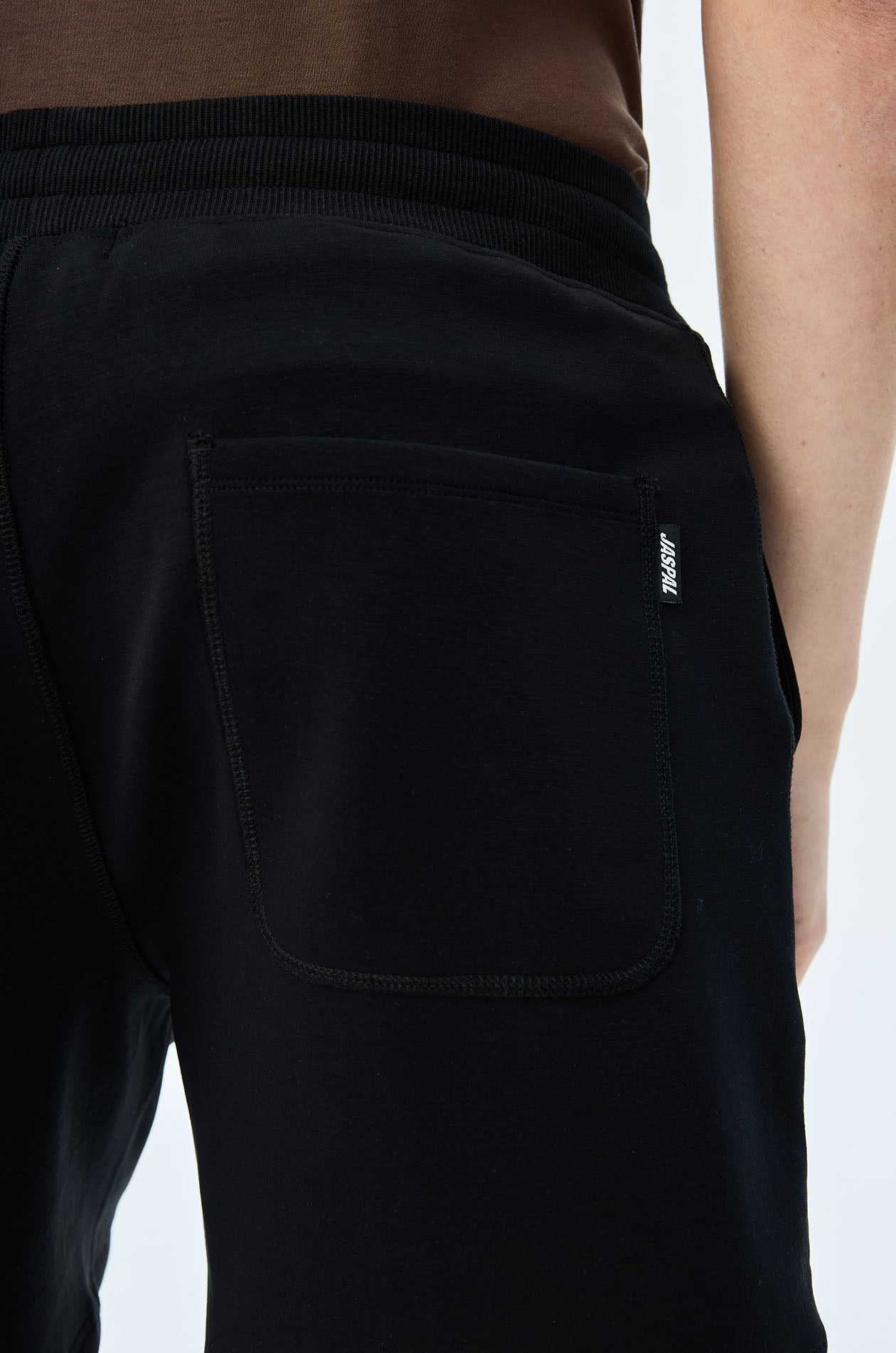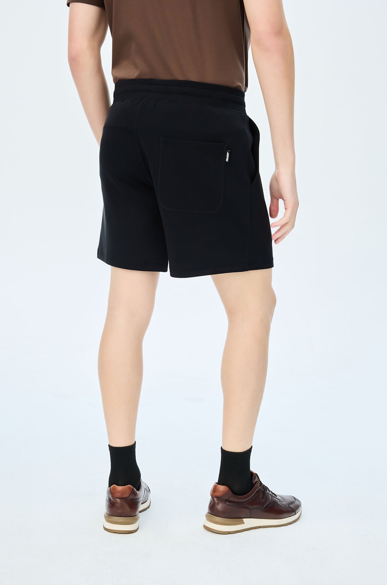 Mid-rise sweatshorts in spongy scuba fabric. Above-knee length with side and back pockets. Elastic drawstring waistband. Available in black and light beige.
