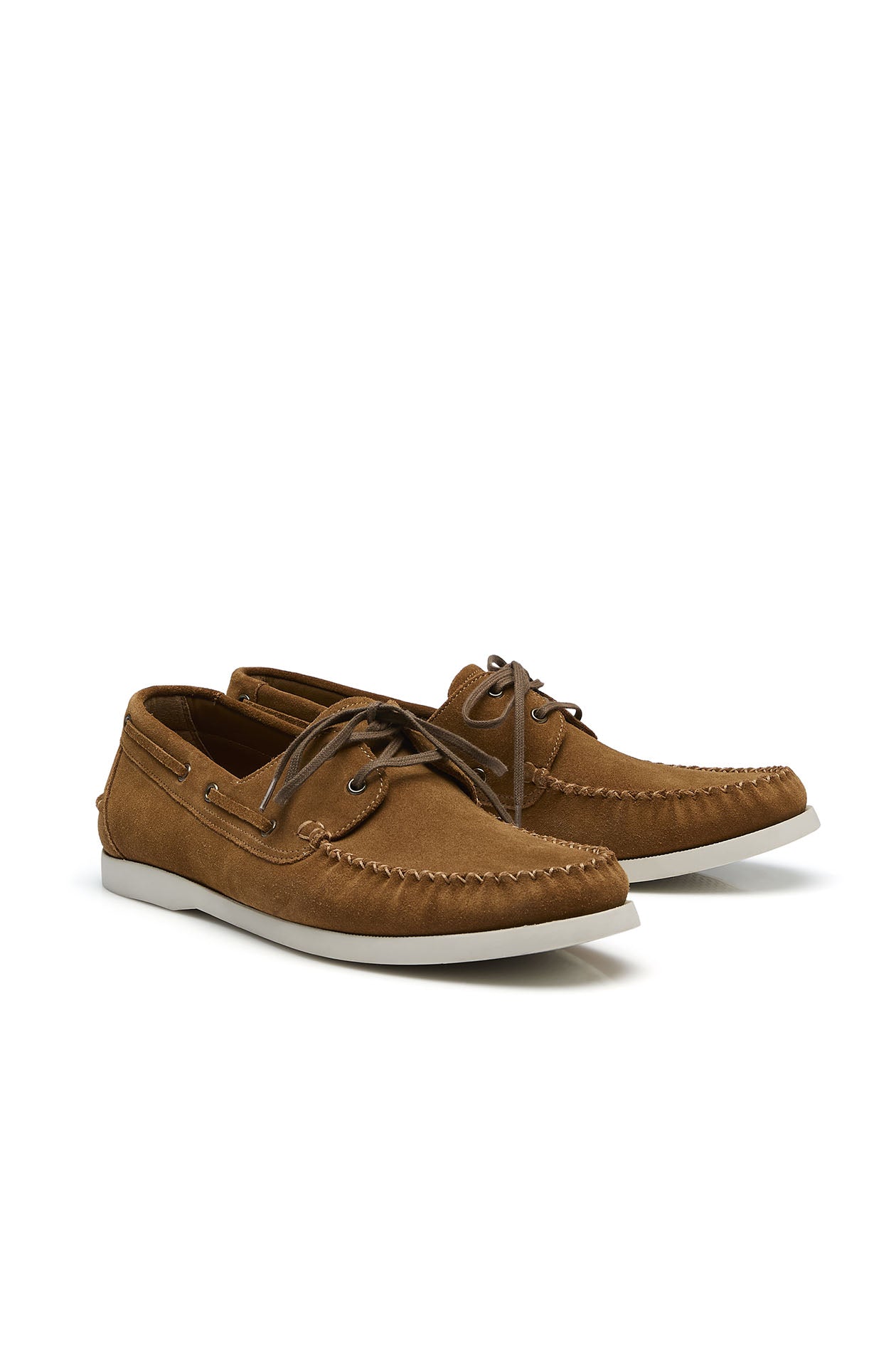 Boat shoes crafted from soft cow suede leather. Designed with classic moc-toe stitching and lace-through detailing, they provide a secure, comfortable fit. Set on a durable sole. Available in beige and brown.