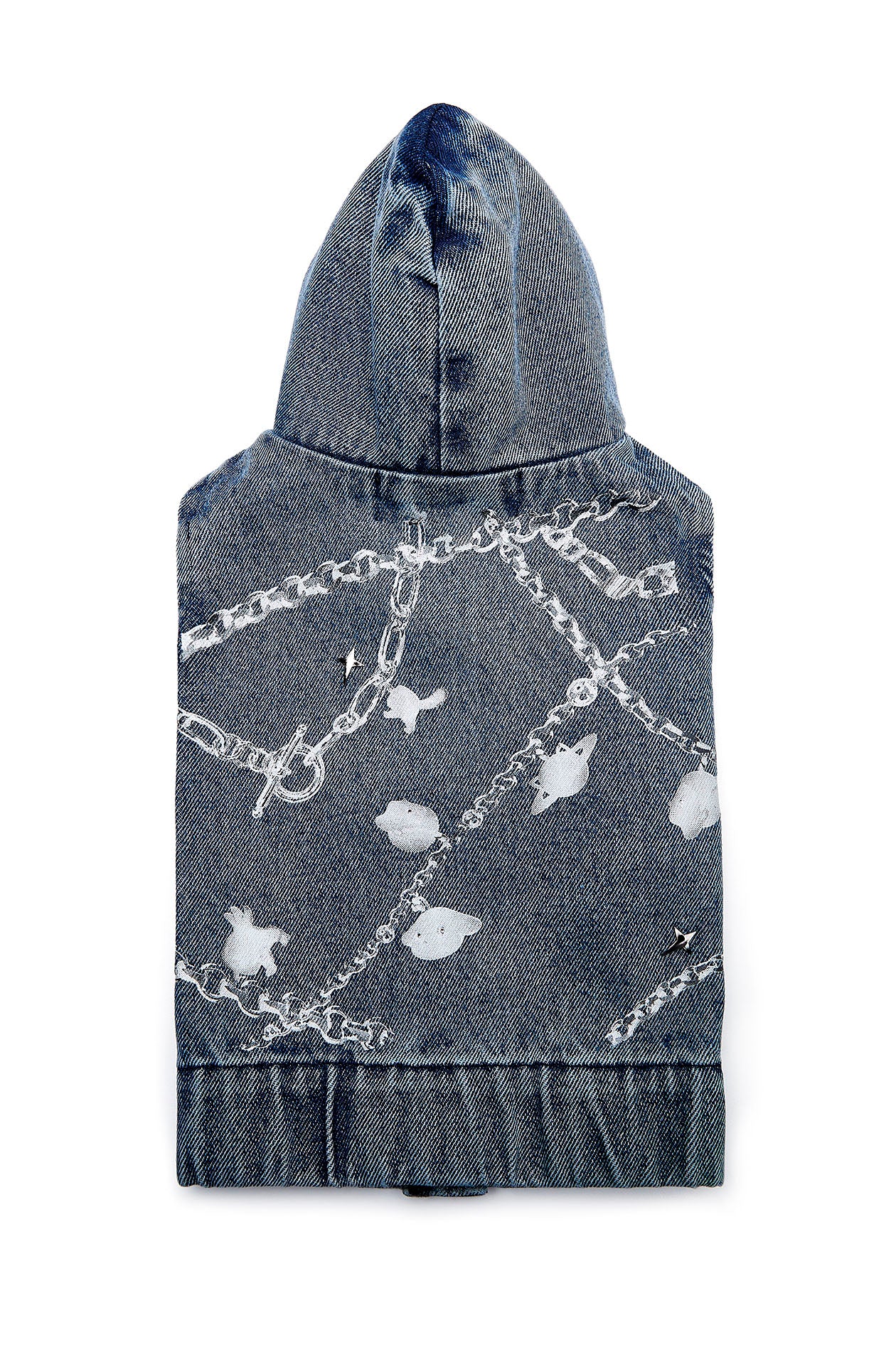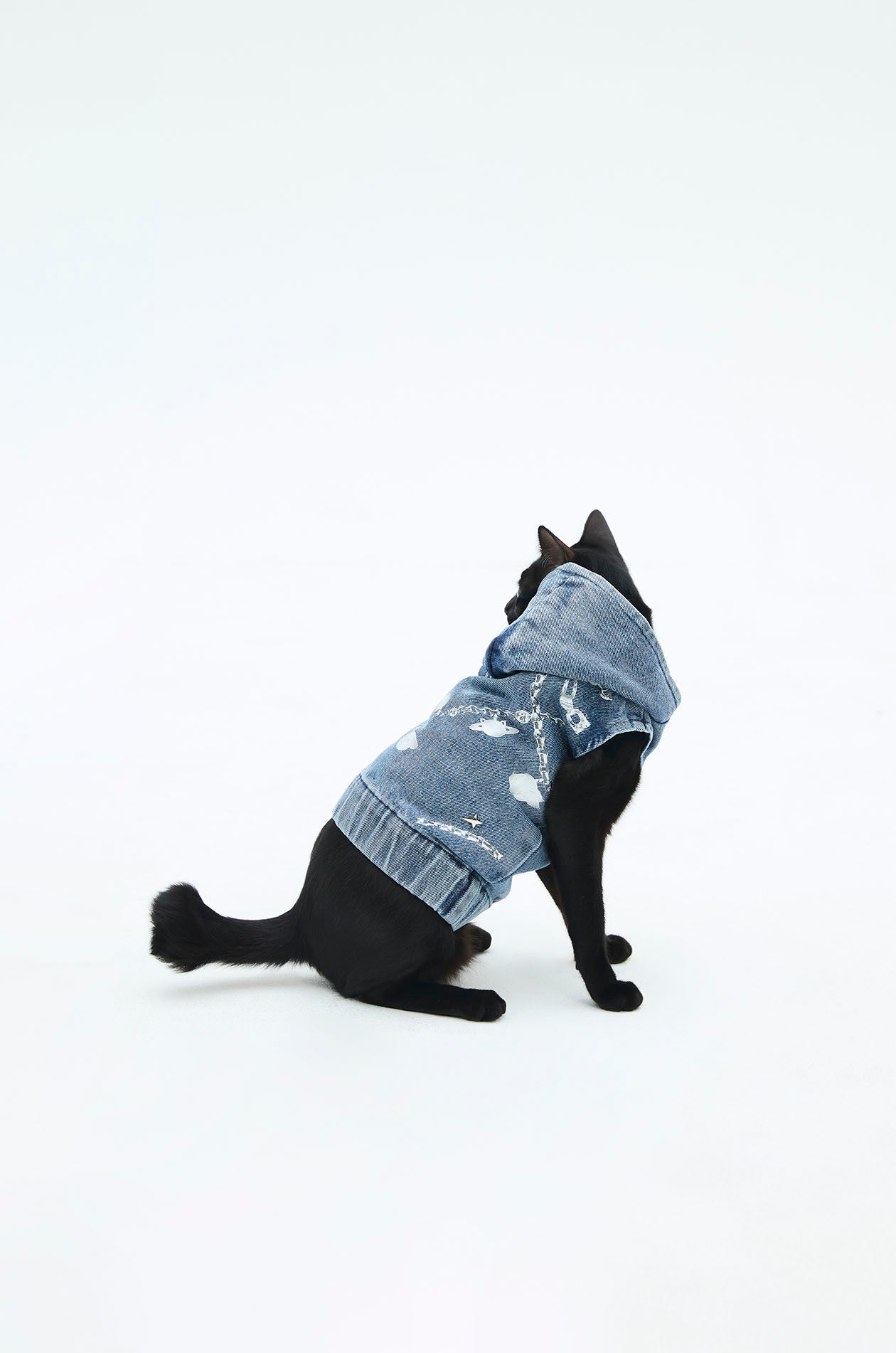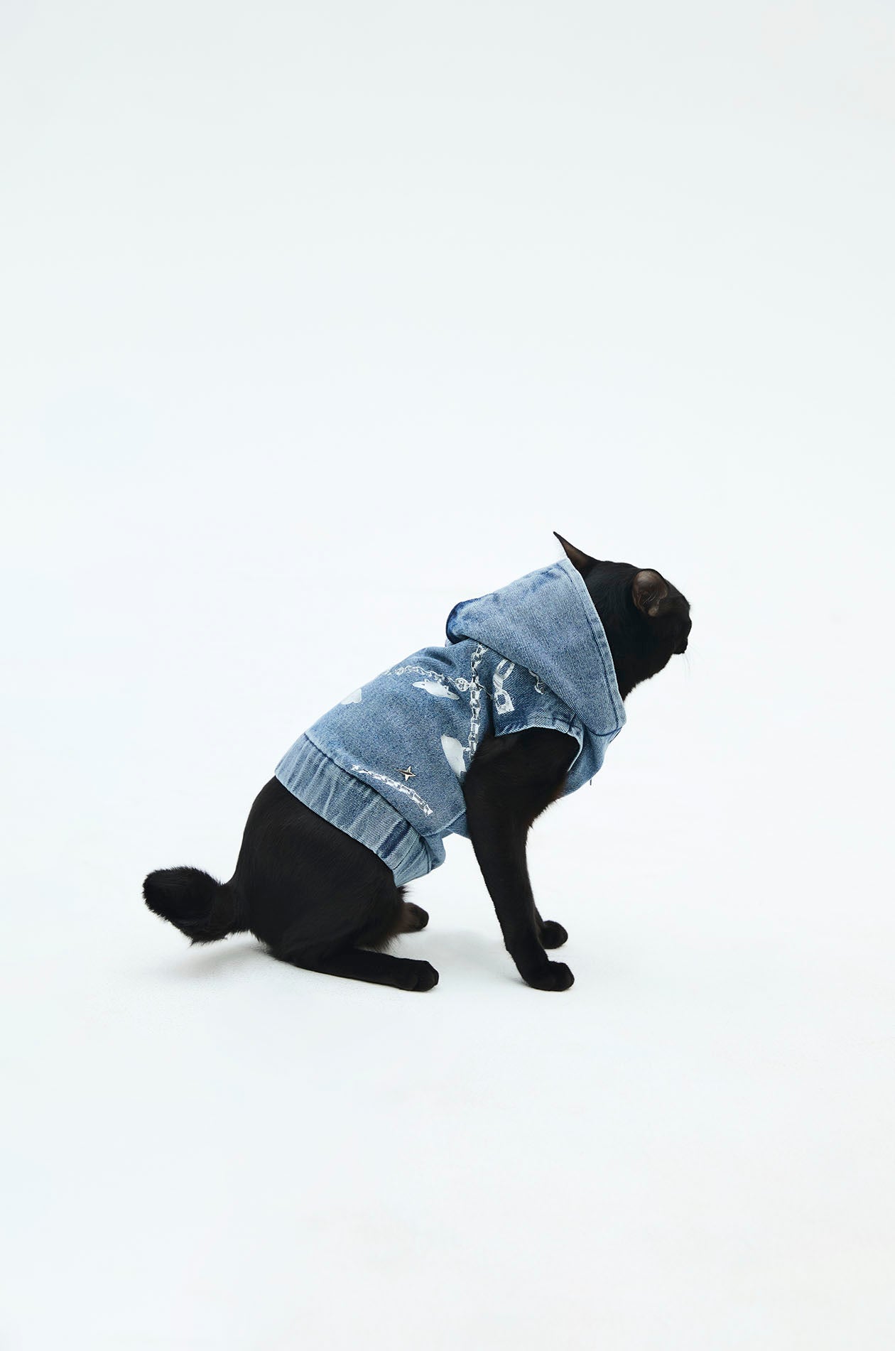 Gongkan x Jaspal | Pet hoodie in denim with washed effect. Showcasing Gongkan’s signature artwork. Available in blue.