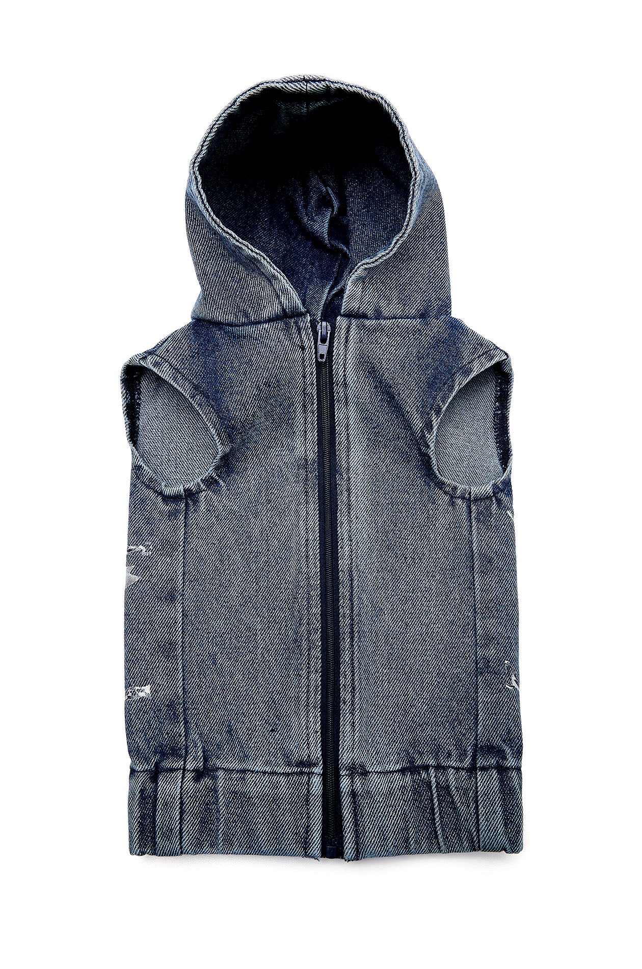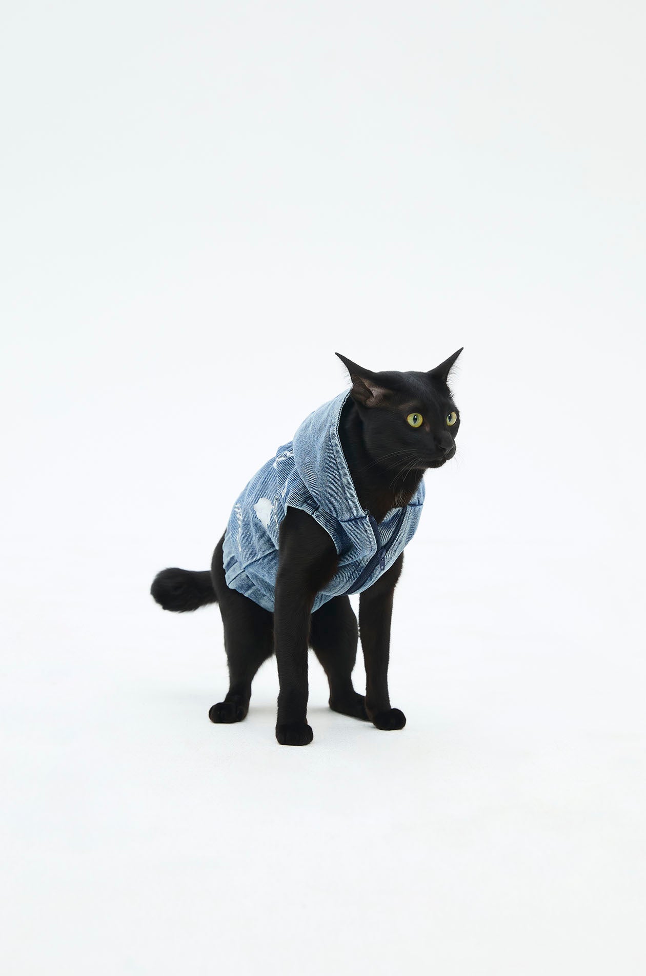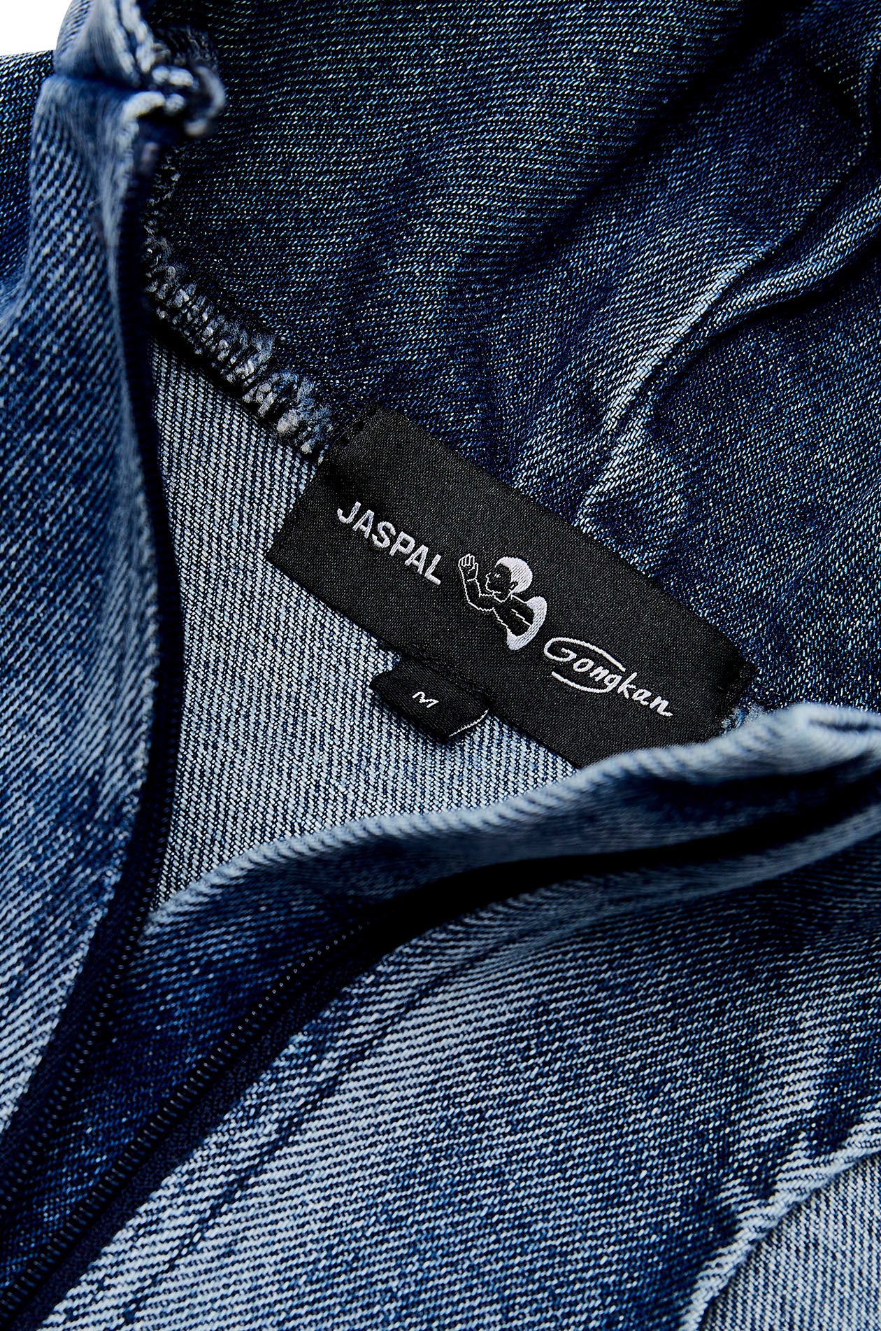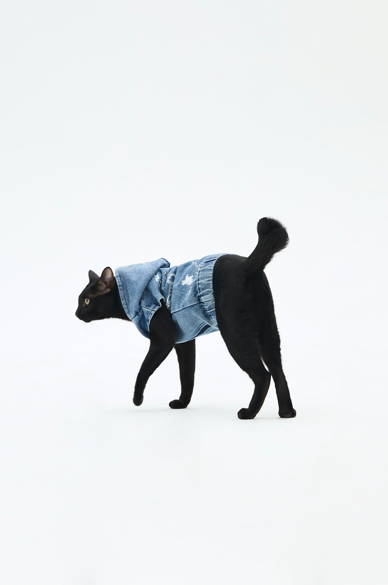 Gongkan x Jaspal | Pet hoodie in denim with washed effect. Showcasing Gongkan’s signature artwork. Available in blue.