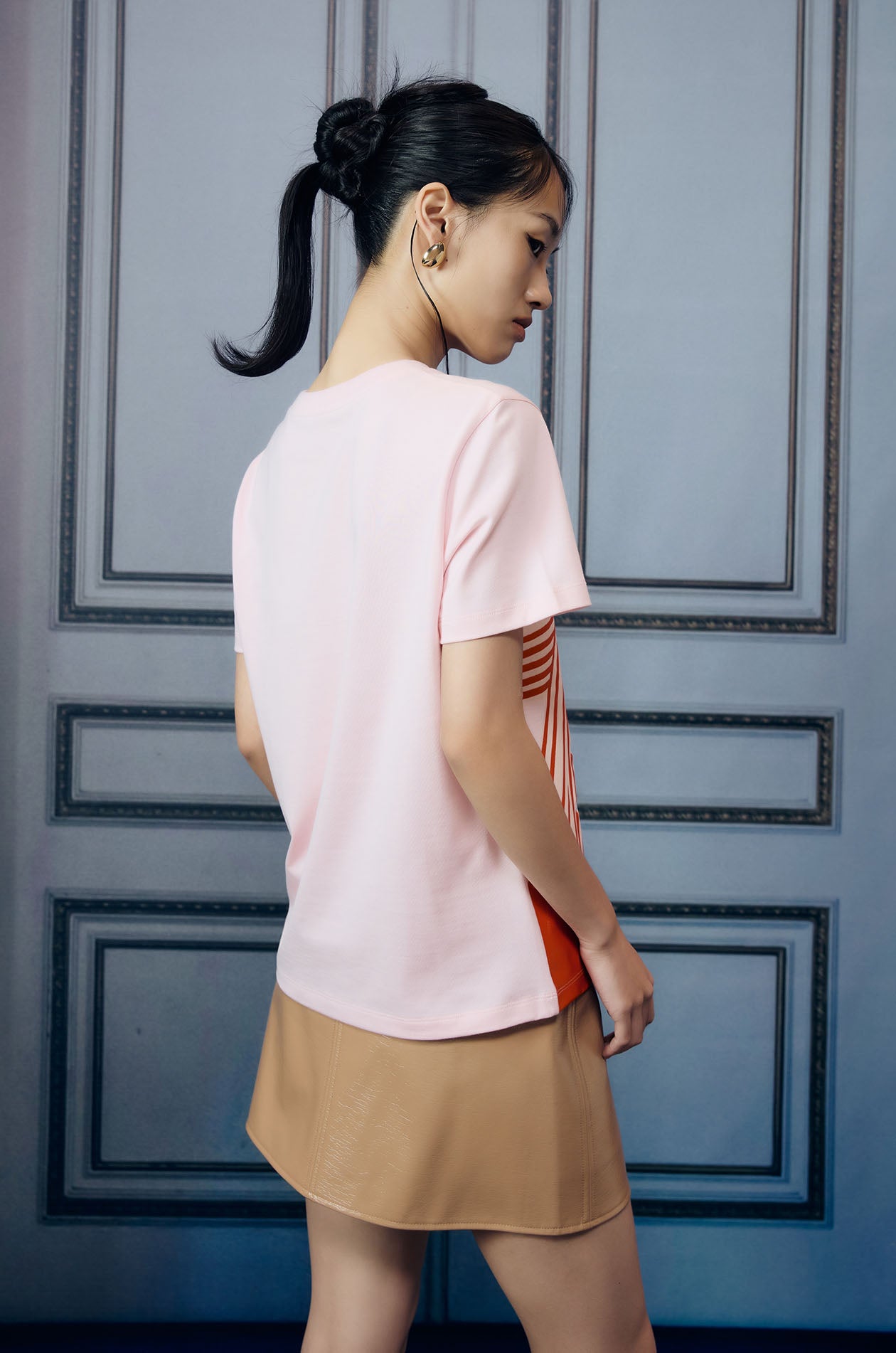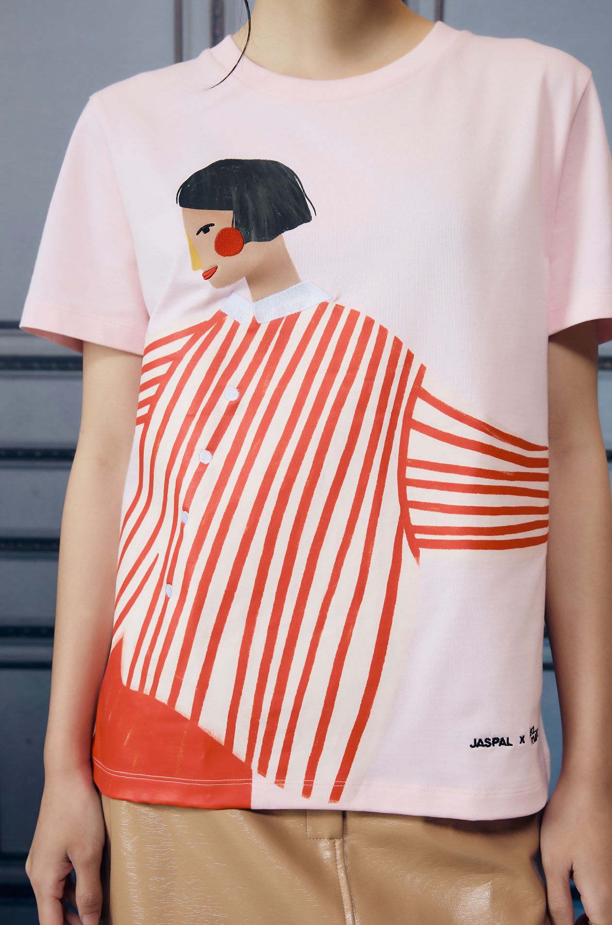 Jaspal X Bea Müller | Short-sleeved T-shirt in cotton jersey. Designed with a regular fit and straight cut, featuring a classic round neckline and Bea Müller’s signature artwork 'The Happy Woman' rendered through a mix of print and embroidery, blending artistic expression with everyday ease. Available in pink.