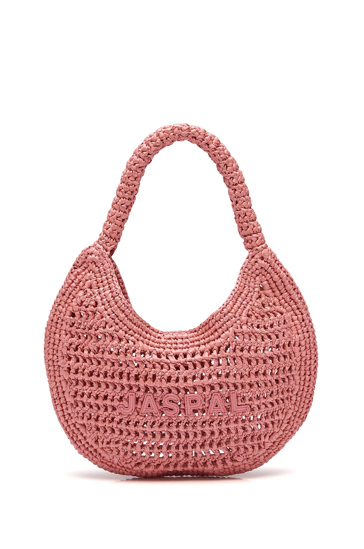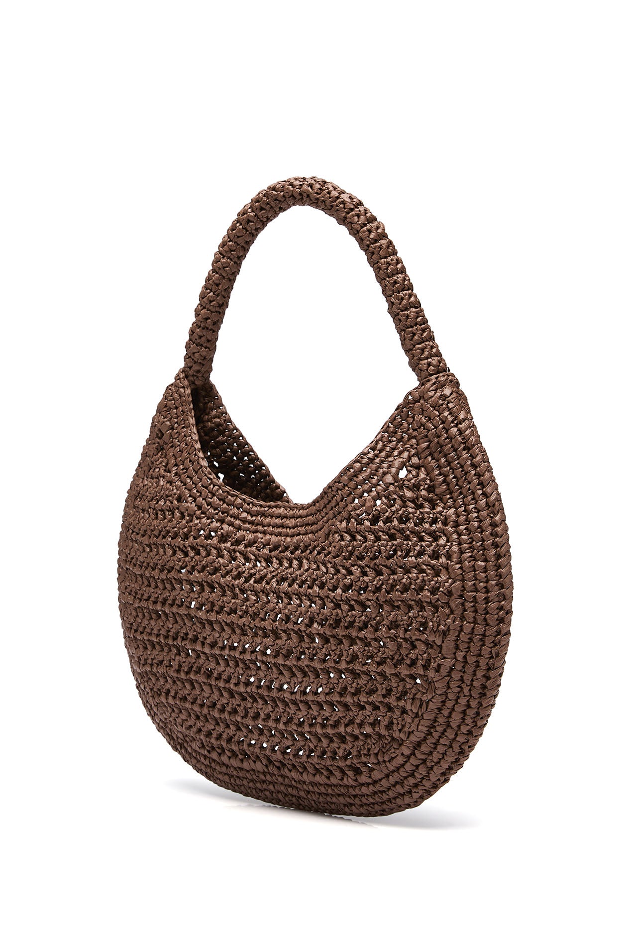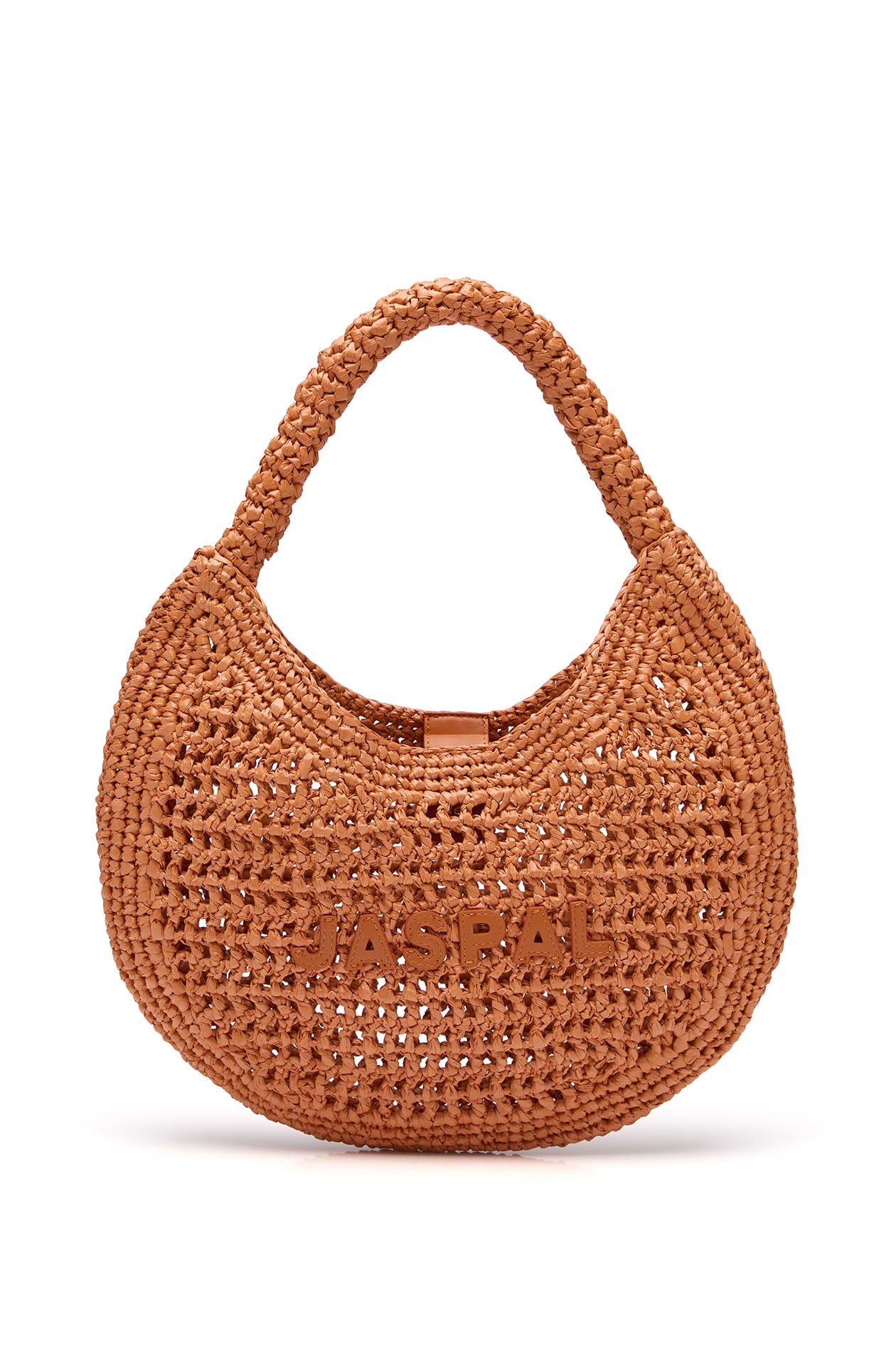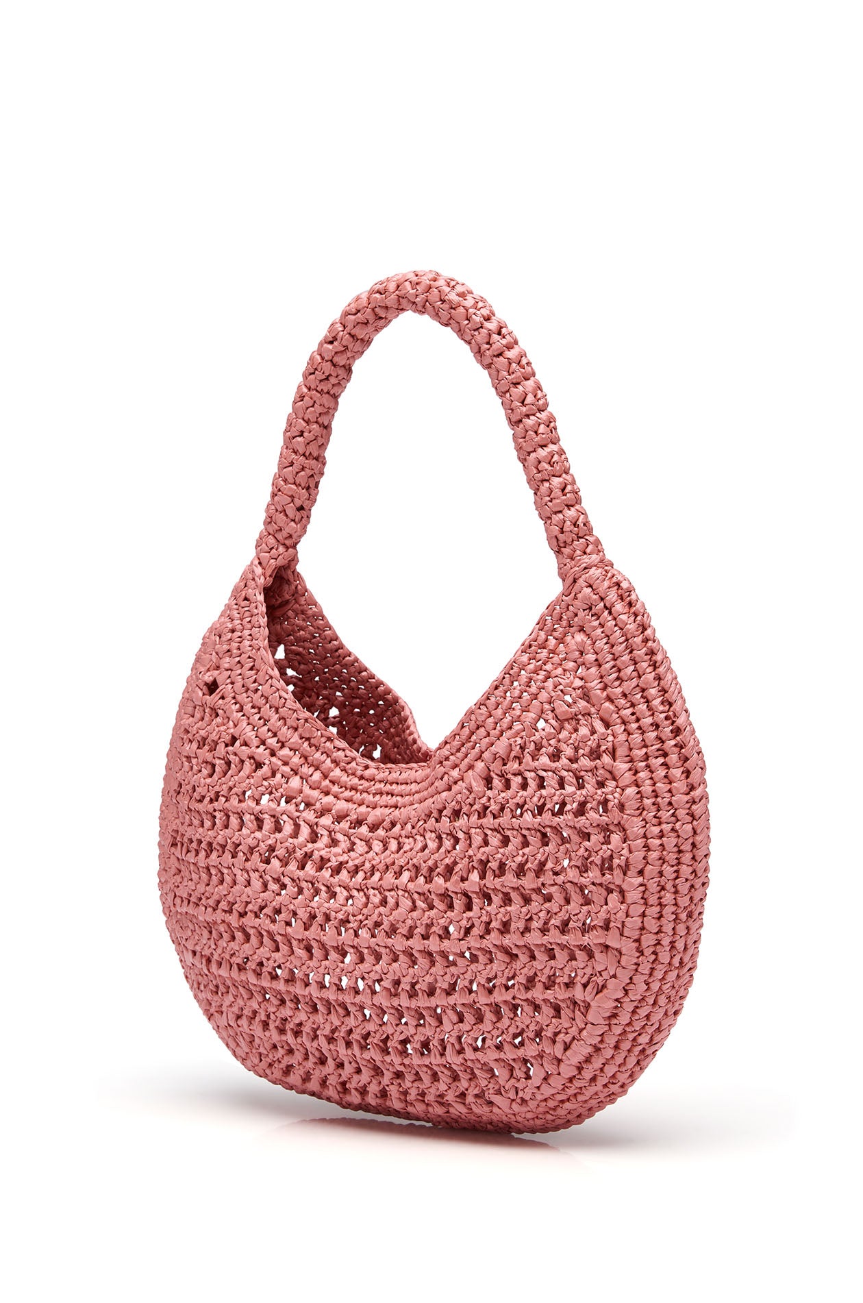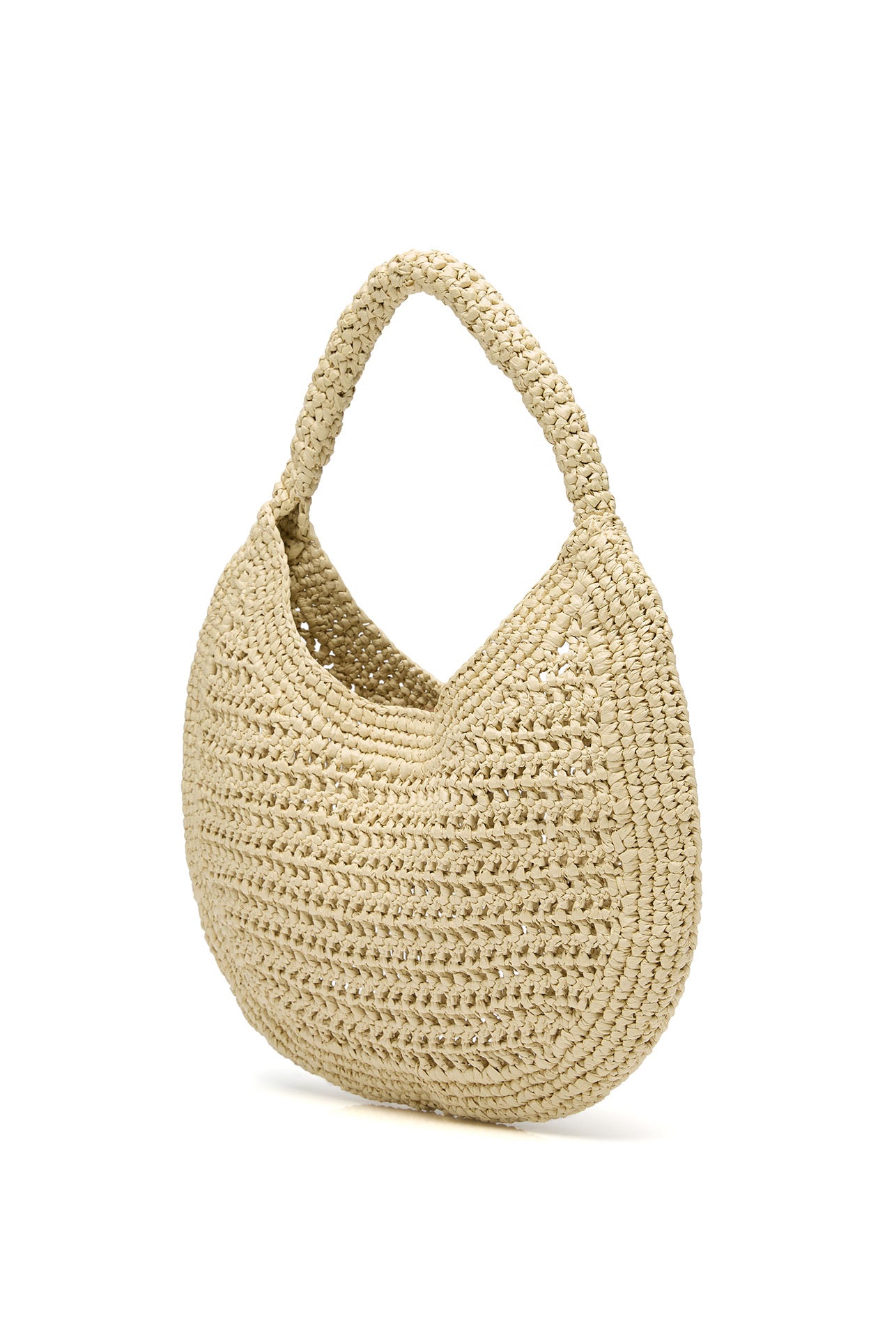 Shoulder bag crafted from faux raffia in a soft teardrop shape. Designed with an open, textured weave and a comfortable top handle, offering a lightweight feel and relaxed summer styling. Available in beige, brown, orange, pink, and green.