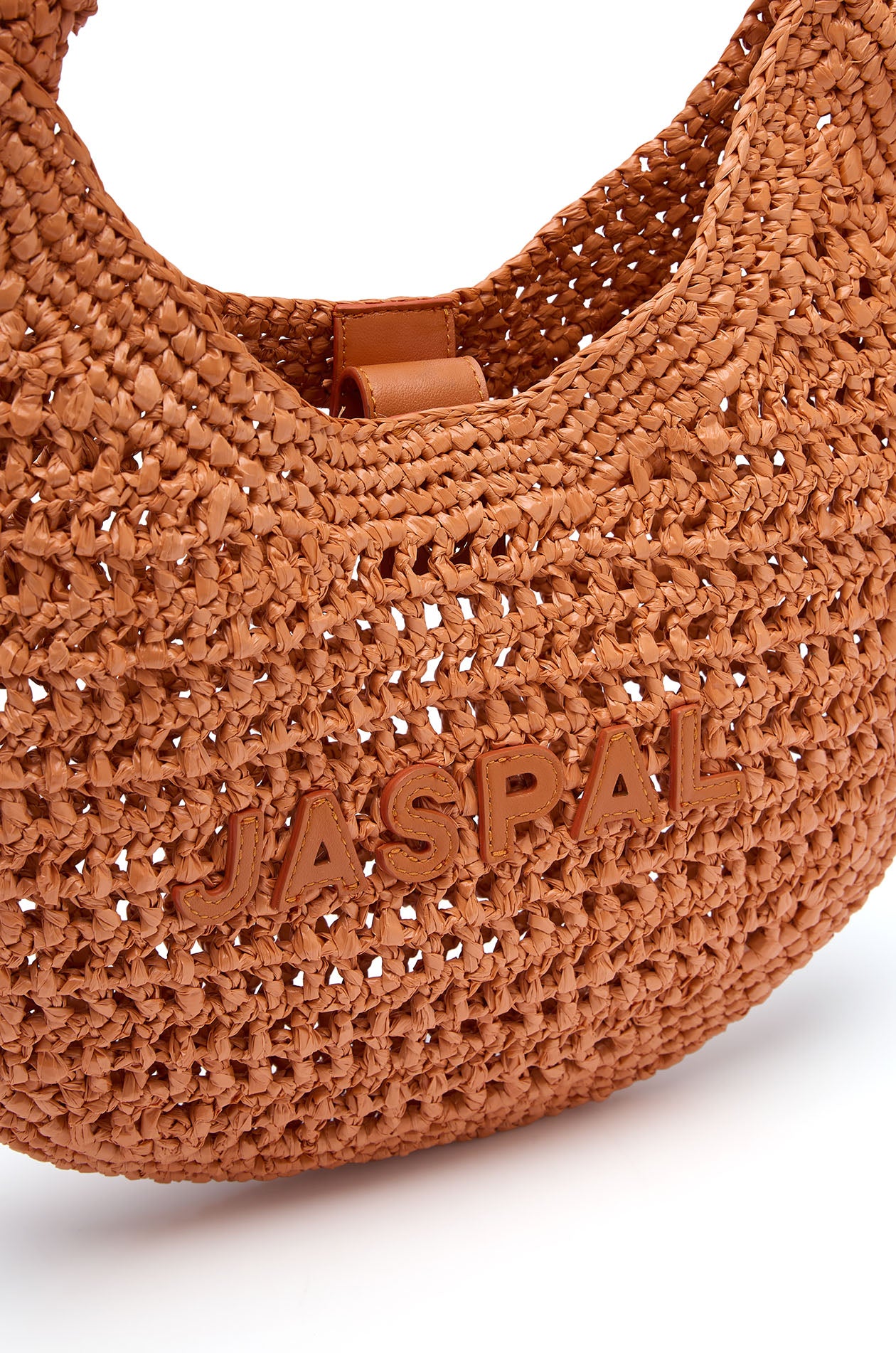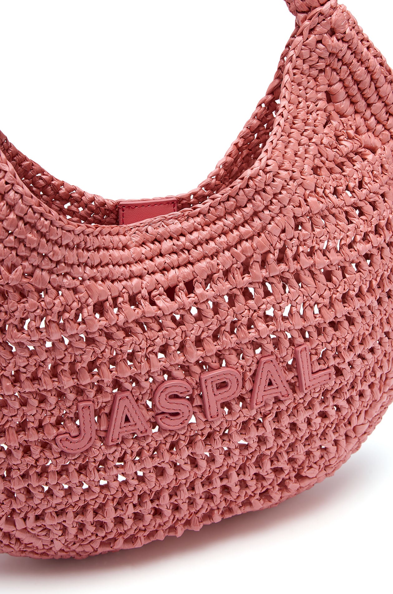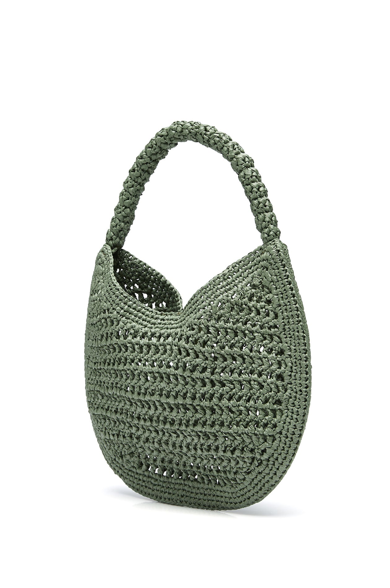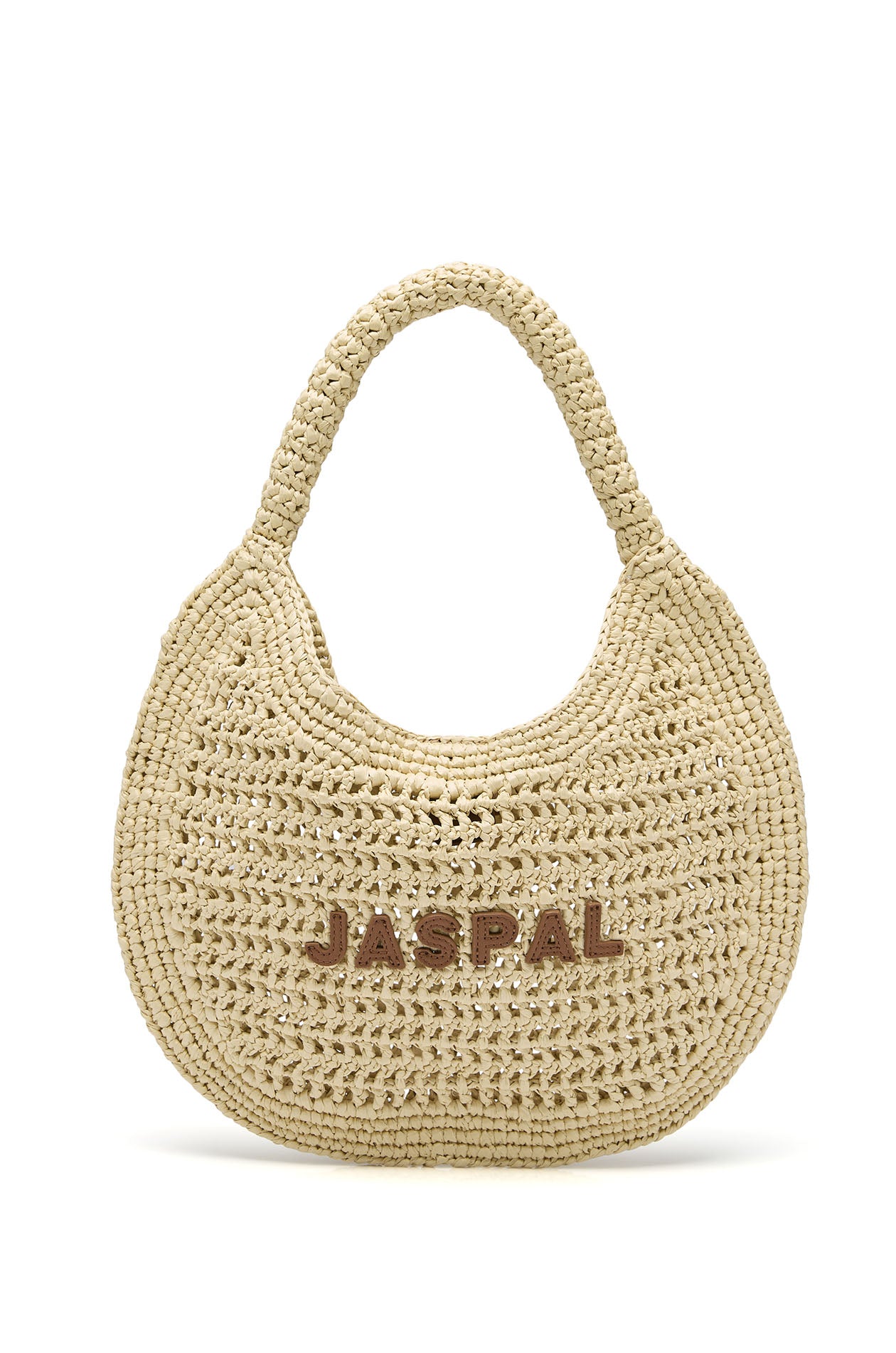 Shoulder bag crafted from faux raffia in a soft teardrop shape. Designed with an open, textured weave and a comfortable top handle, offering a lightweight feel and relaxed summer styling. Available in beige, brown, orange, pink, and green.