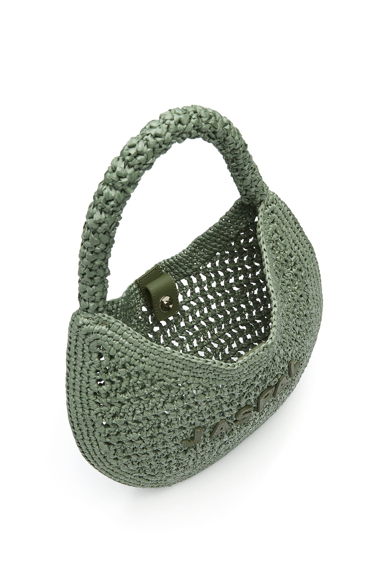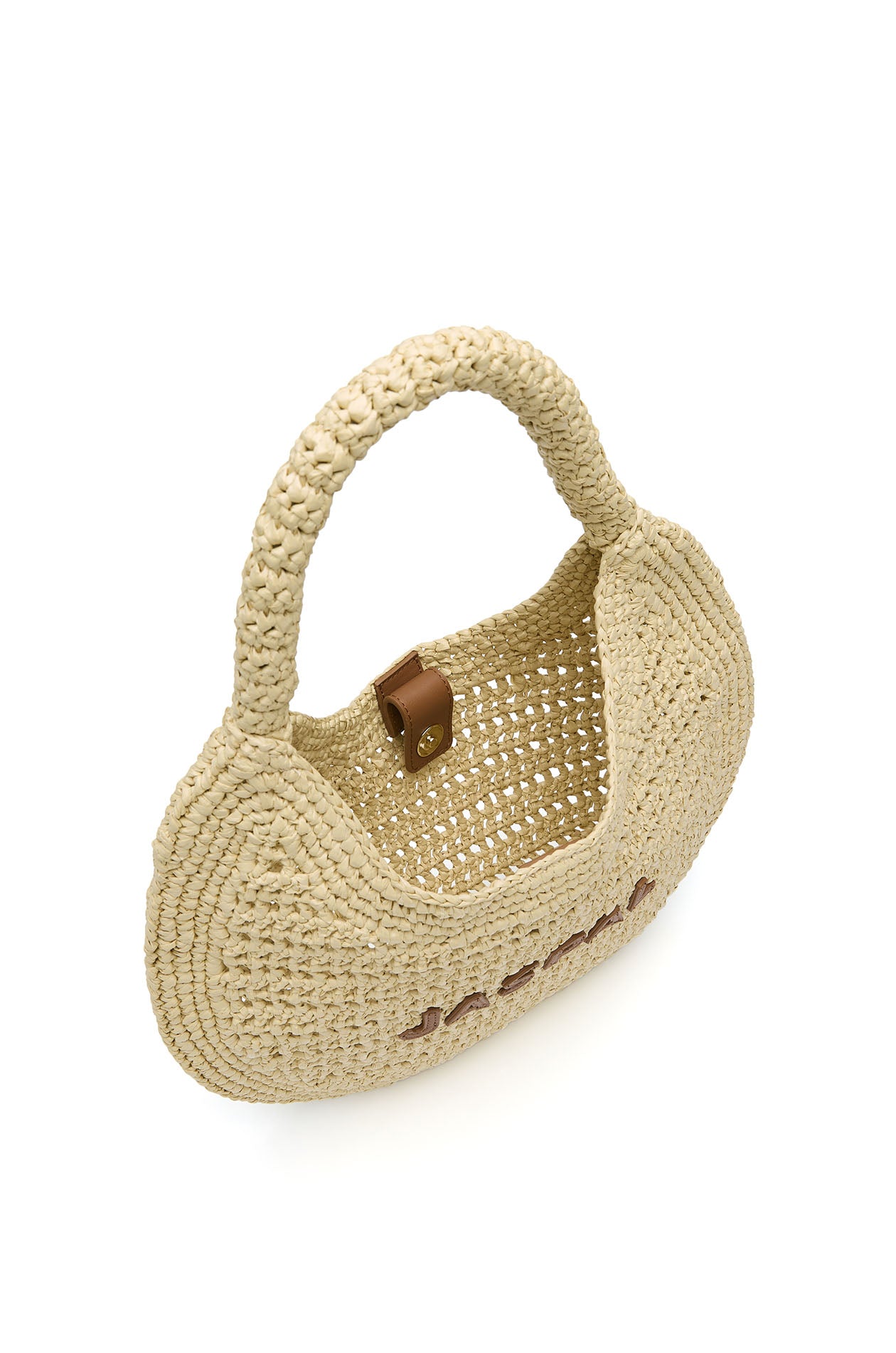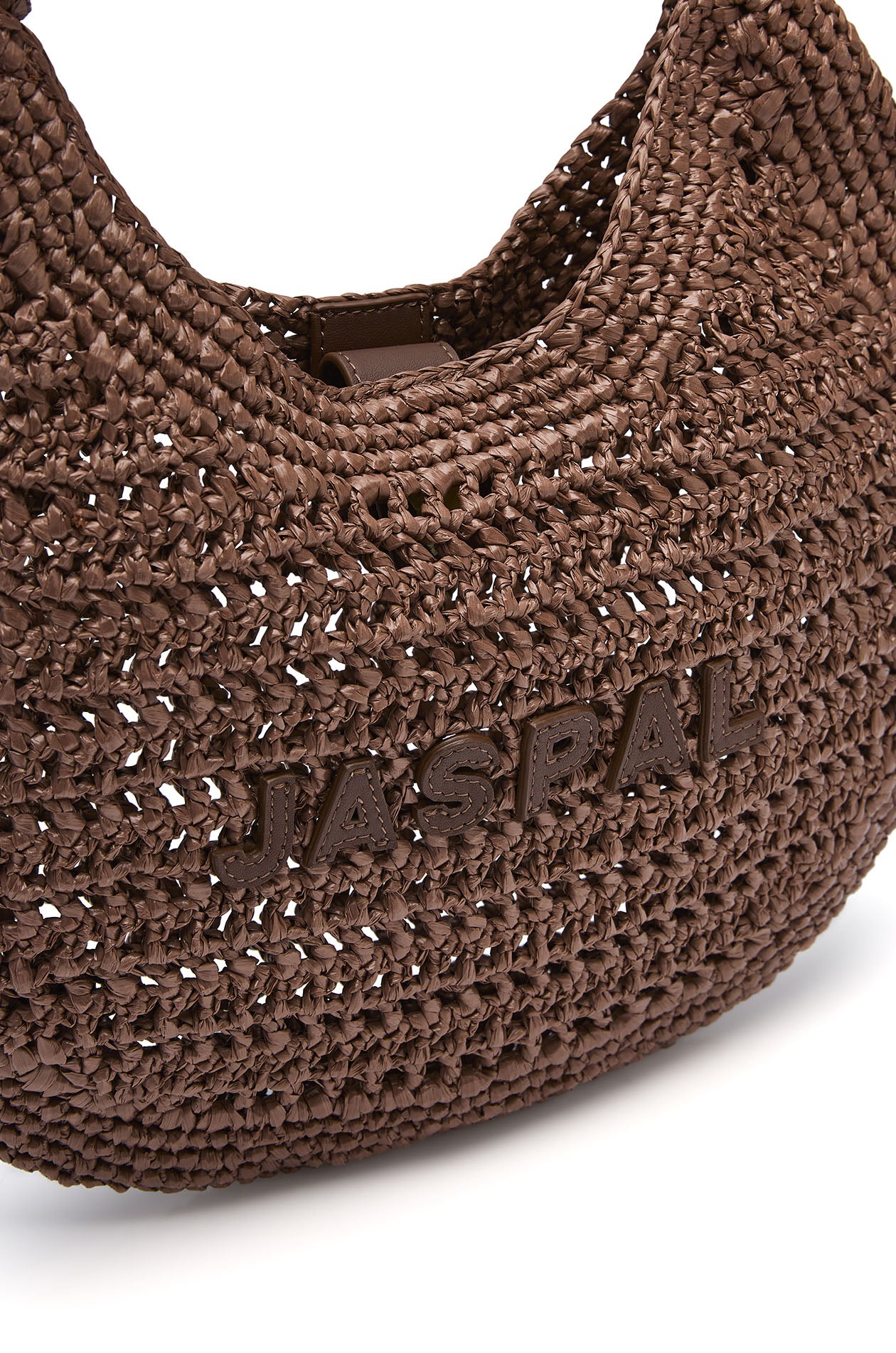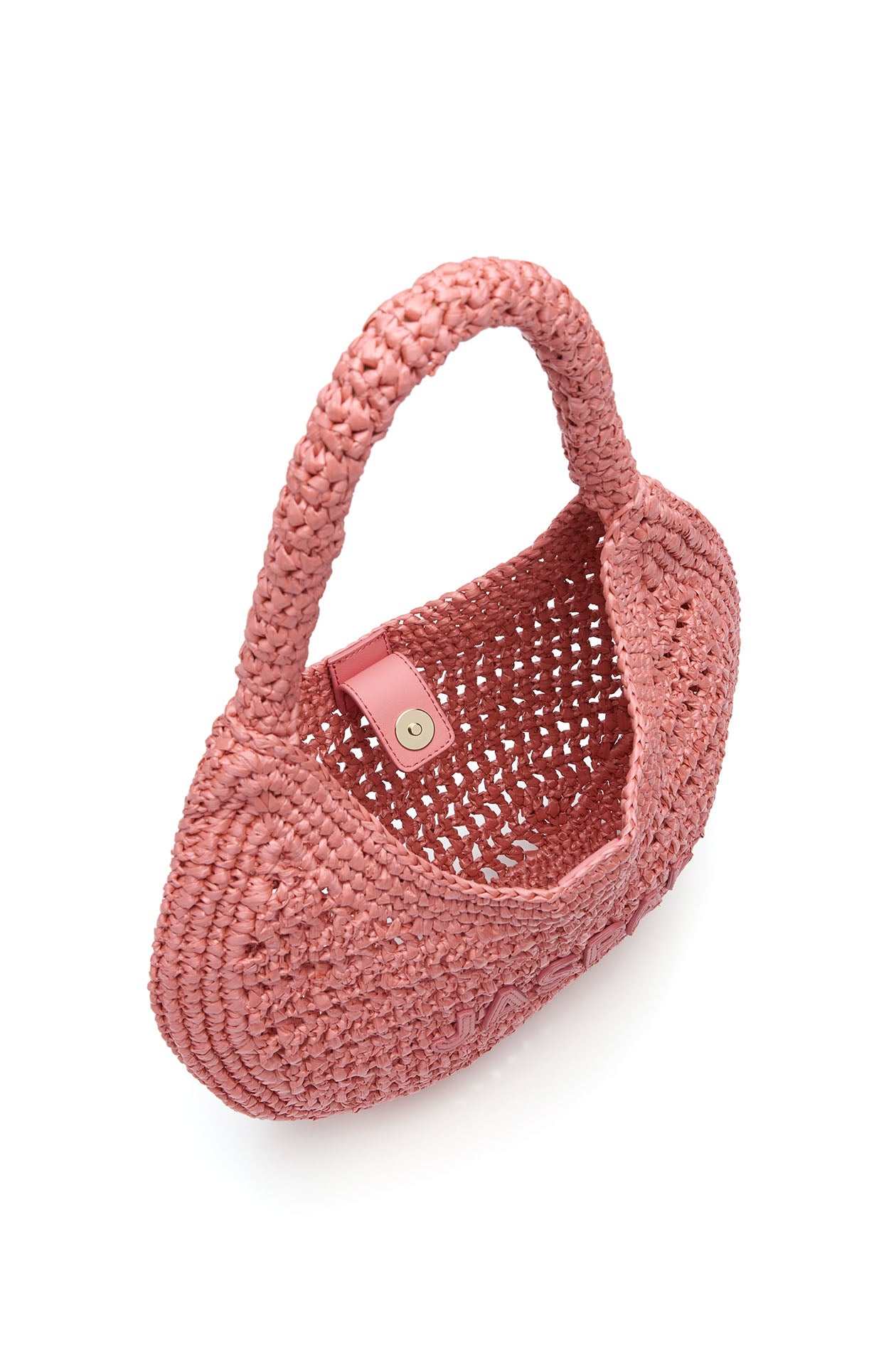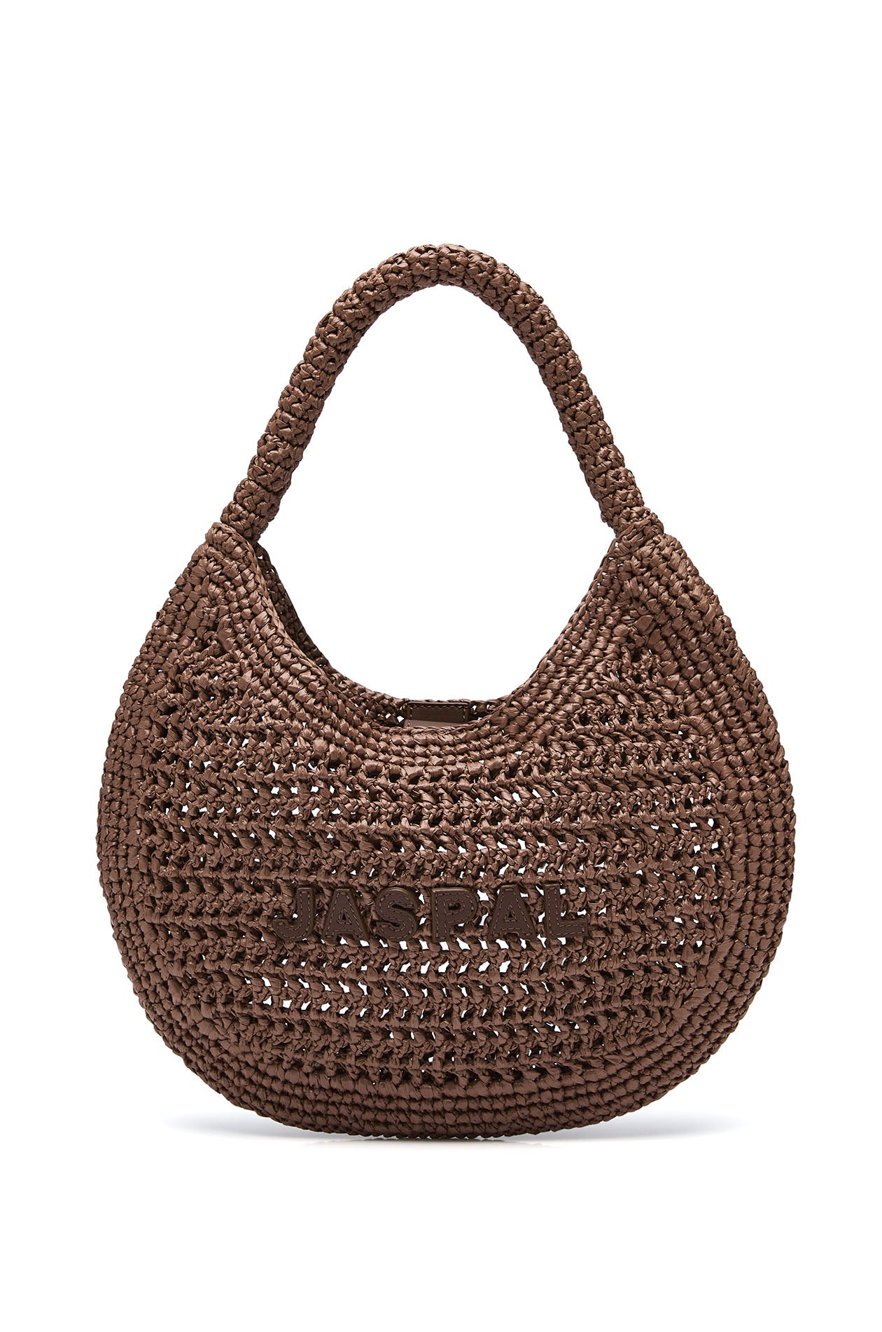 Shoulder bag crafted from faux raffia in a soft teardrop shape. Designed with an open, textured weave and a comfortable top handle, offering a lightweight feel and relaxed summer styling. Available in beige, brown, orange, pink, and green.
