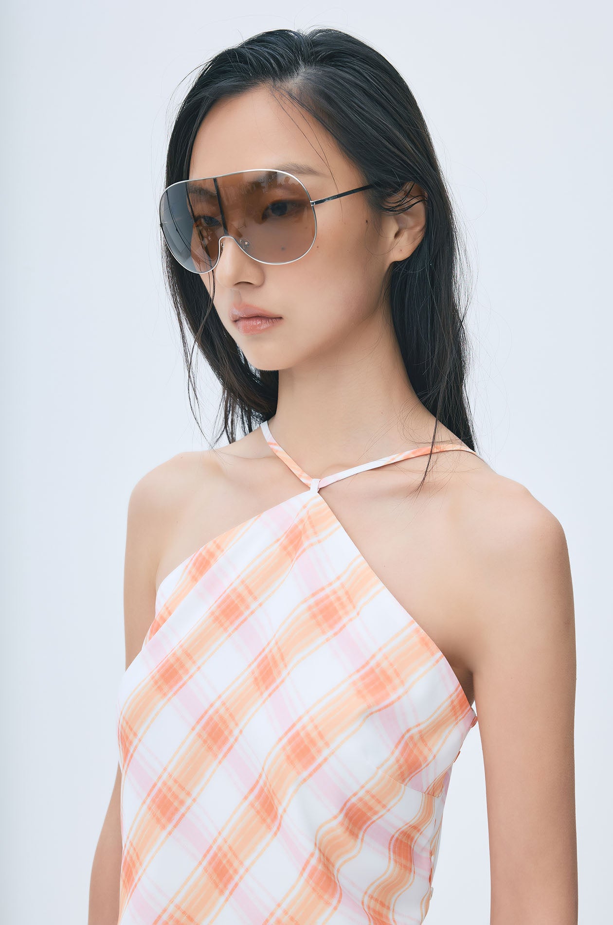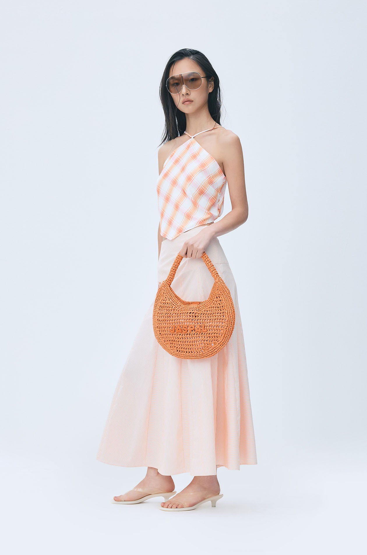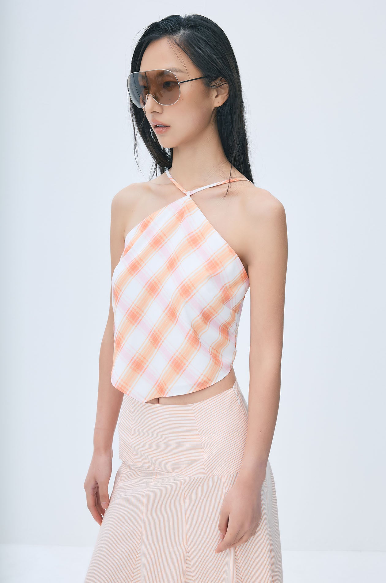 Scarf-style top crafted from a fluid silk-like fabric with a soft, elegant drape. Designed in a vibrant plaid pattern with delicate skinny straps and an open back finished with an adjustable tie closure. The pointed handkerchief hem that drapes naturally for an airy feel. Available in orange.