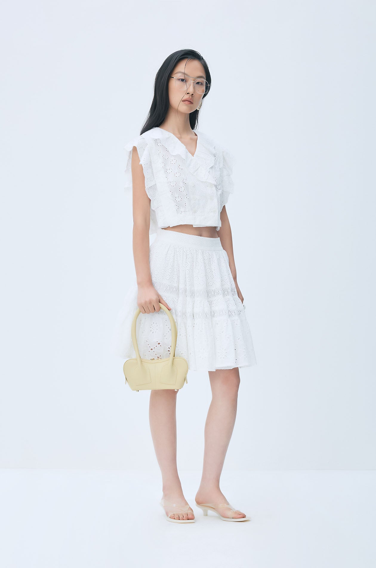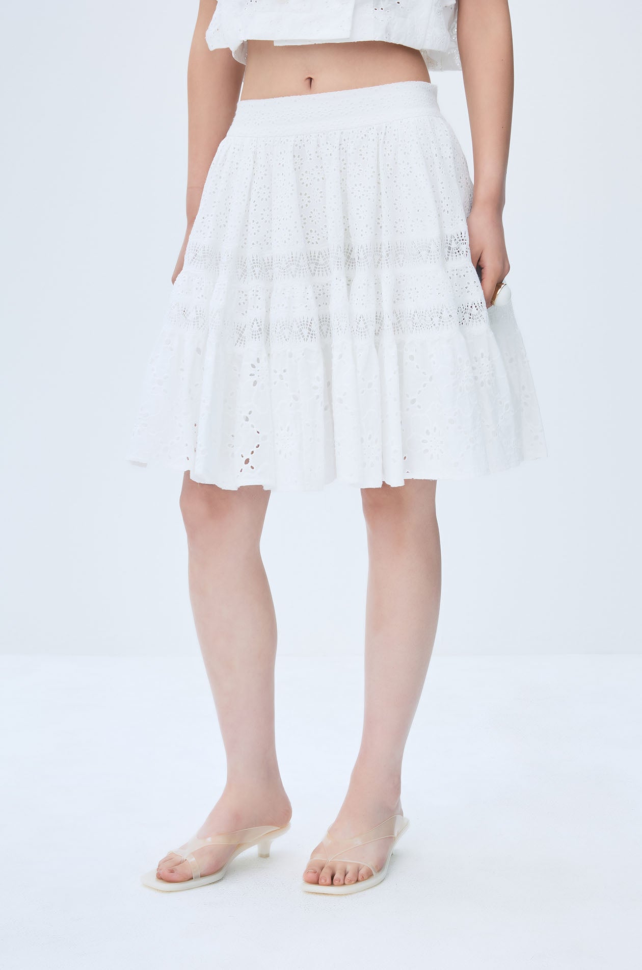 Mid-rise mini skirt crafted from delicate broderie anglaise fabric for a light, feminine texture. Designed with a comfortable elastic waistband and a softly flared silhouette, it features tiered panels finished with lace trims that add movement and dimension. The airy construction makes it a charming piece for warm-weather styling. Available in off-white.