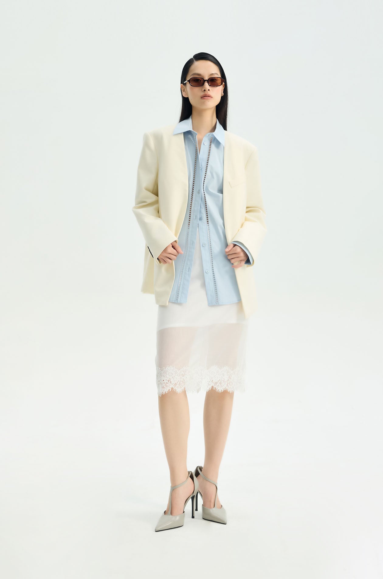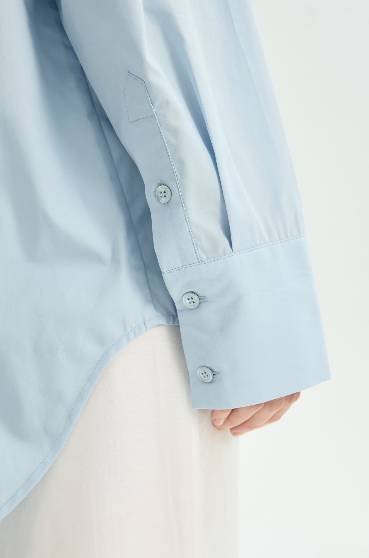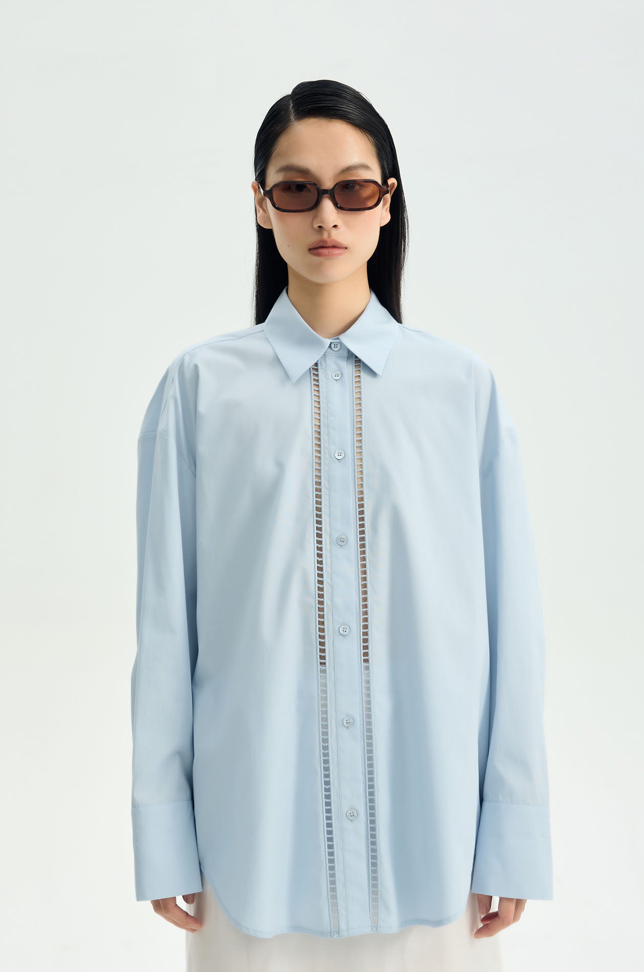 Long-sleeved shirt crafted from a smooth cotton–lyocell blend that offers a soft hand feel and fluid drape. Designed in an oversized fit with a classic collar and buttoned cuffs, it features a distinctive Jaspal palm motif embroidered cutwork across the back, adding a decorative and breathable detail to the clean, modern profile. Available in blue.