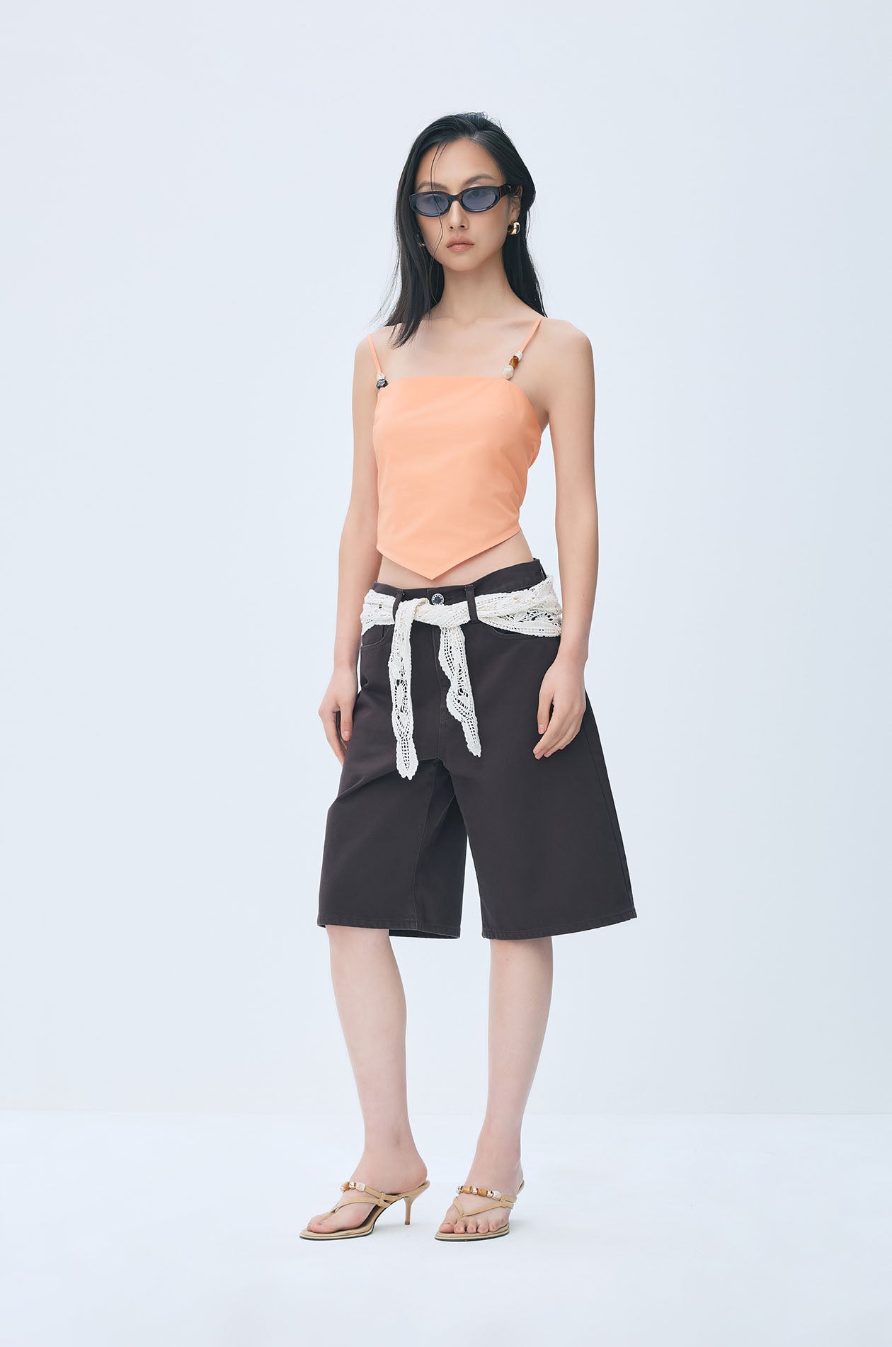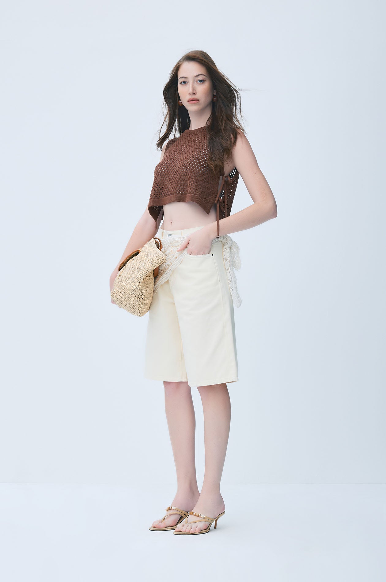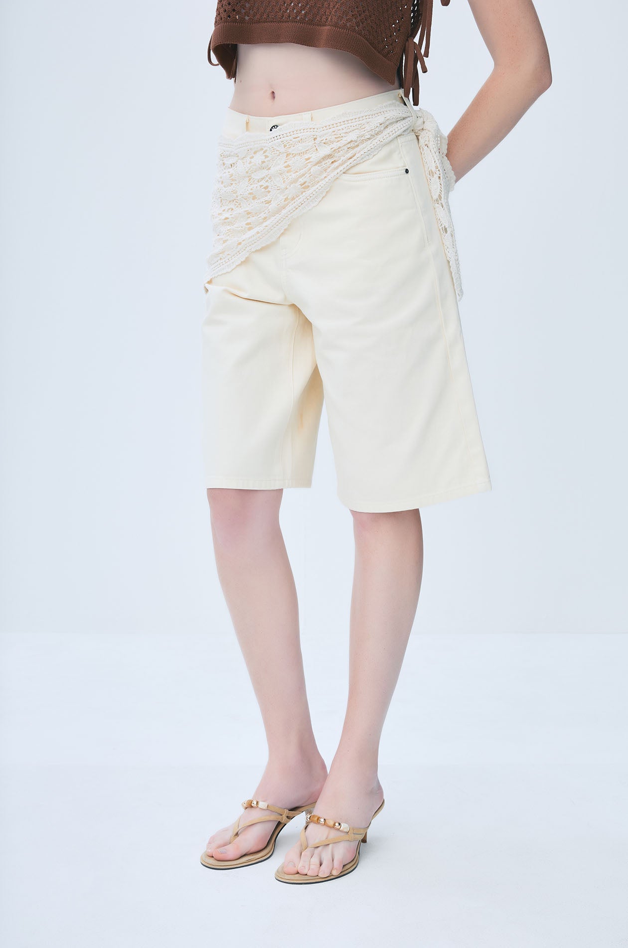Mid-rise Bermuda shorts crafted from sturdy cotton twill, designed with a relaxed fit and wide-leg silhouette for effortless everyday wear. The clean, structured shape is complemented by a detachable crochet scarf that ties around the waist, introducing a soft, decorative accent that contrasts with the shorts’ utilitarian character. Available in brown and yellow.