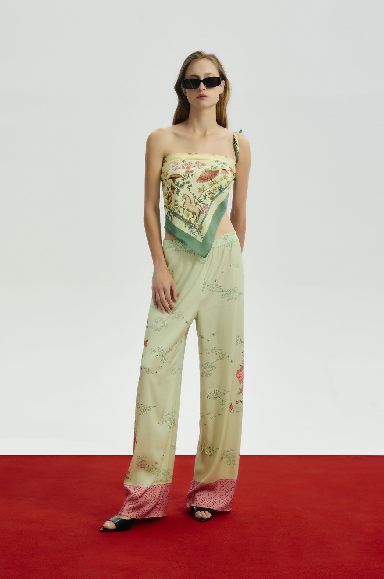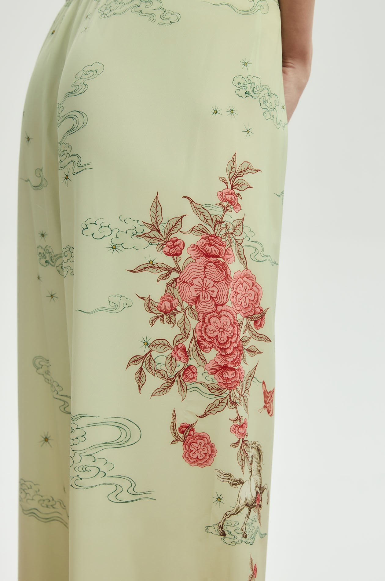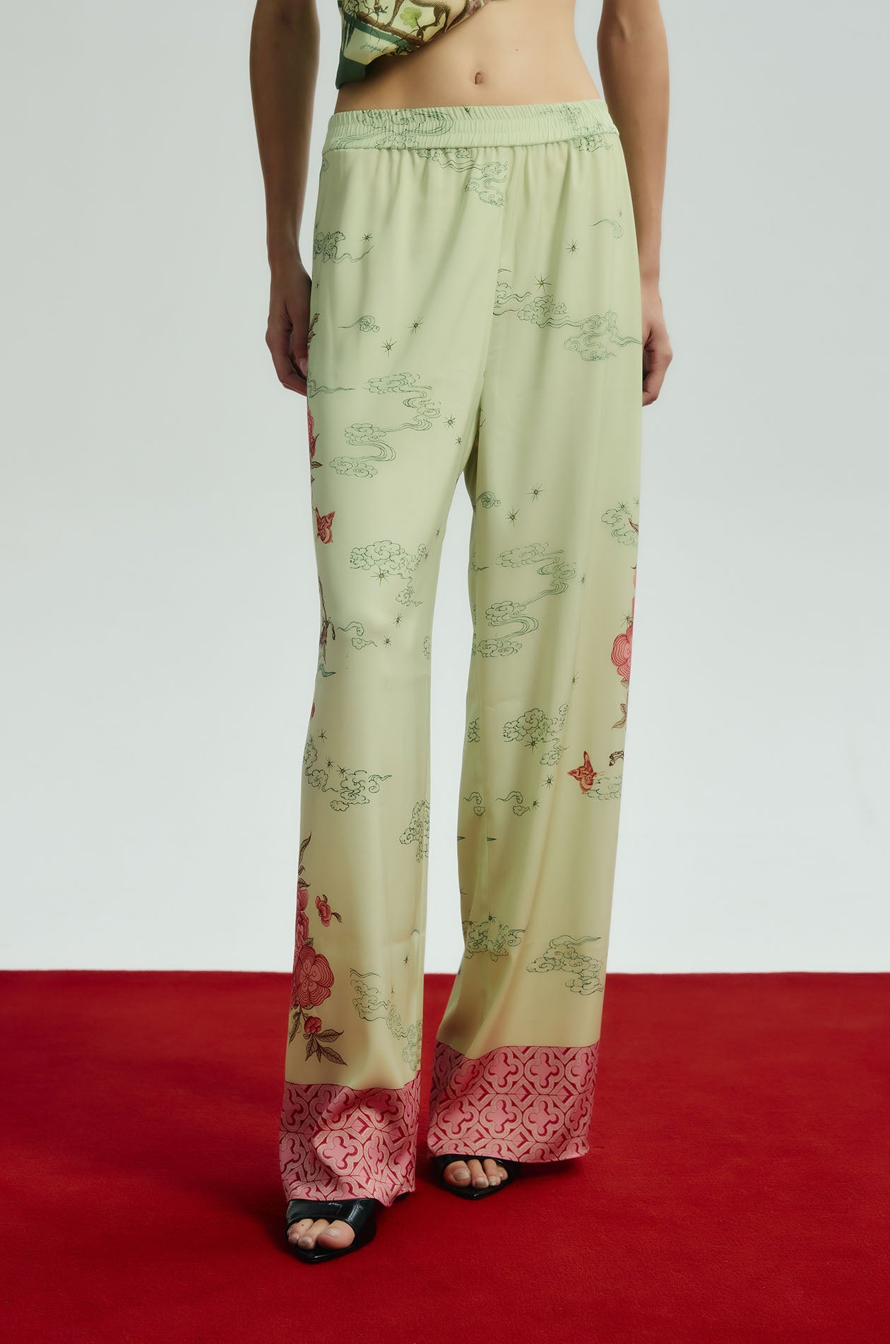 Jaspal x nussdaydream for Lunar New Year | Mid-rise easy pants in satin. Wide legs with Chinese-style floral print and Chinese patterned tiles edge. Elastic waistband and scales pattern at both hems. Available in Seedling Green.