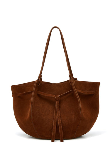 Handbag in suede with suede ribbon detail. Curve shape with matching straps. Available in beige and brown.