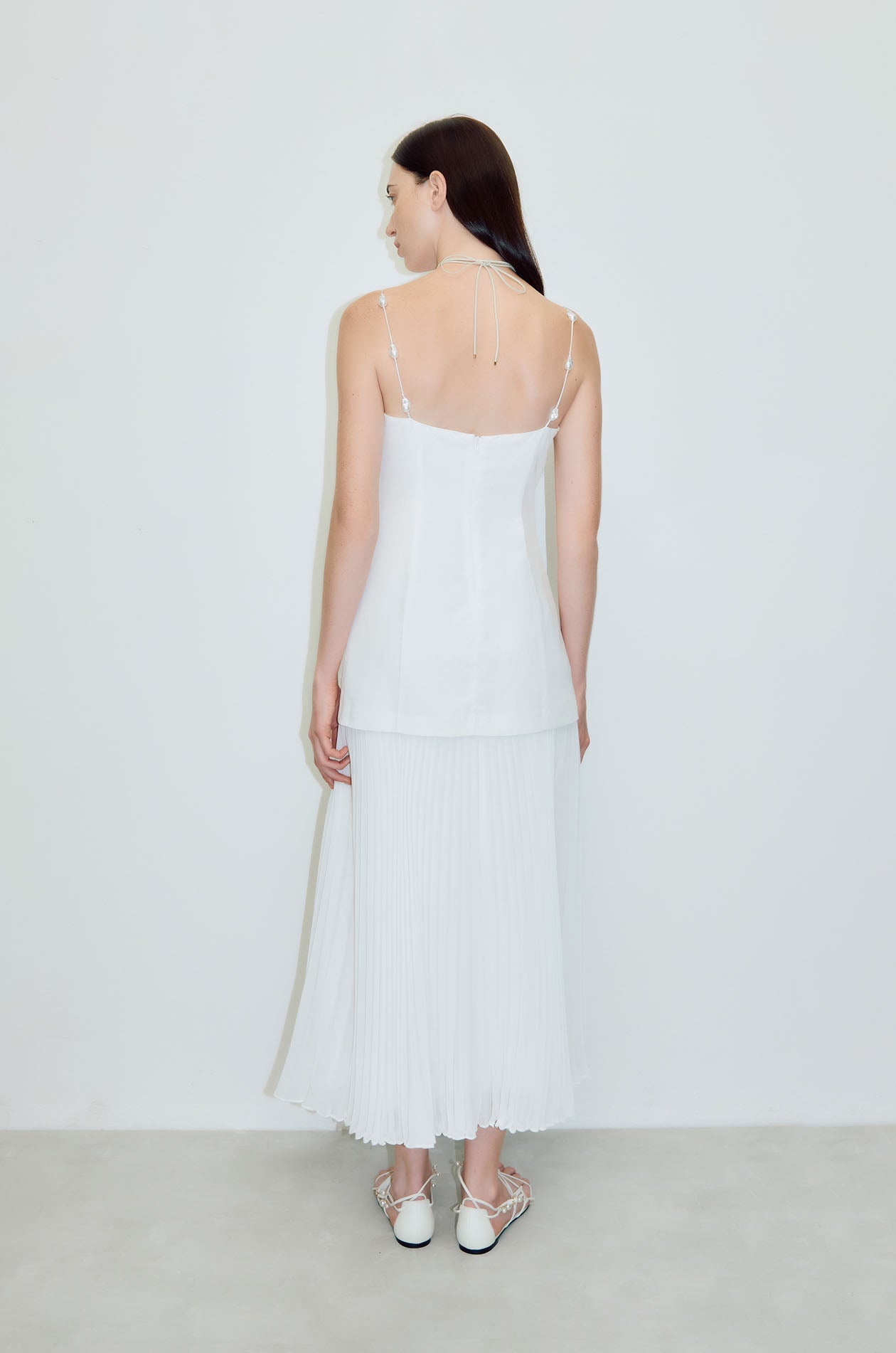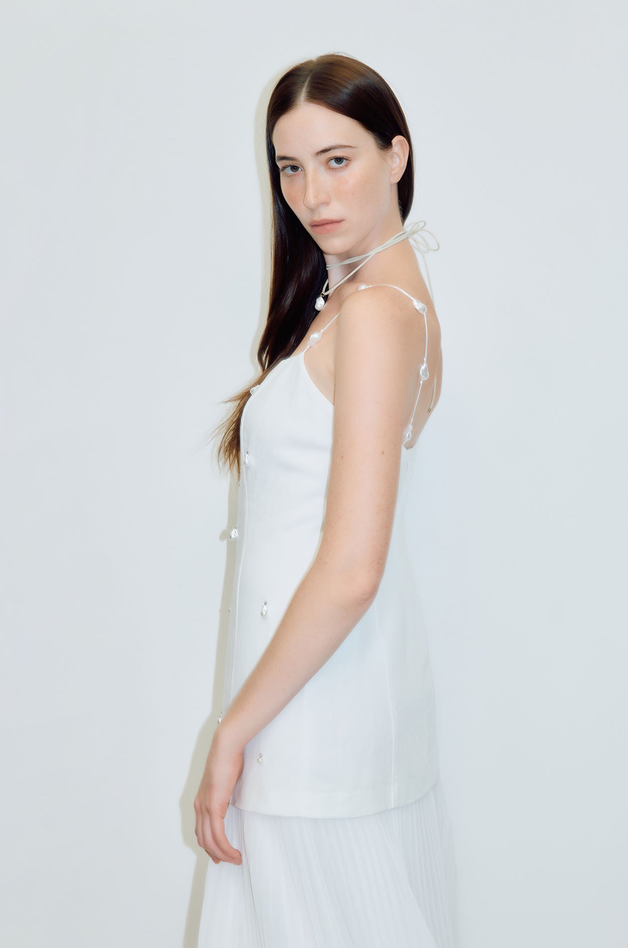 Jaspal Edit x Pacharee | strappy maxi dress crafted from a lyocell–linen blend for a light, breathable feel. Designed with a drop-waist silhouette, featuring pearl bead embellishment and a softly fluttering skirt for subtle movement. Finished with spaghetti pearl bead straps. Available in white.