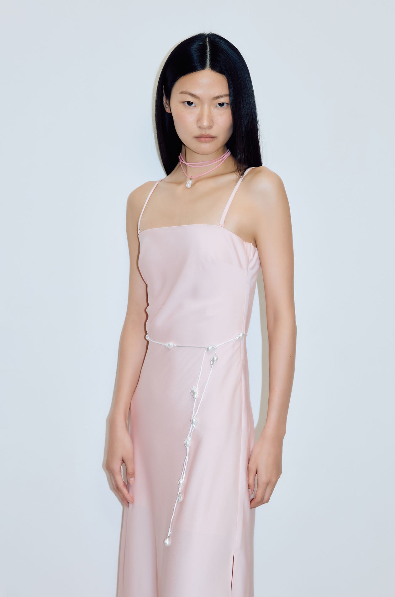 Jaspal Edit x Pacharee | Strapless maxi dress crafted from lightweight fabric for a fluid, elongated finish. Designed in a sleek sheath silhouette with a clean, straight neckline, accented by a pearl bead rope belt. Available in soft pink.