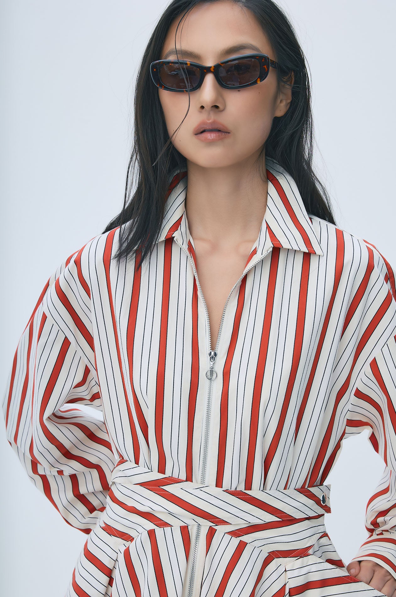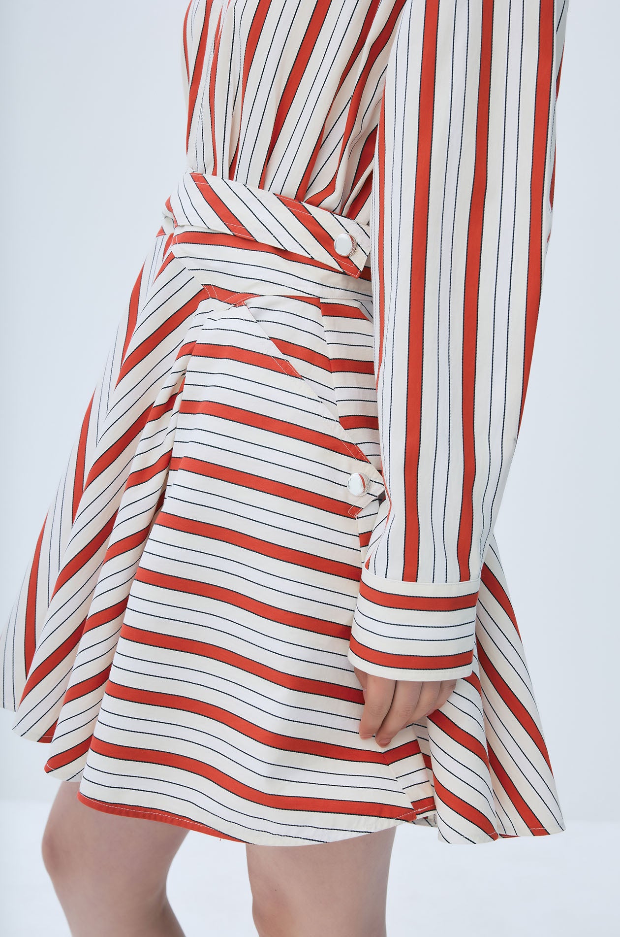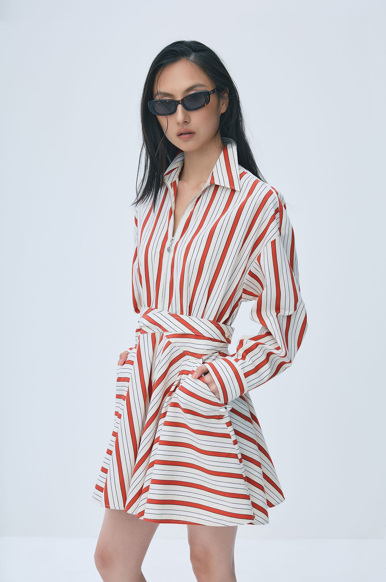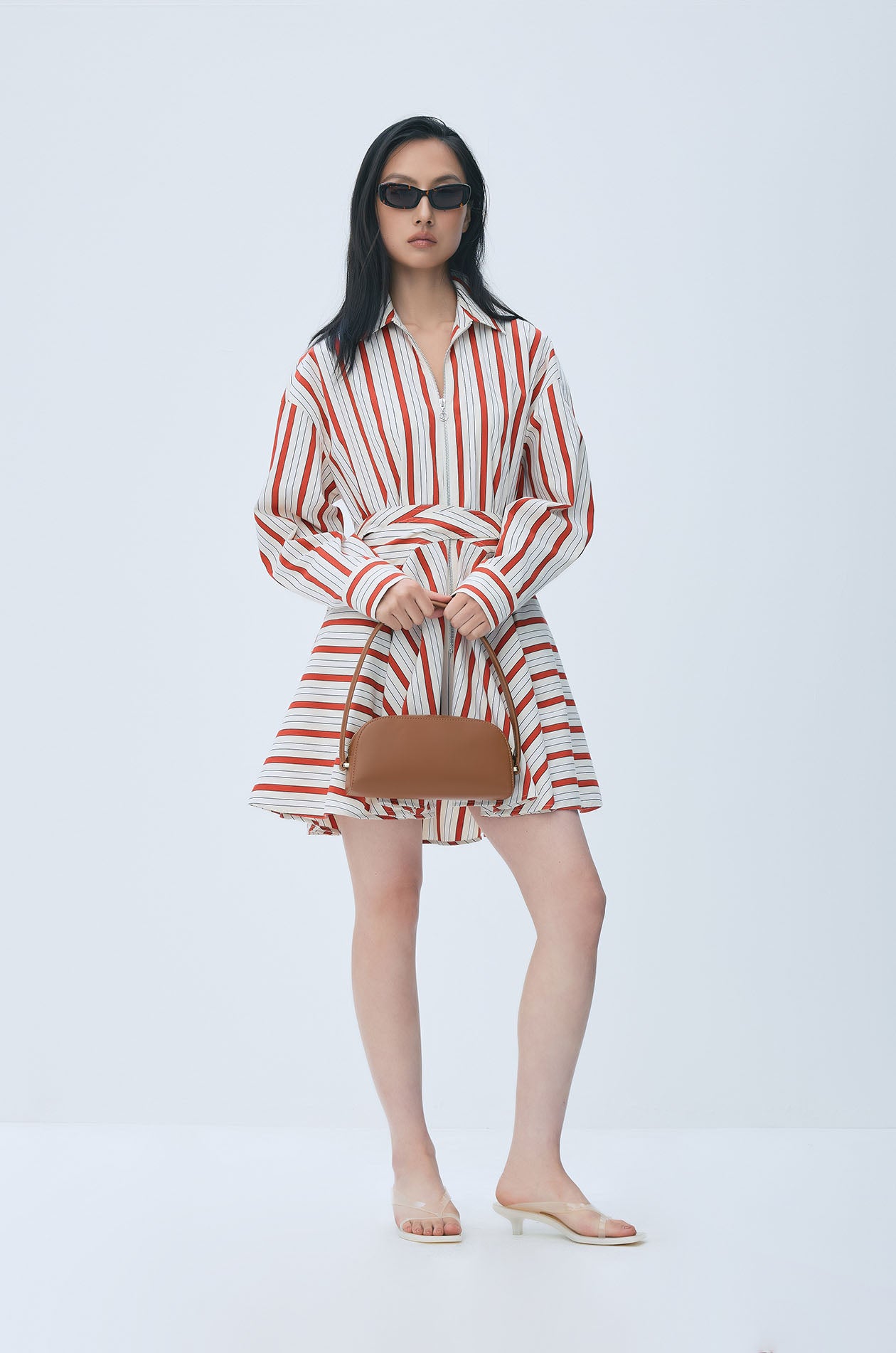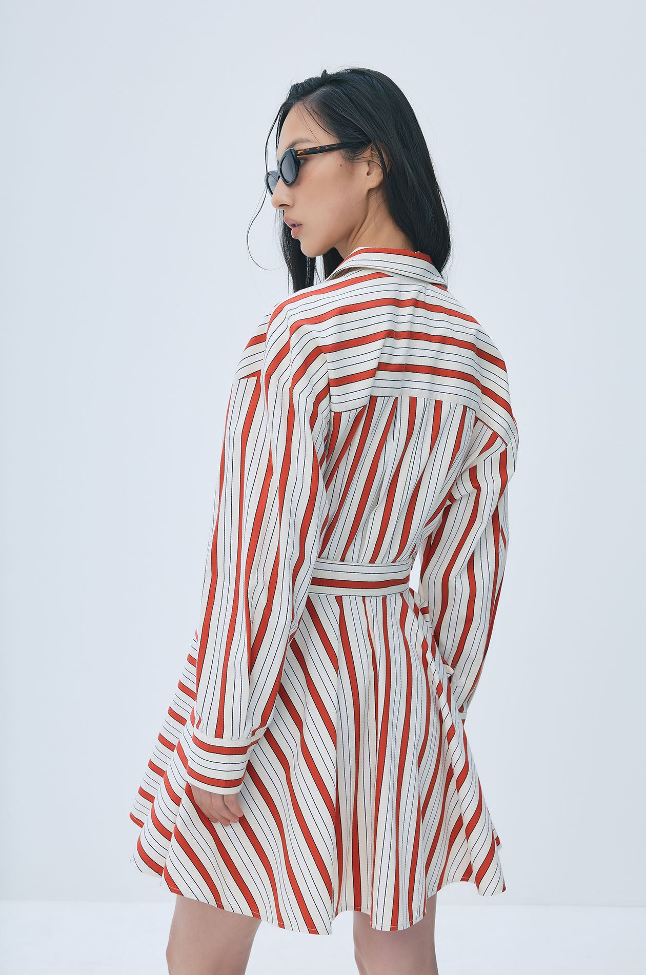 Mini dress crafted from cotton-blend poplin in vertical stripes. Designed with a pointed collar and front button closure, featuring long sleeves and a softly flared silhouette for easy movement. Available in red.