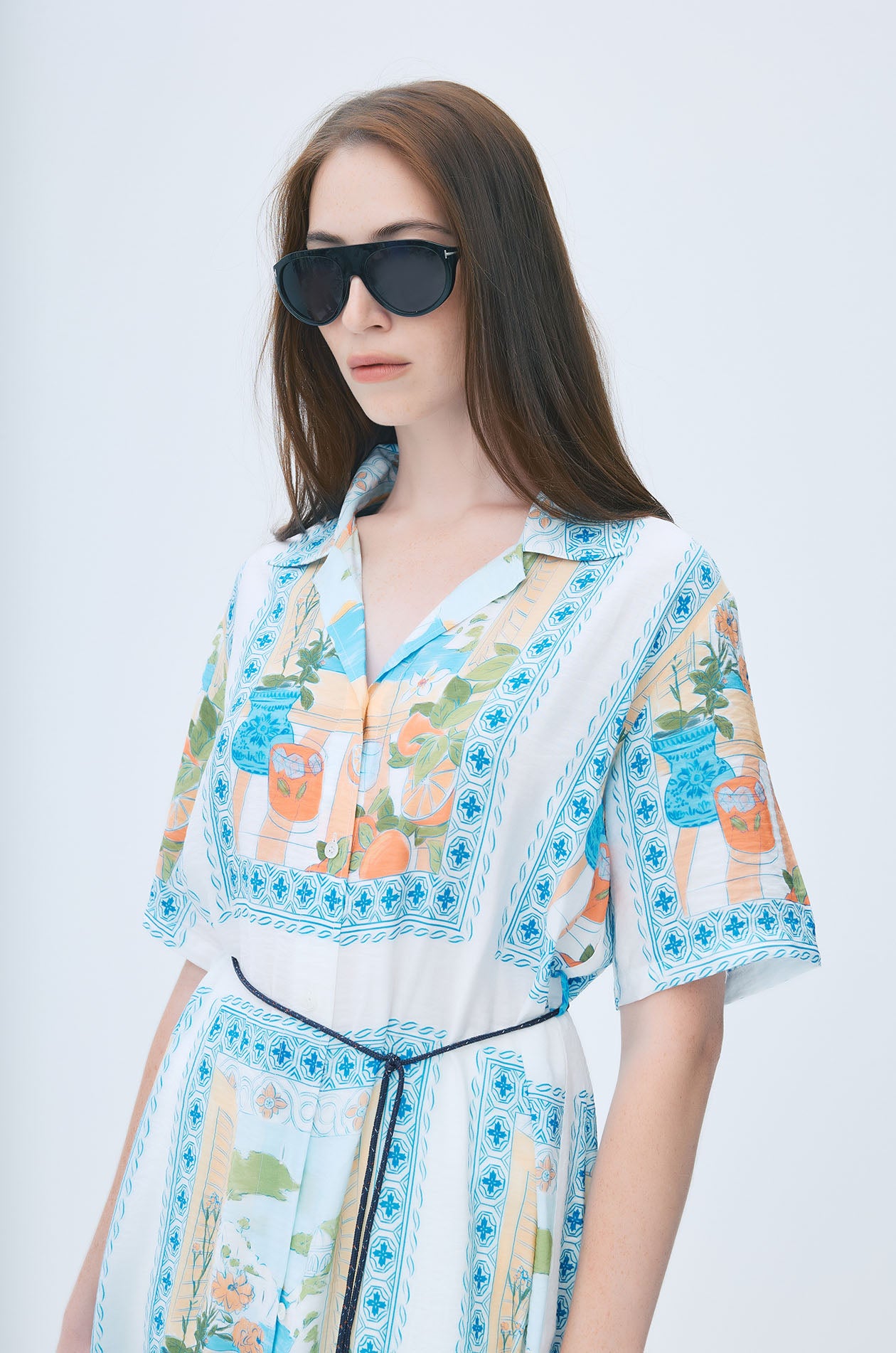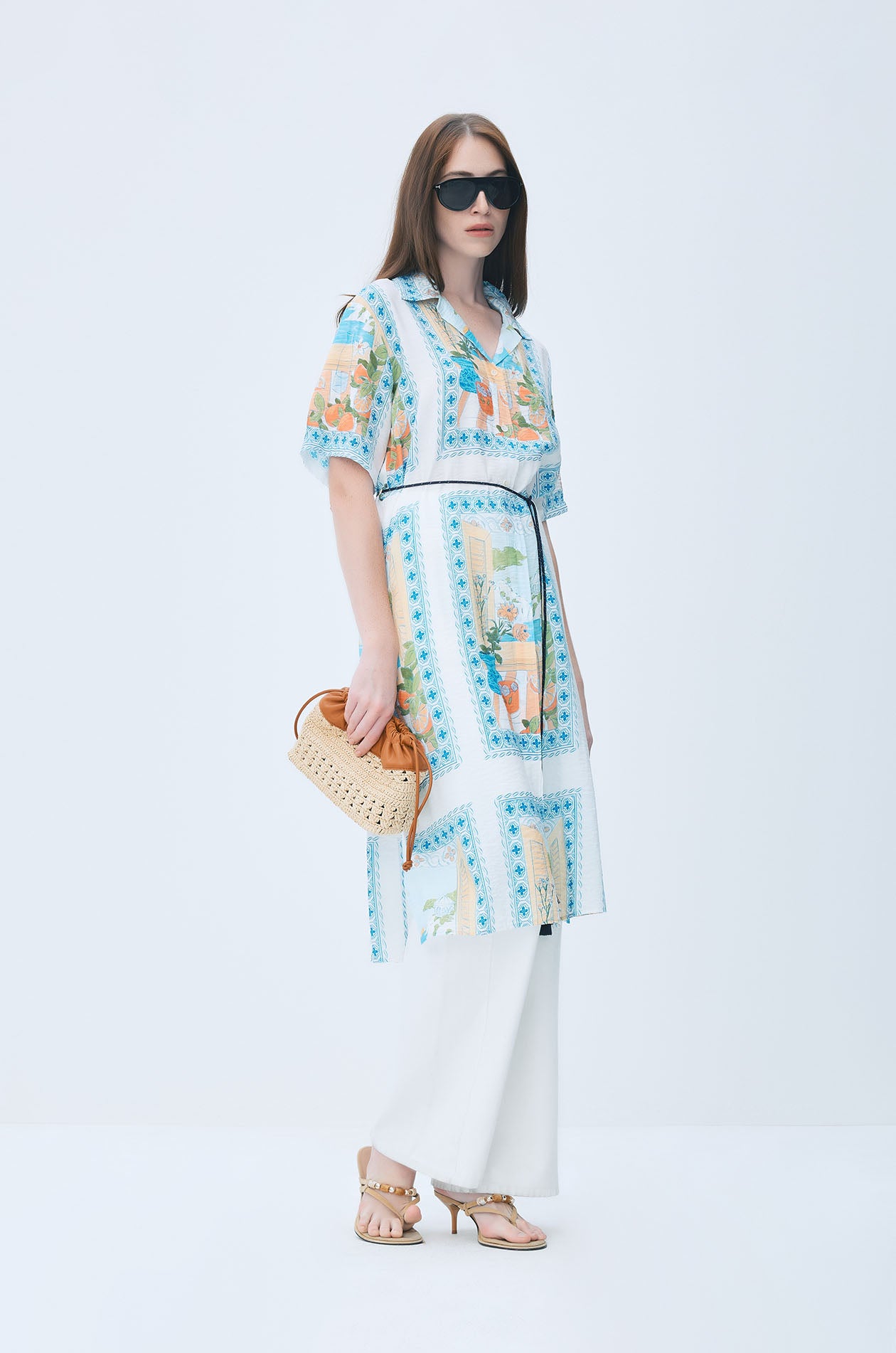 Short-sleeved midi shirt dress crafted from crinkled lightweight fabric for an airy, comfortable feel. Designed in a loose fit with a classic collar and button-down front, it features a vibrant vacation-inspired print that adds a lively, vacation-ready character. The relaxed silhouette allows it to be worn alone or layered open as a breezy beach cover-up. Available in multi-color.