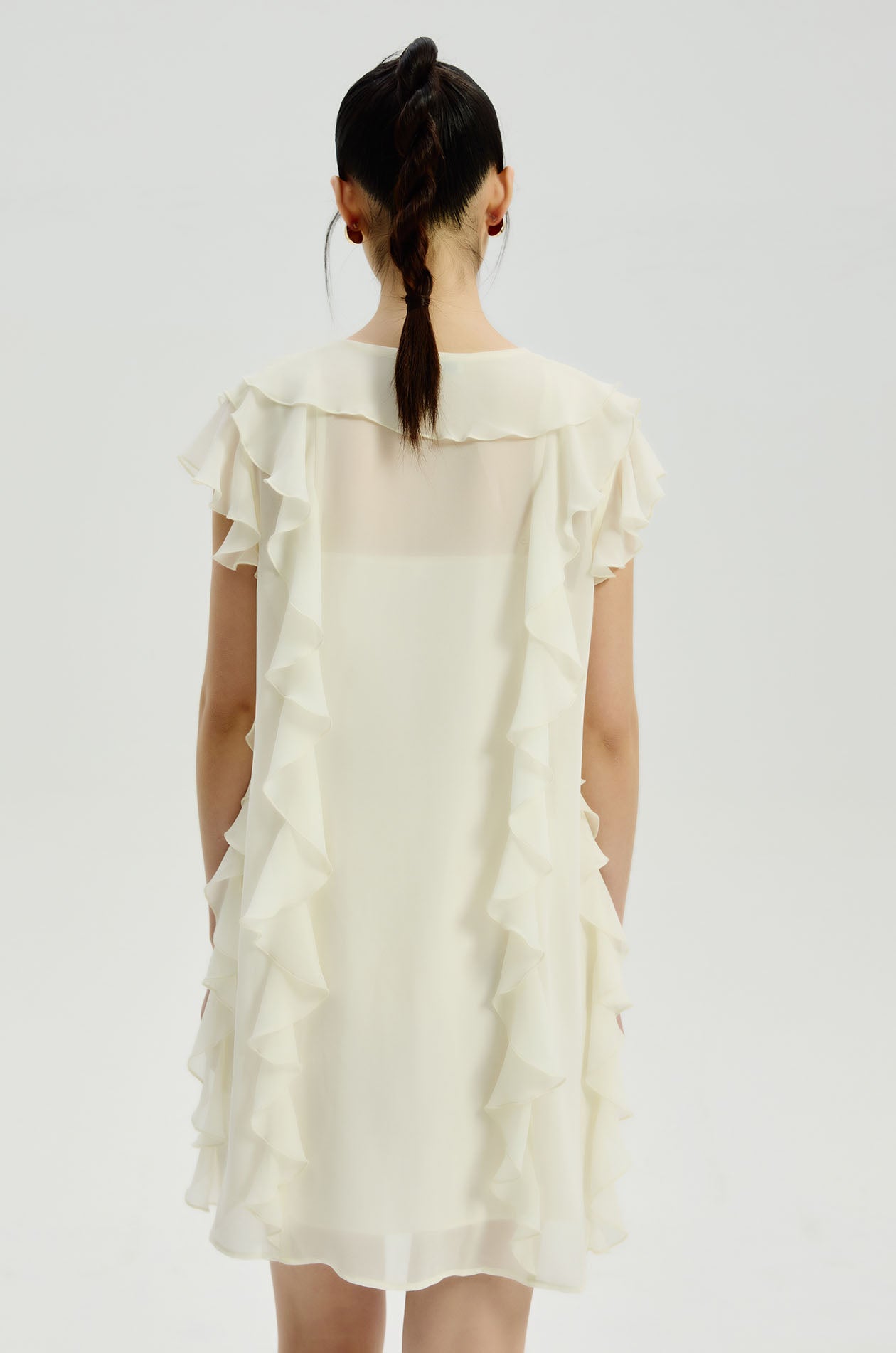 sleeveless mini dress in chiffon. Shift silhouette a V-neckline, ruffle trim, and a camisole lining. Front tie closure. Available in off-white.