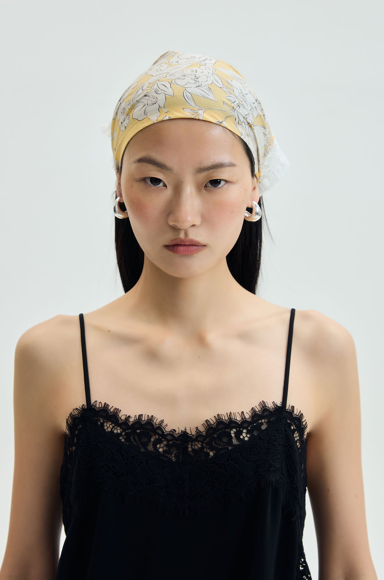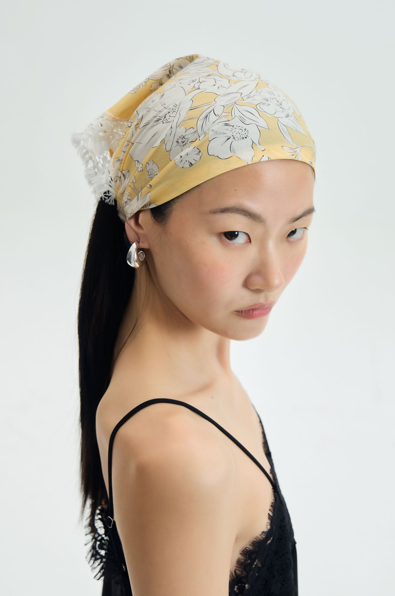 Lightweight hair scarf crafted from woven cotton for breathable all-day comfort. Designed with a soft floral print that adds a gentle, romantic touch to everyday styling. Available in yellow.