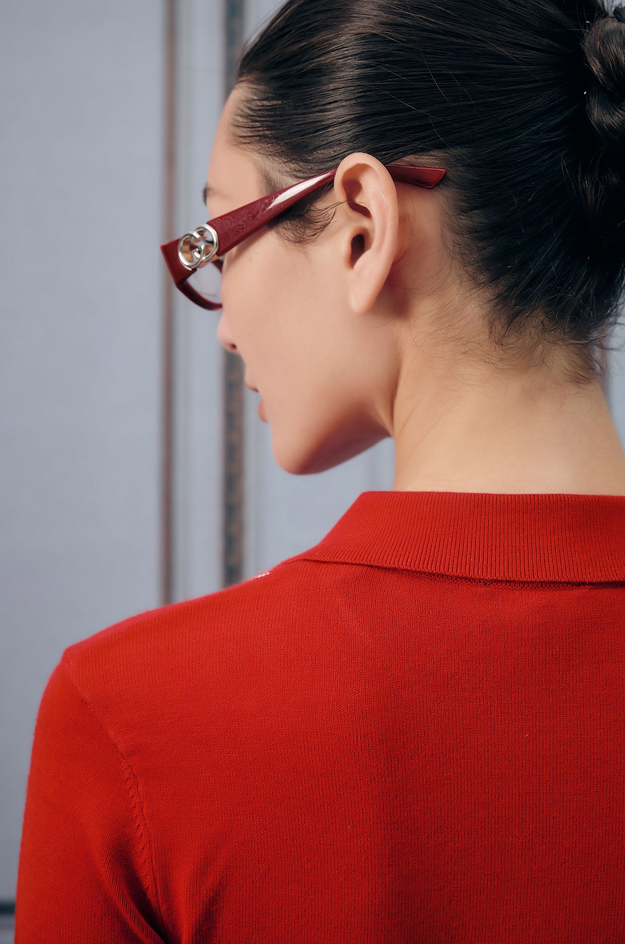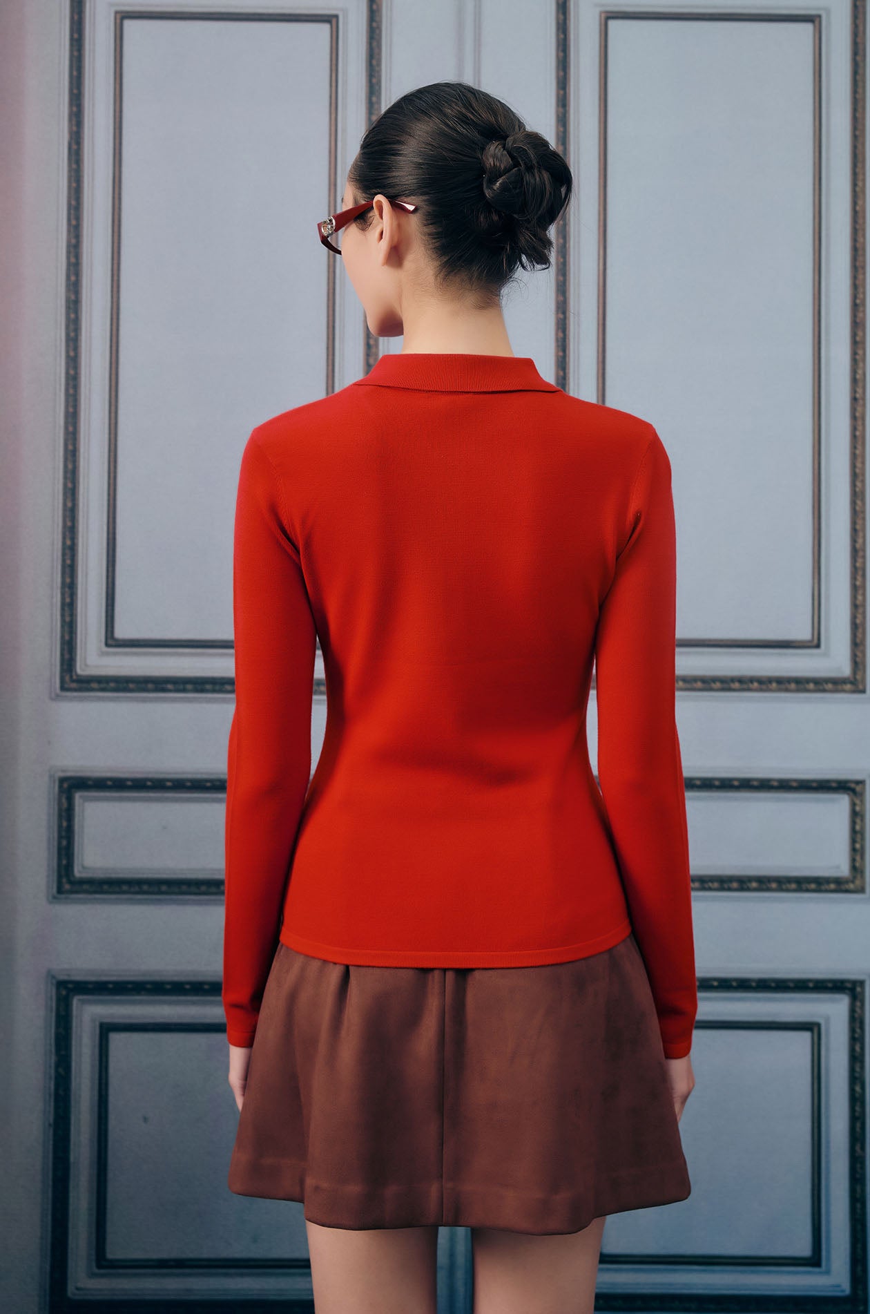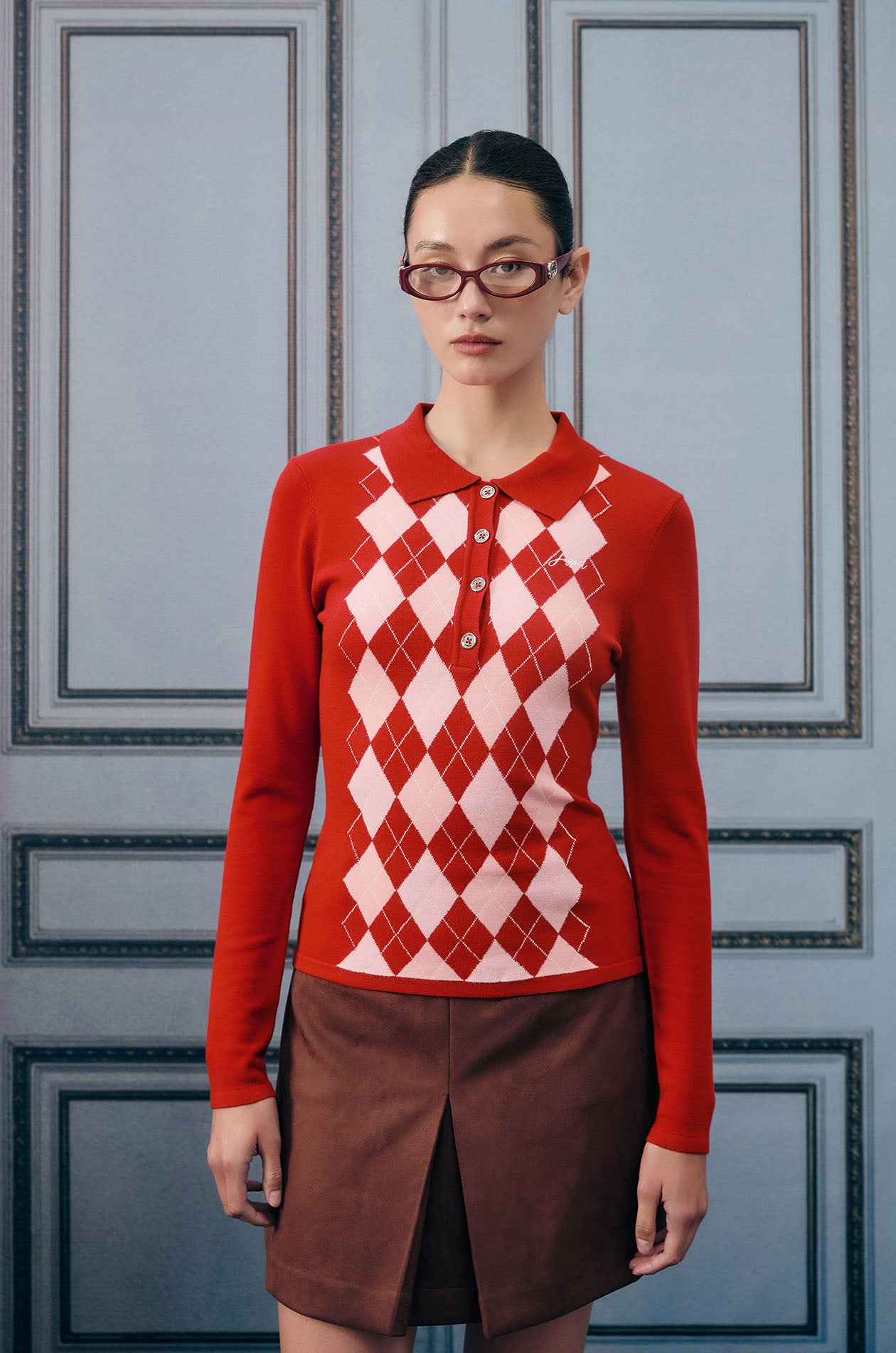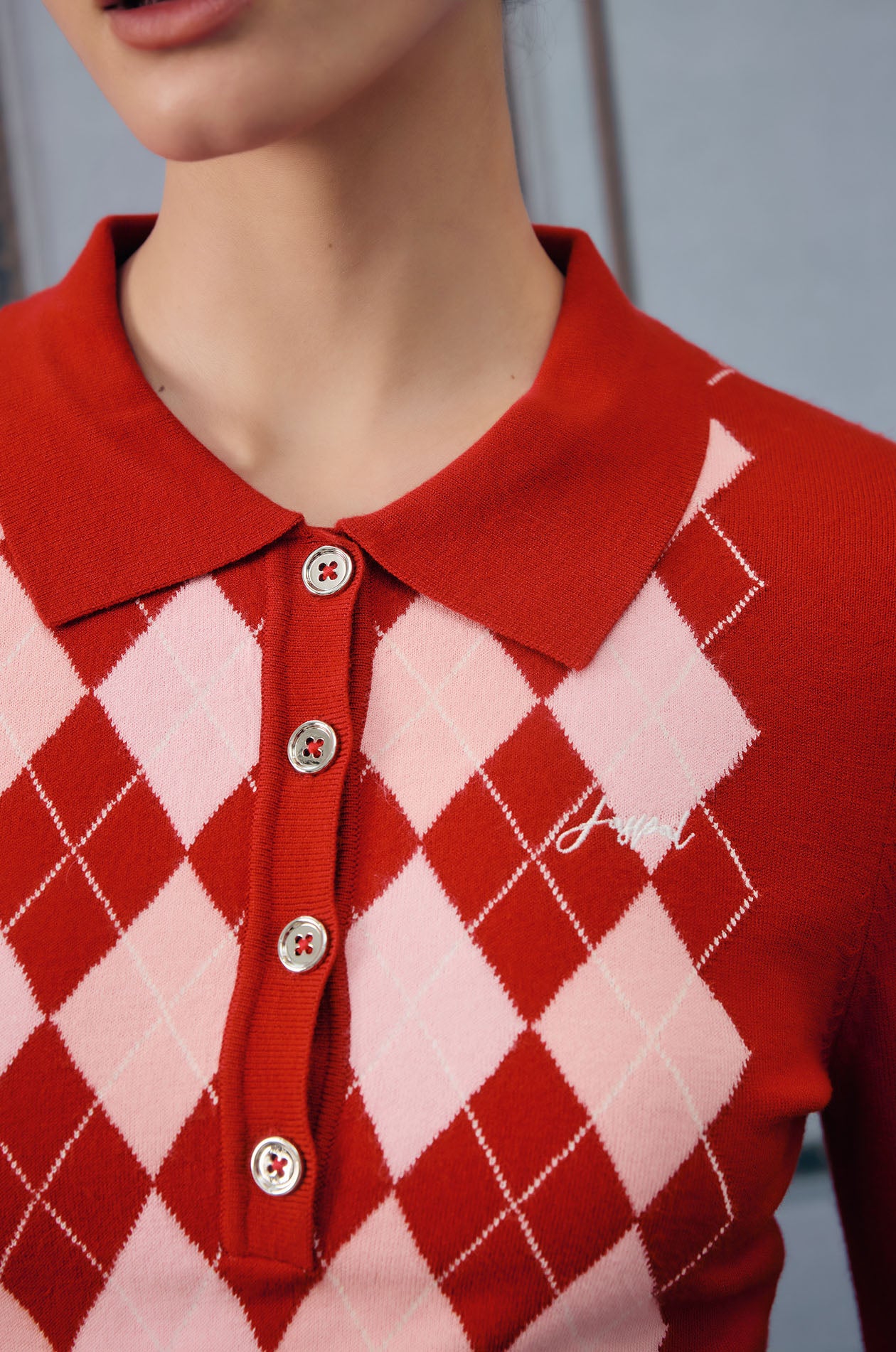 Long-sleeved Henley top in knit fabric with argyle pattern. Slim fit with polo collar and Jaspal logo embroidery at the chest. Front button closure. Available in red.