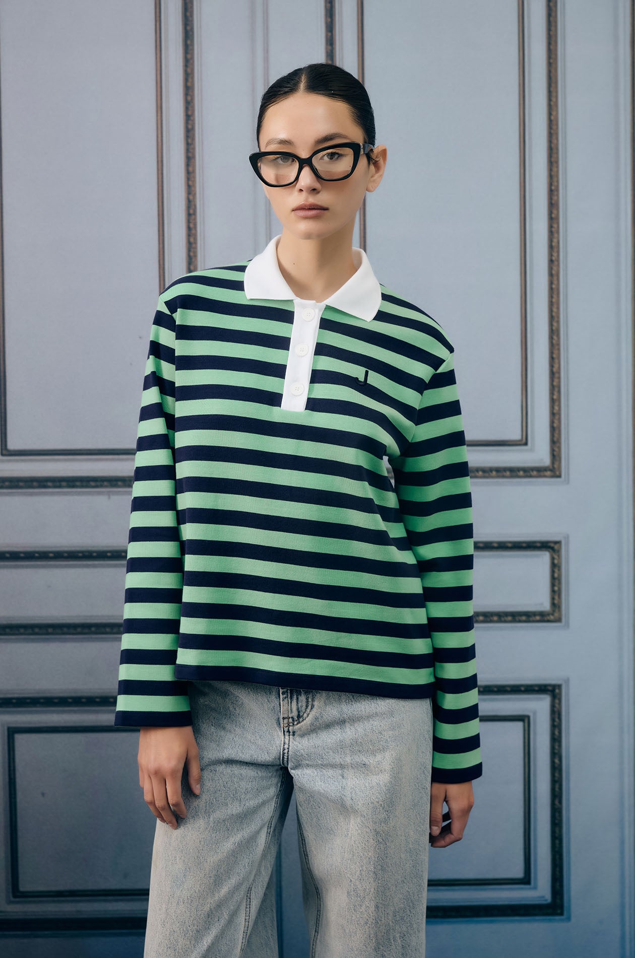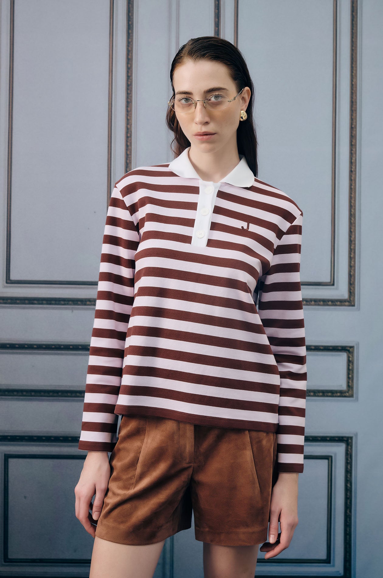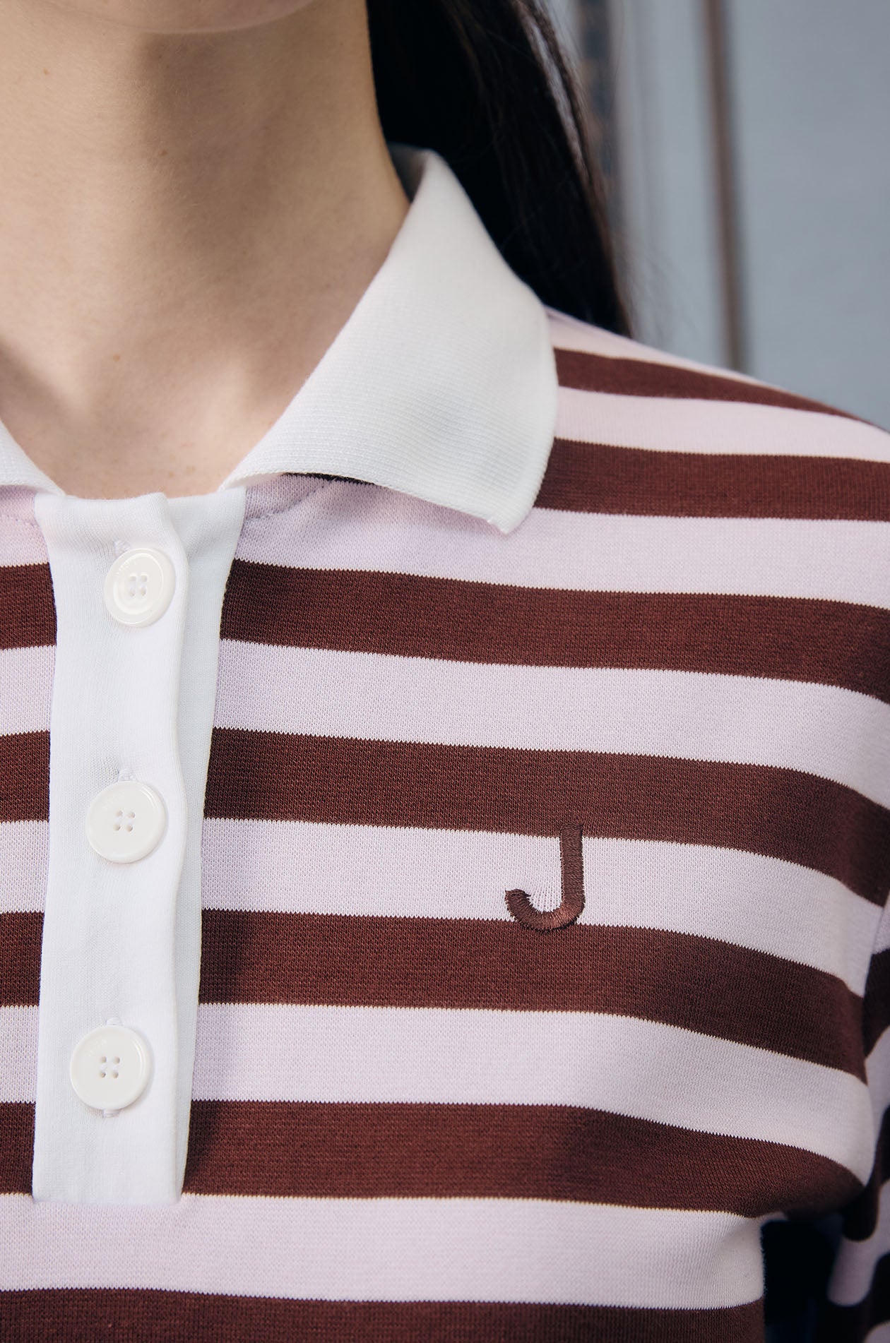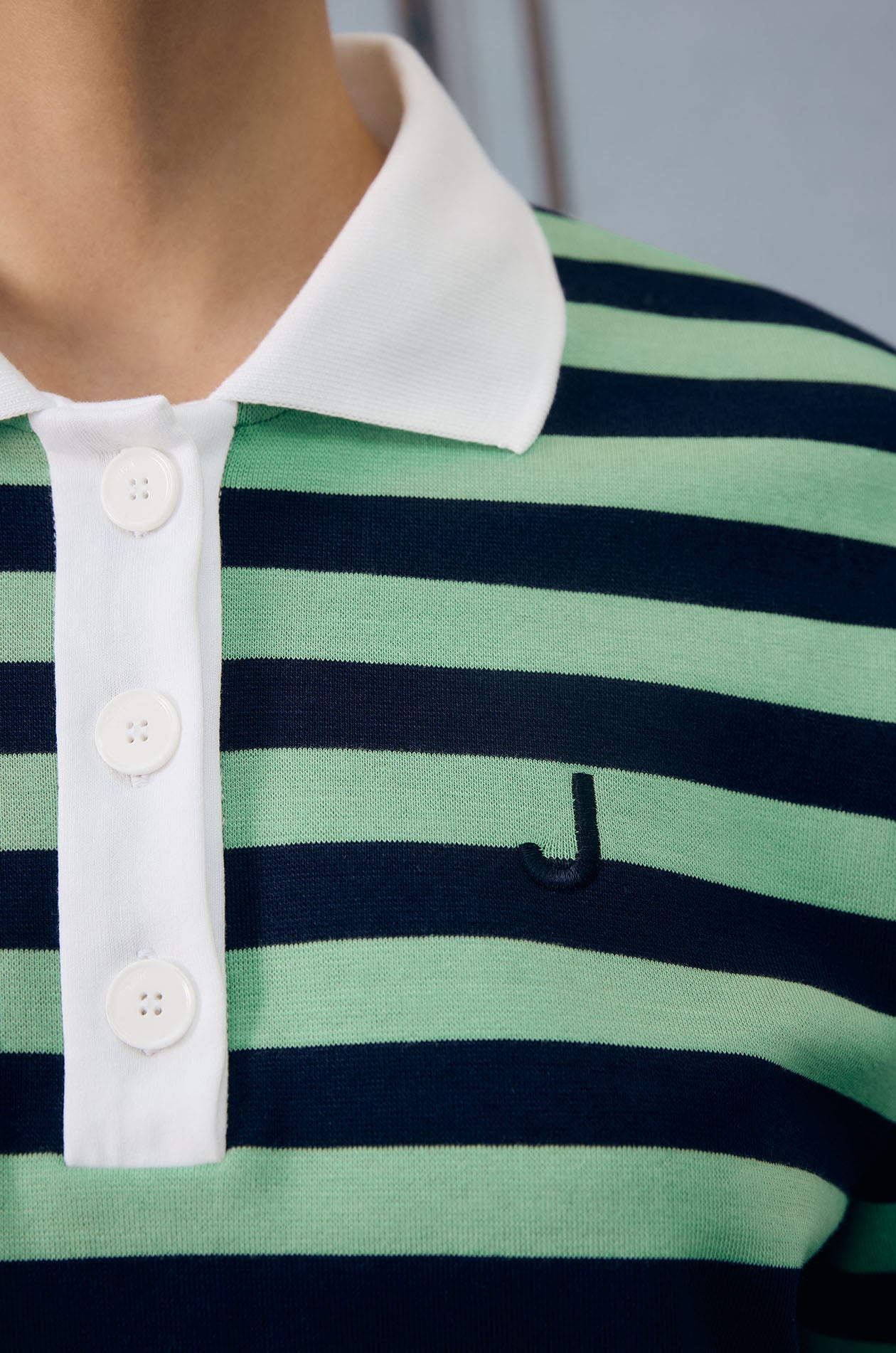Long-sleeved polo shirt in knit fabric with horizontal stripes. Relaxed fit with spread collar and J embroidery at the chest. Front button closure. Available in green/navy and pale purple/brown.