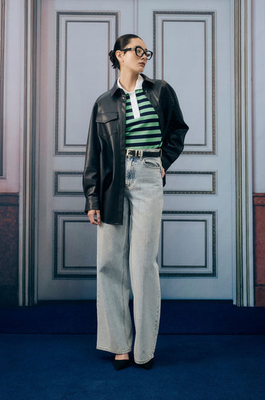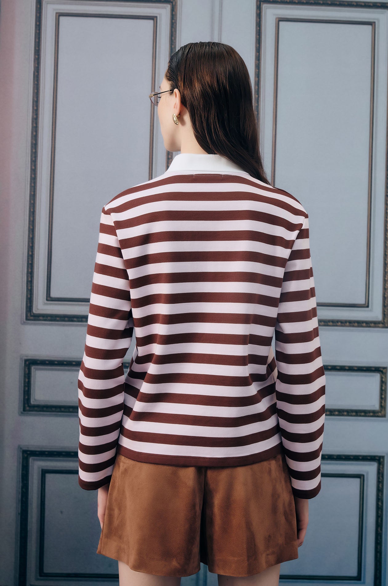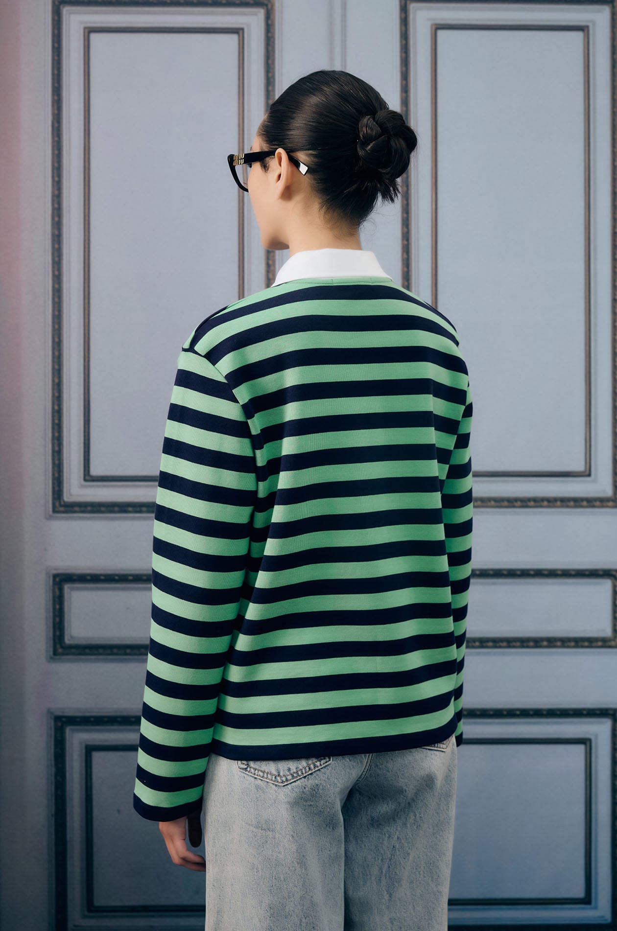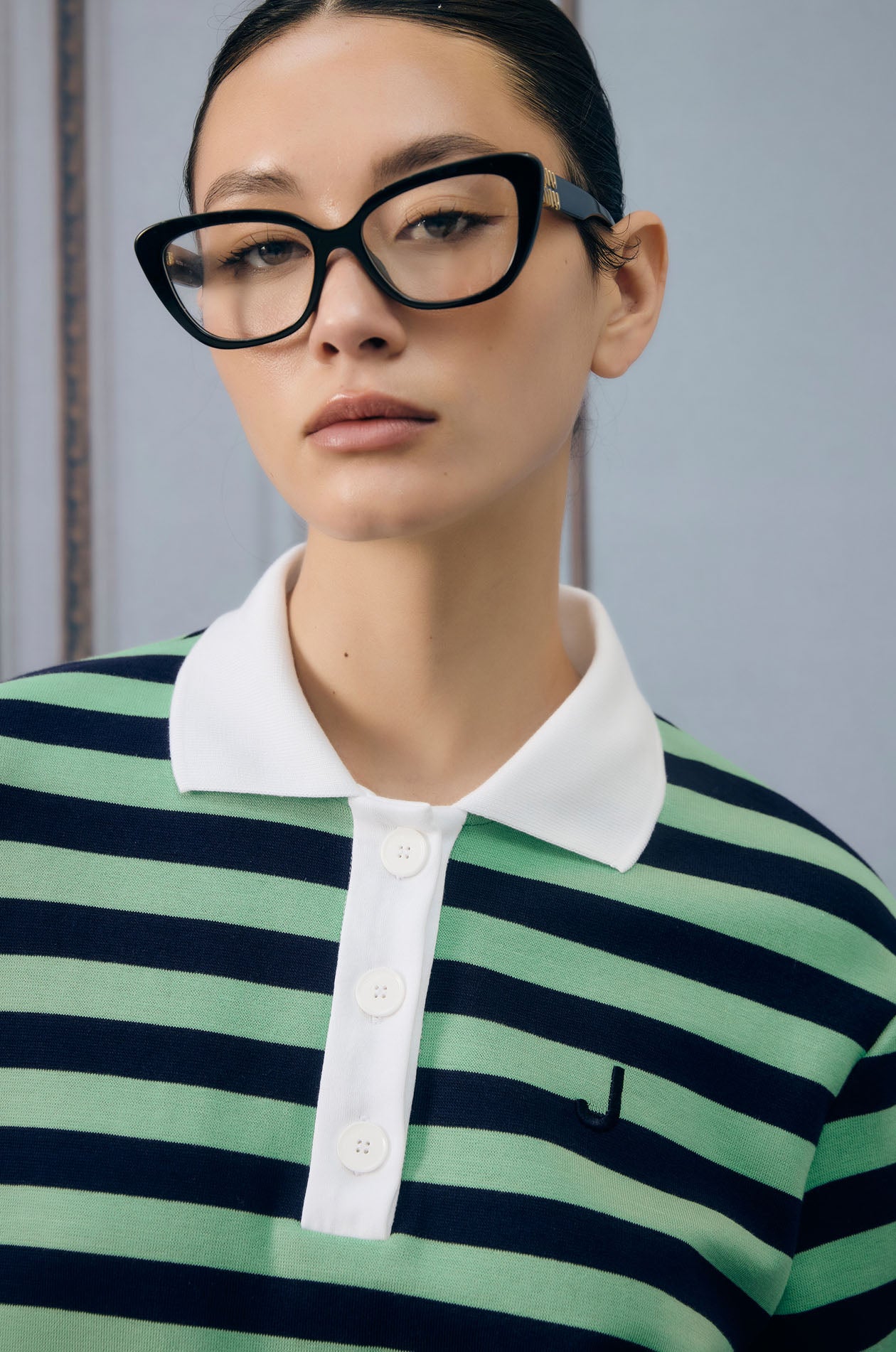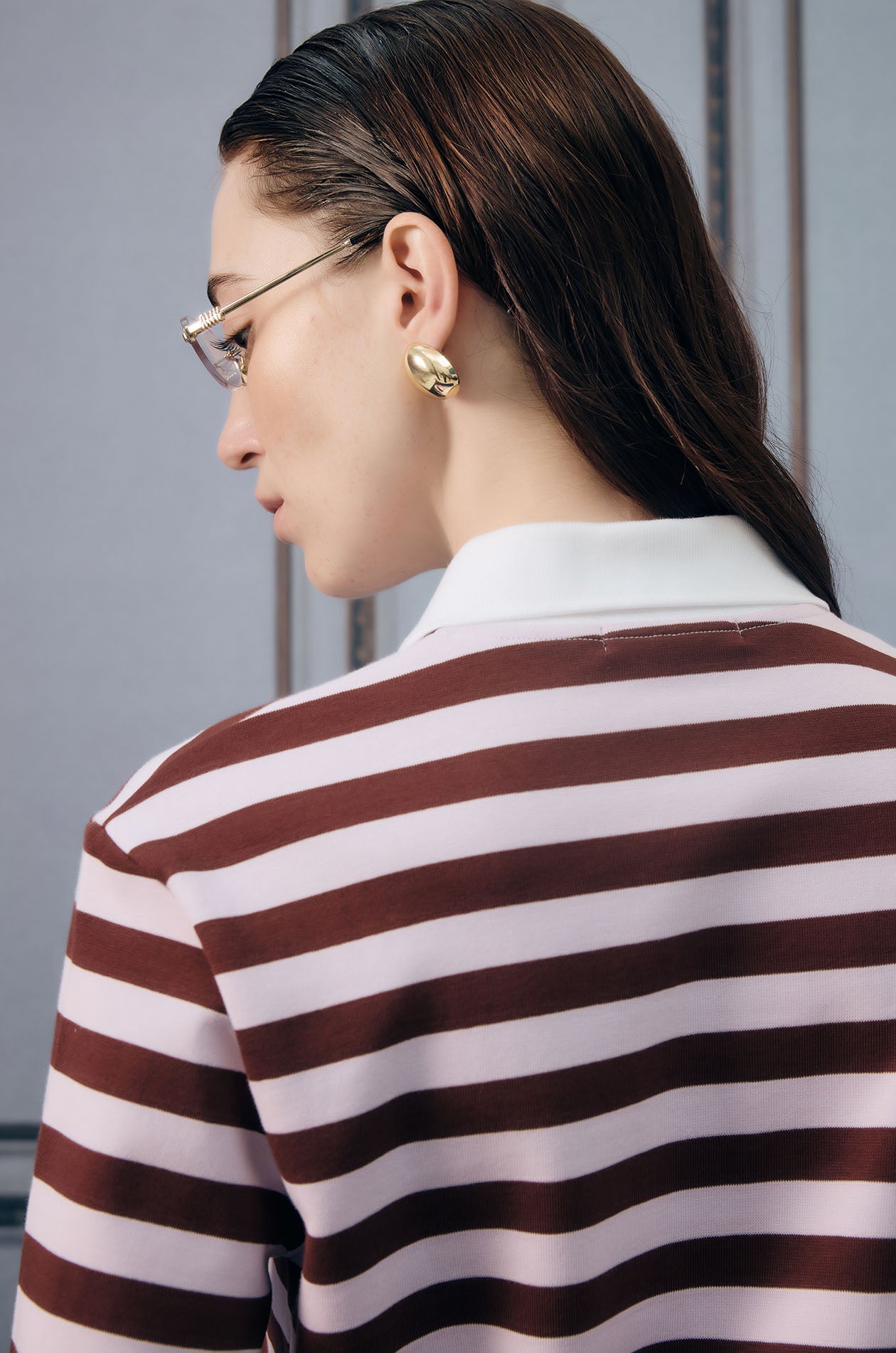 Long-sleeved polo shirt in knit fabric with horizontal stripes. Relaxed fit with spread collar and J embroidery at the chest. Front button closure. Available in green/navy and pale purple/brown.