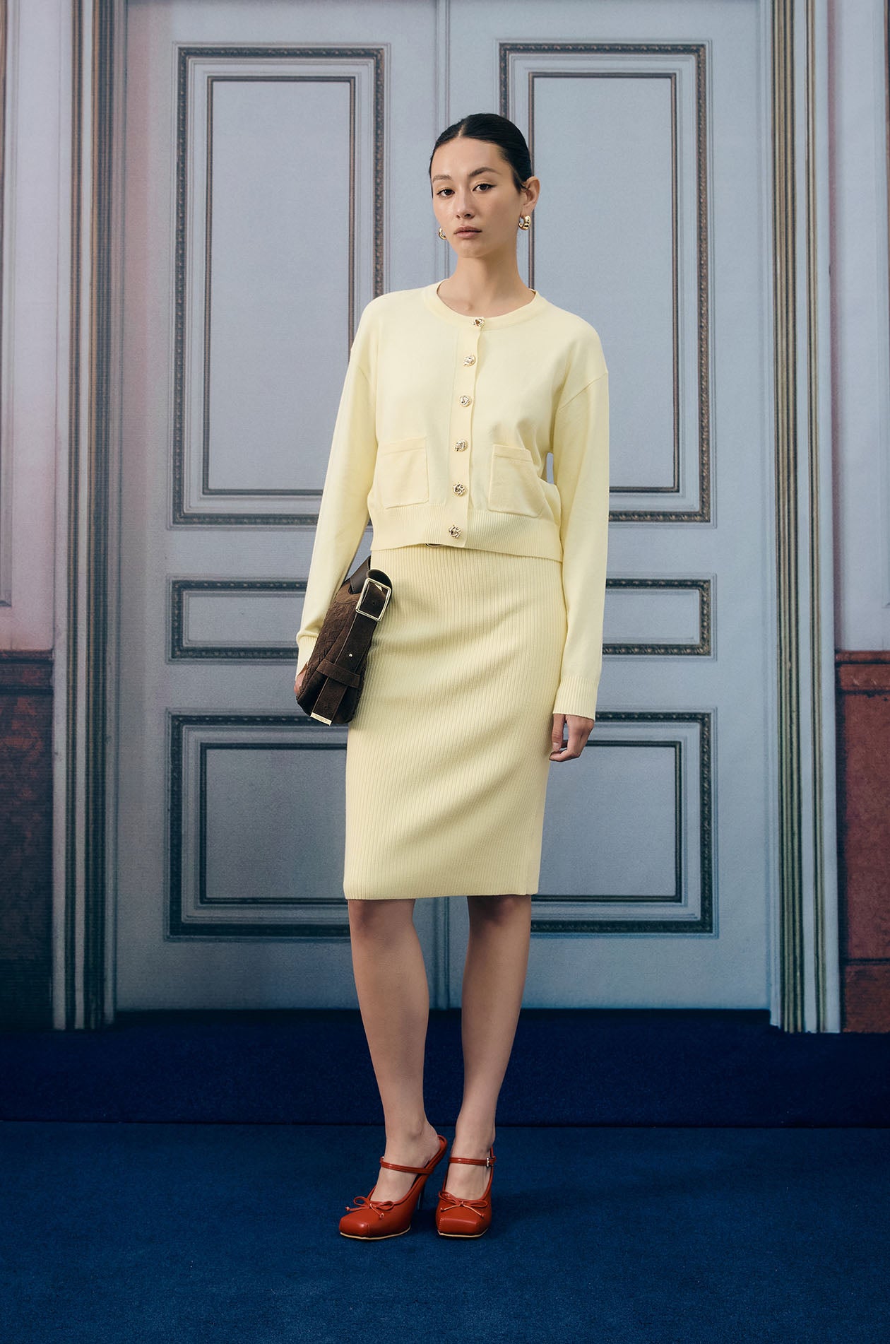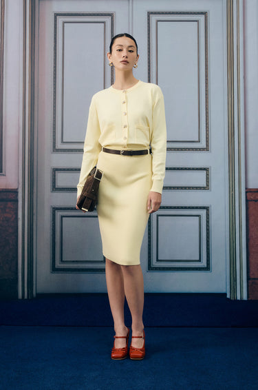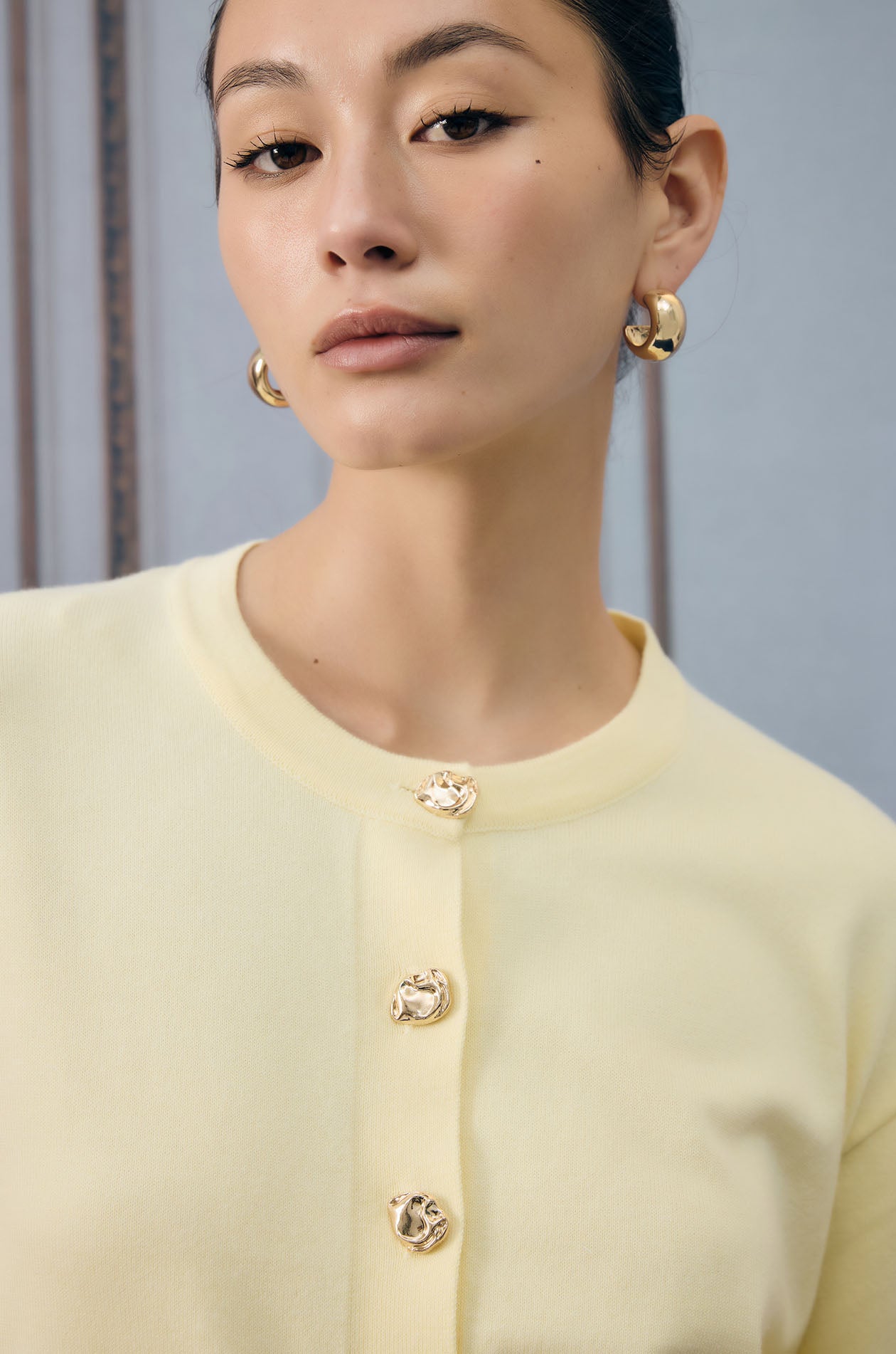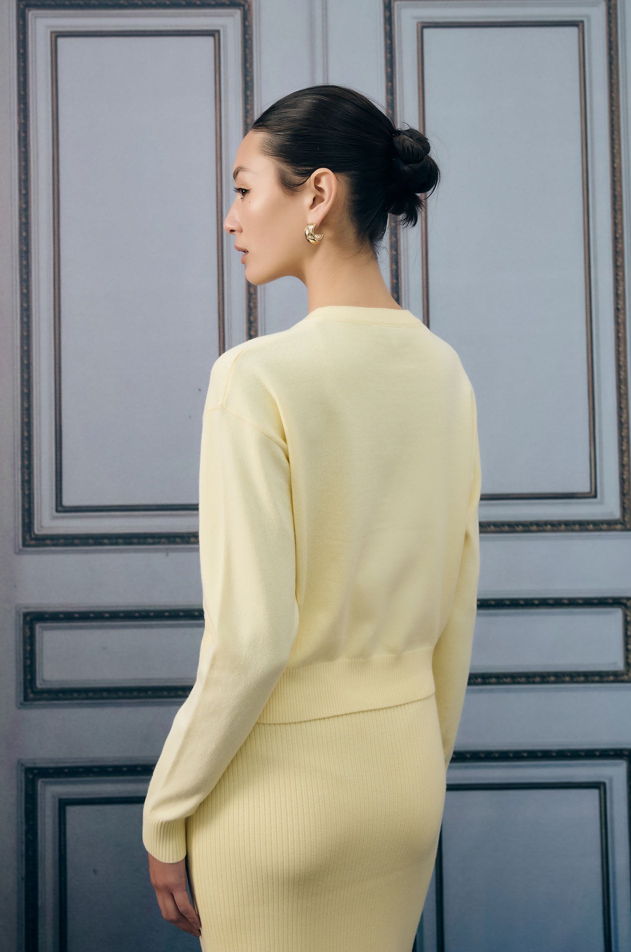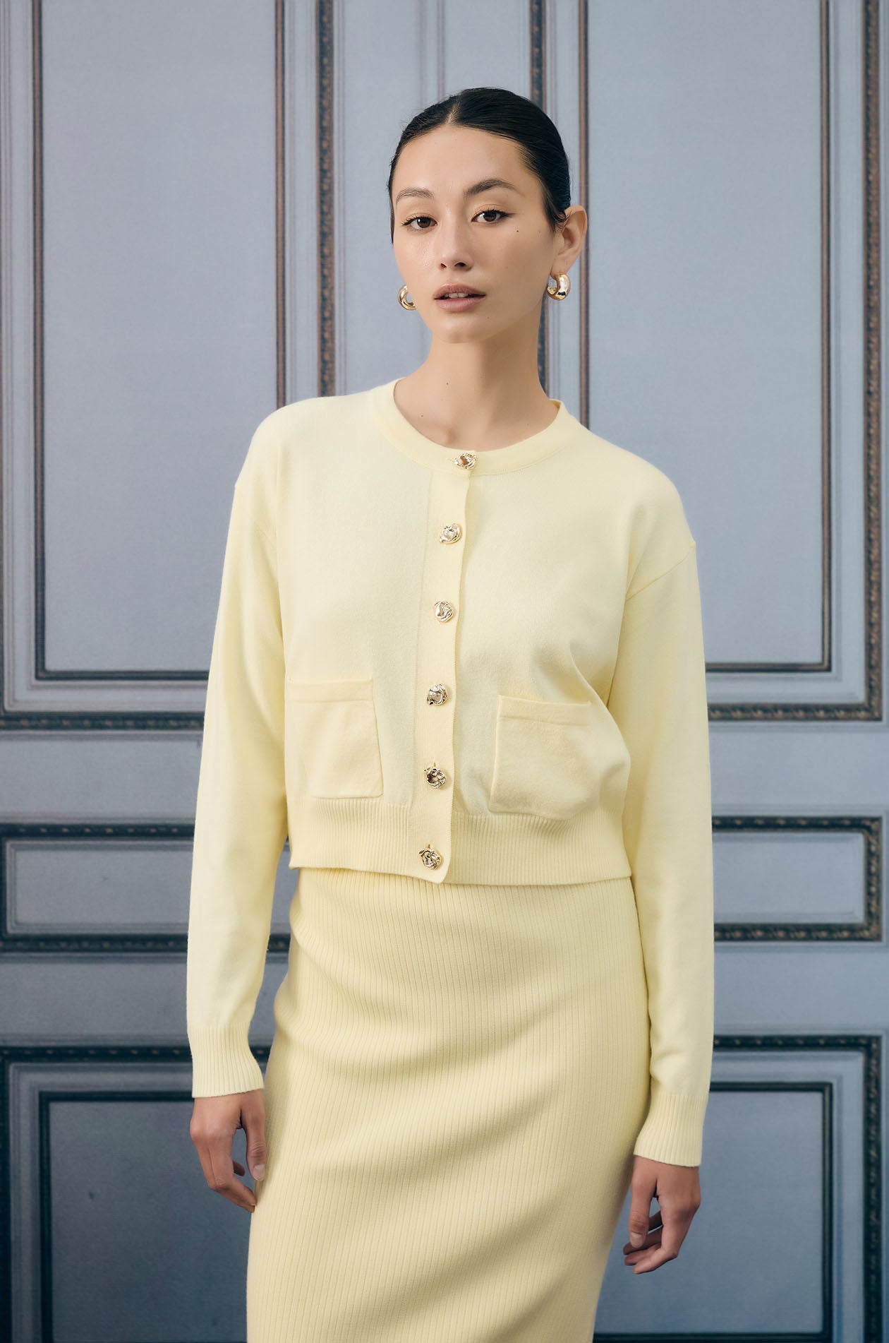 Long-sleeved cropped cardigan in knit fabric. Loose fit with round neckline, front pockets, and ribbed edges. Front button closure. Available in light yellow.