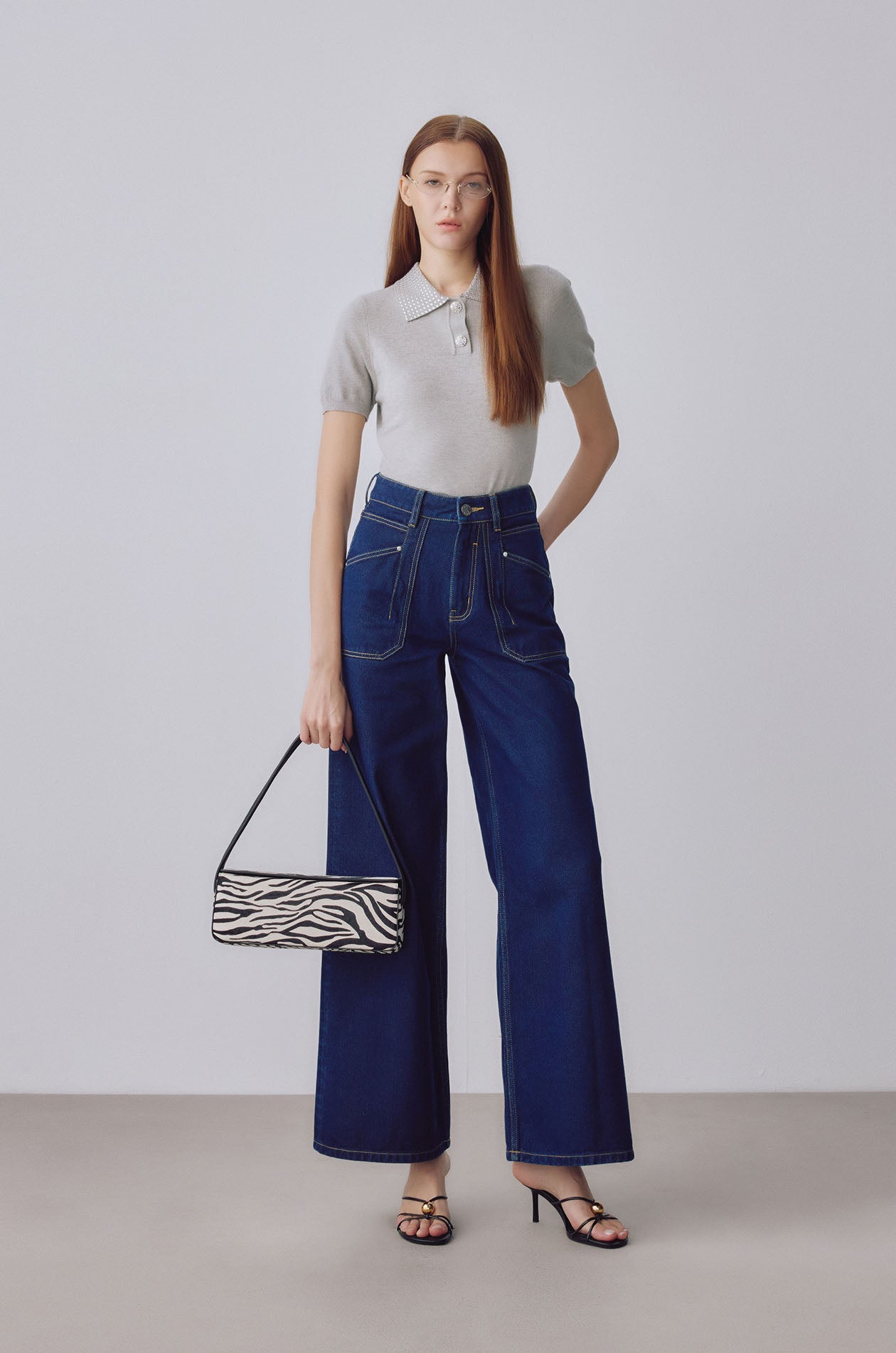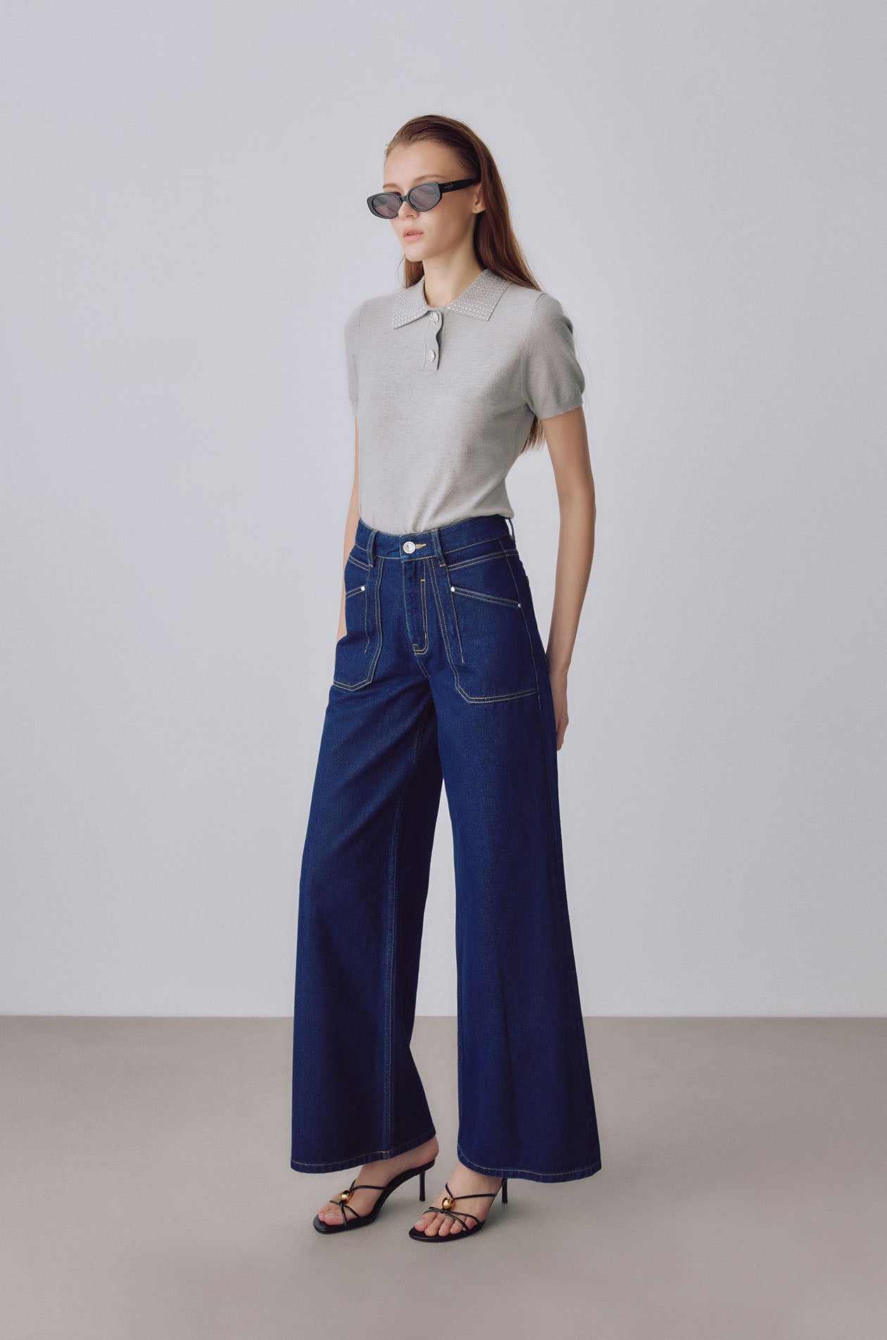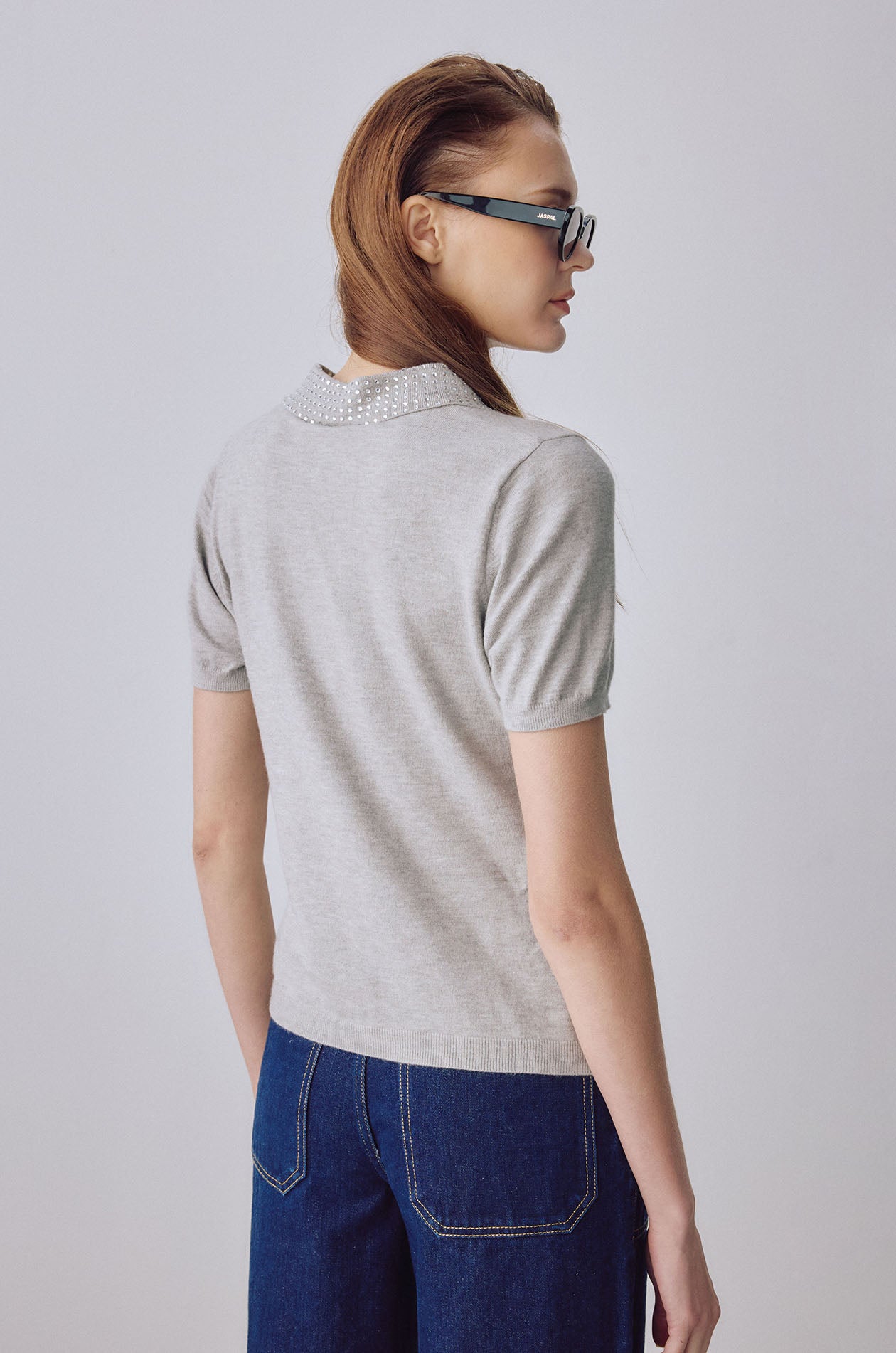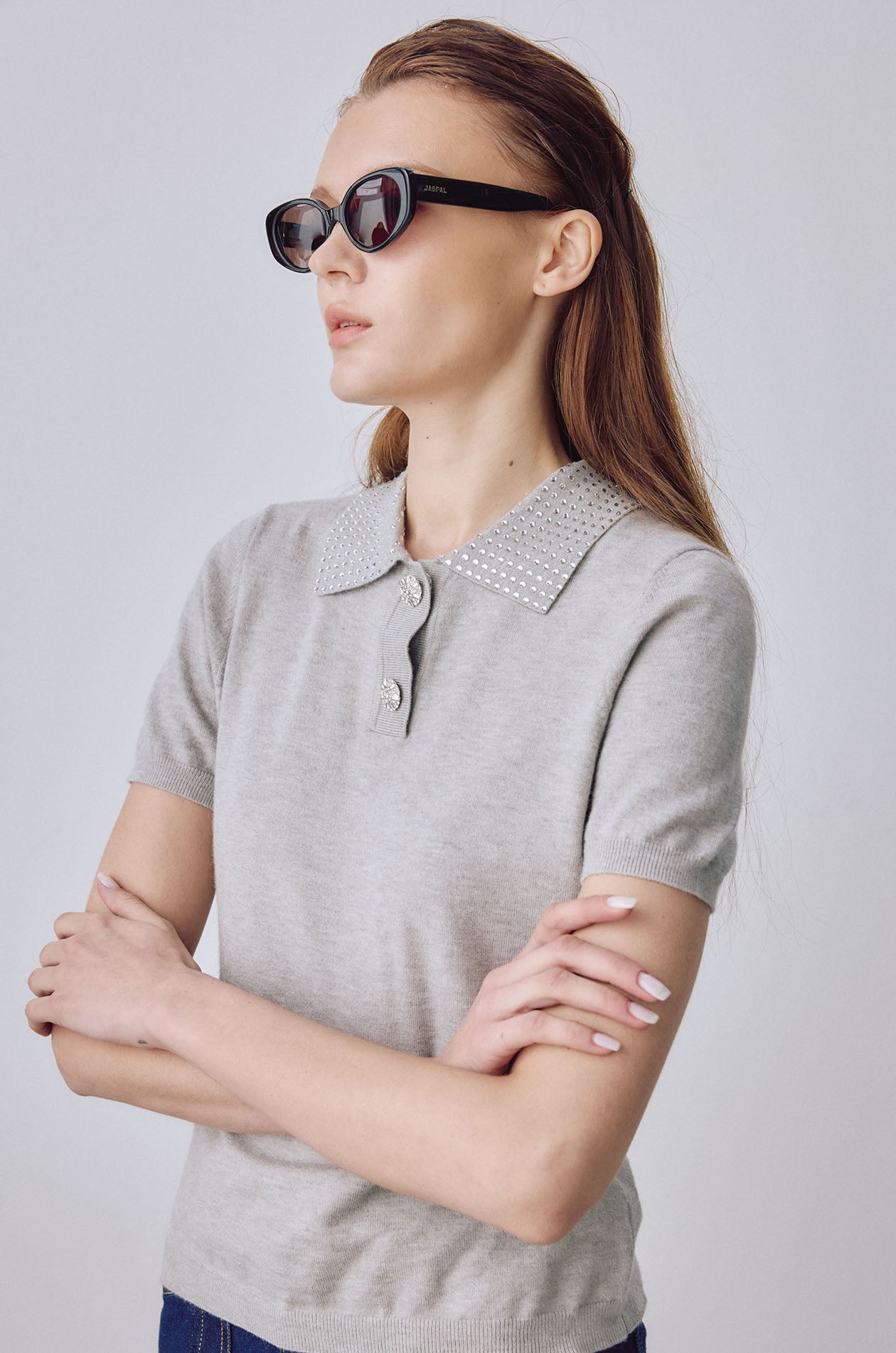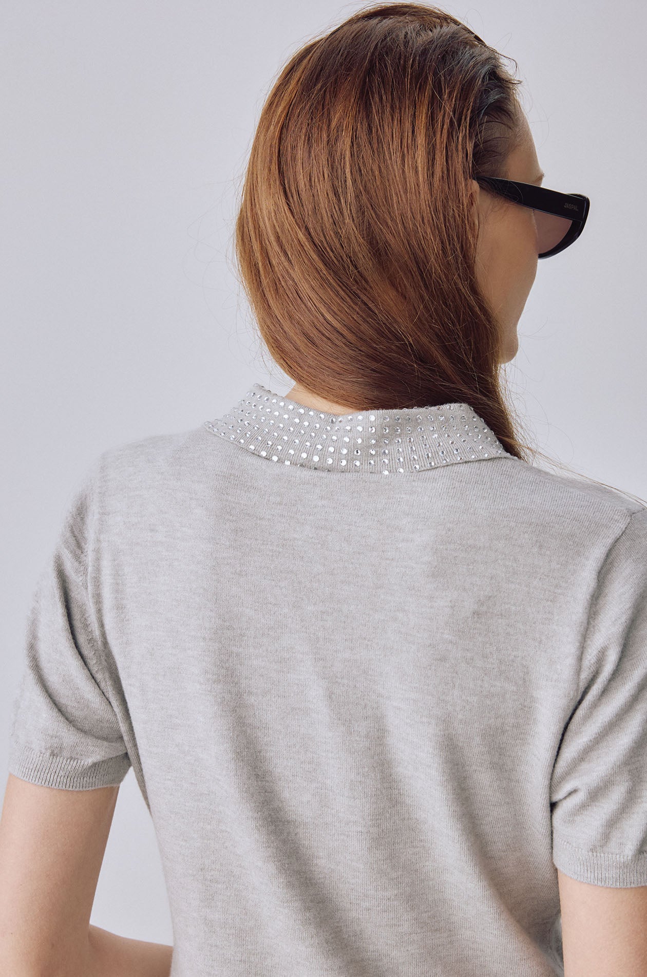 Short-sleeved polo shirt in knit fabric. Rhinestone-embellished collar and ribbed edges. Slim fit. Front rhinestone-button closure. Available in cornflower blue and grey.