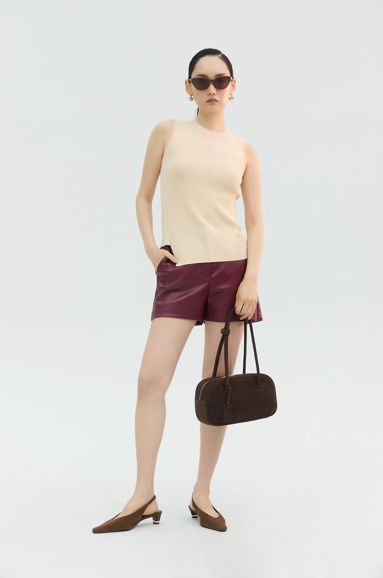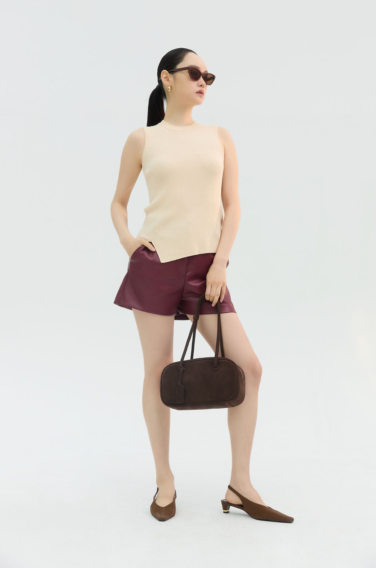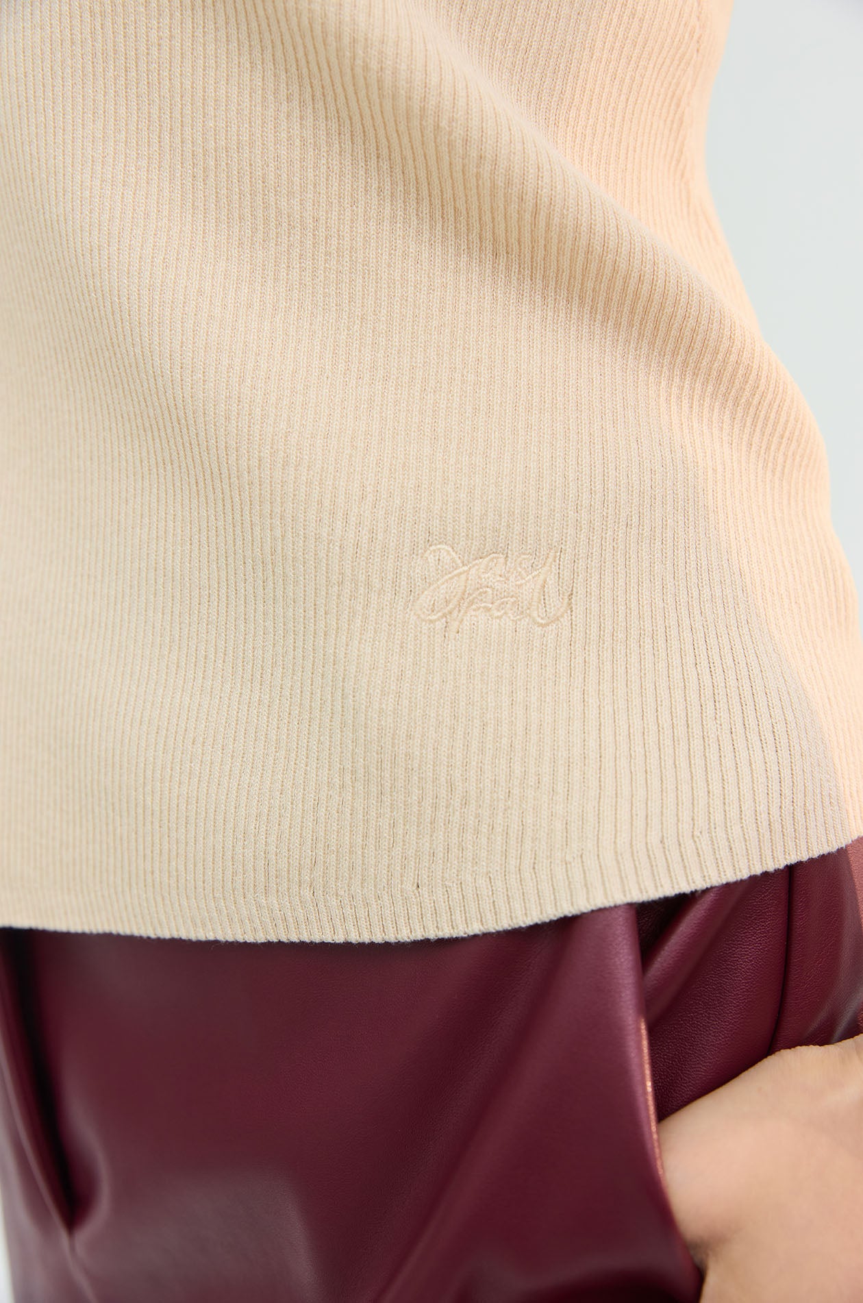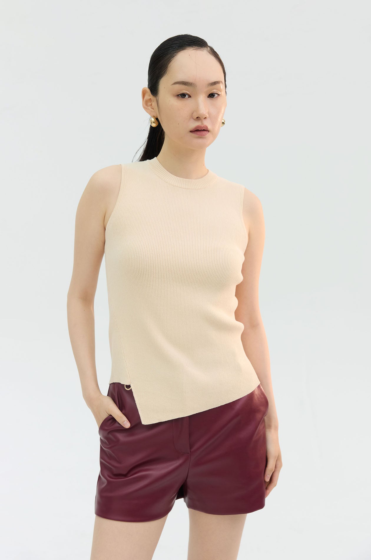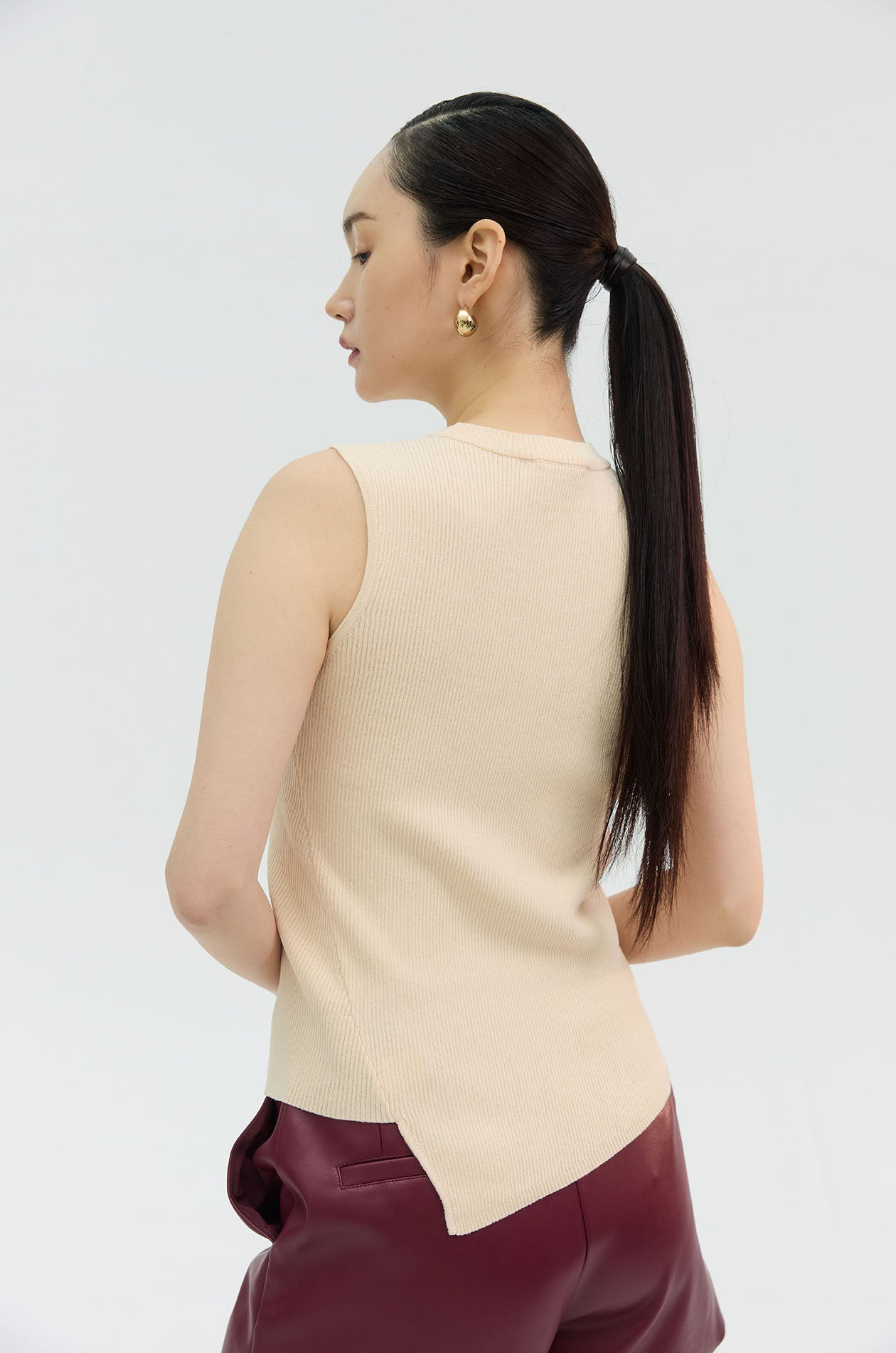 Sleeveless top in rib knit. Asymmetric design highlights the hemline with a flashy feel, decorated with Jaspal logo embroidery. Chunky-ribbed crew neck. Pull-on style. Available in black and beige.