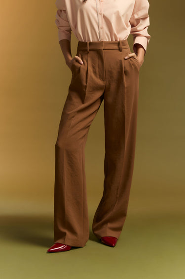 Mid-rise tailored pants in mid-weight crepe fabric. This pants is perfect for formal and smart casual looks. Straight legs with front pleats. Side and back pockets. Front hook and zip closure. Available in black and brown.