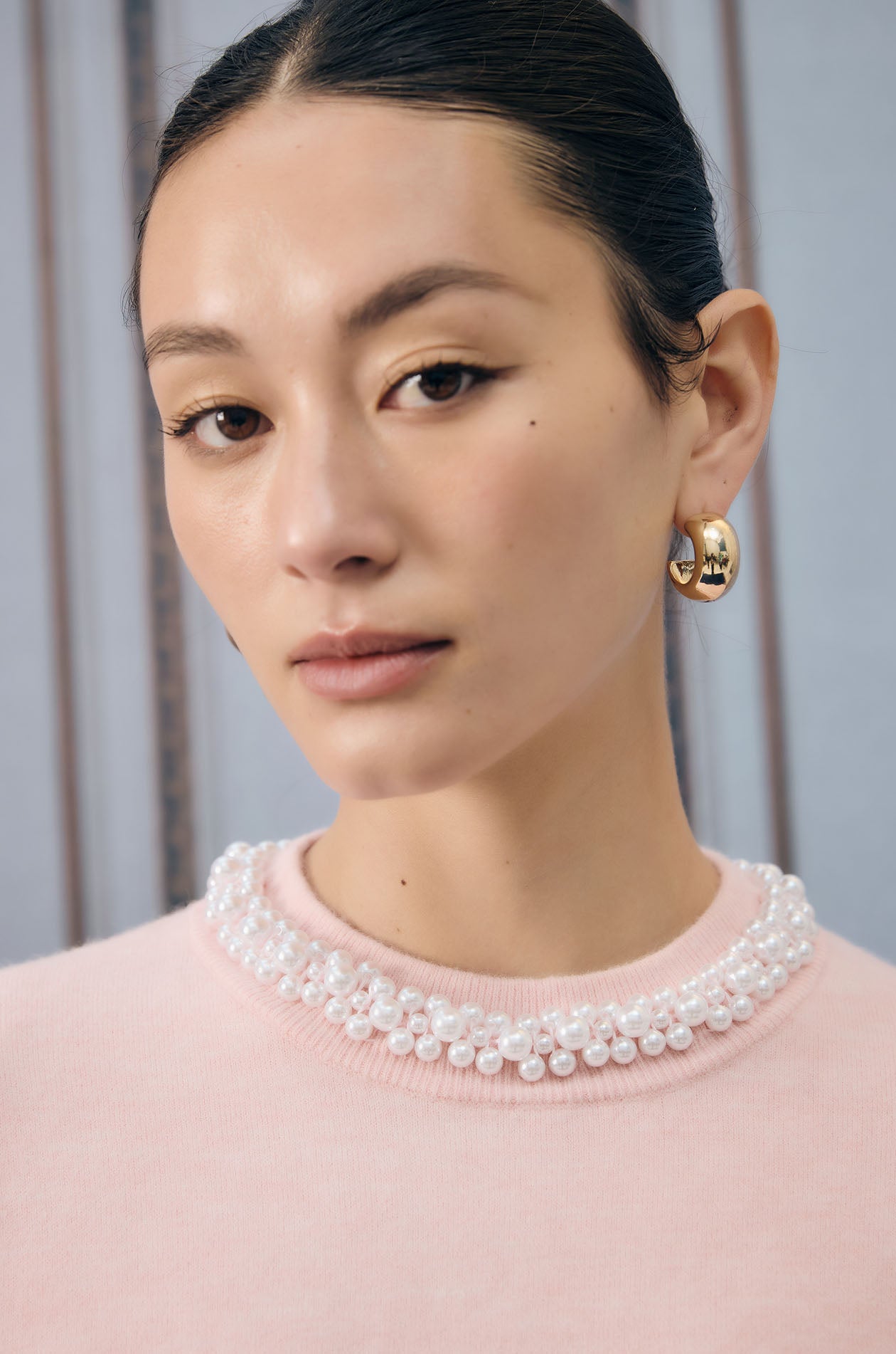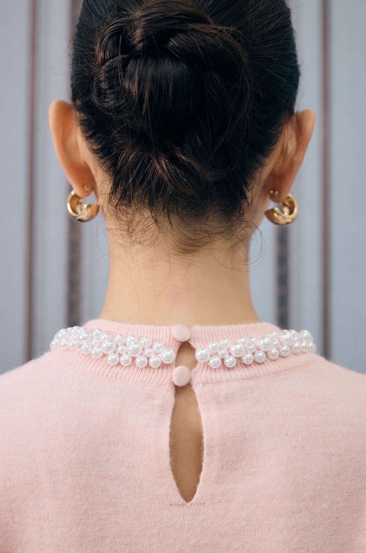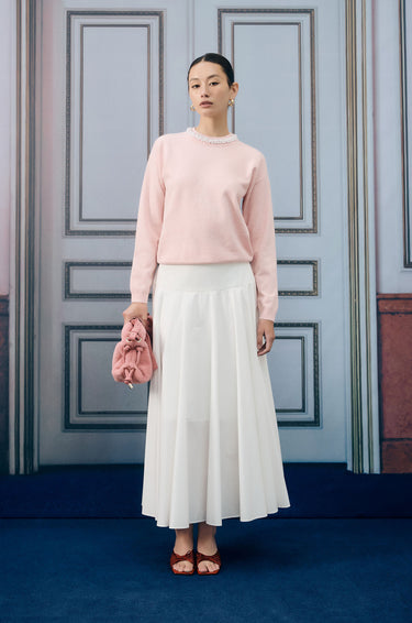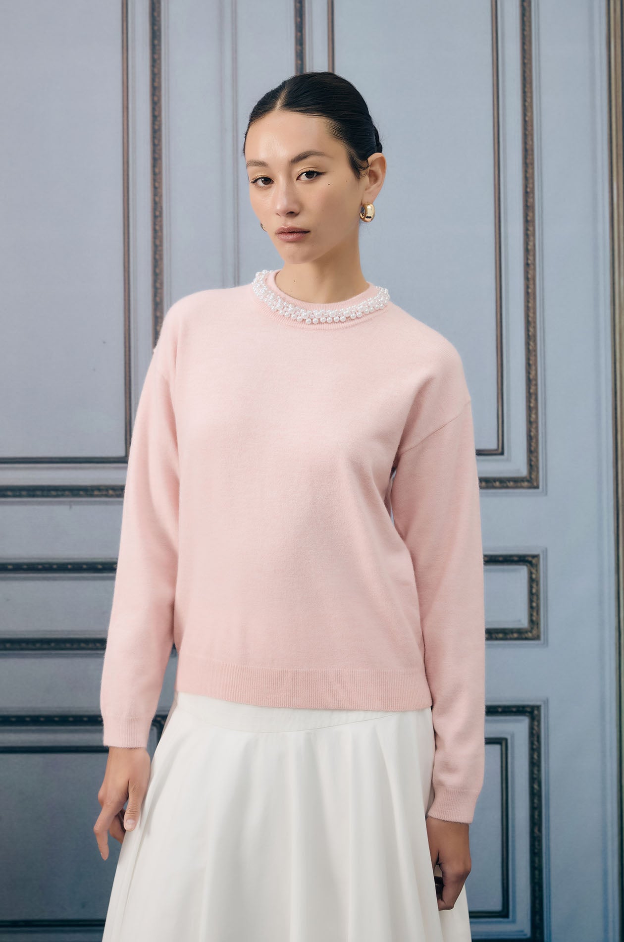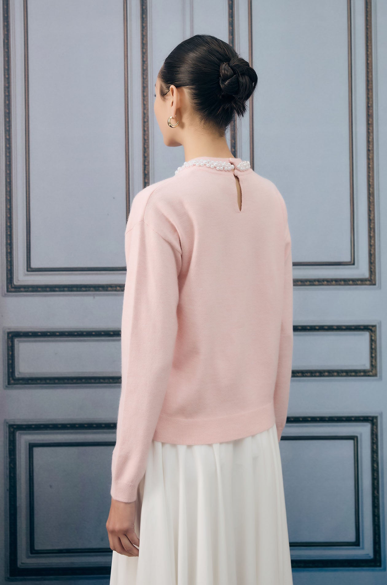 Long-sleeved sweater in knit fabric. Oversized fit with round neck and faux jewel embellishment around neckline. Back loop button and keyhole. Available in pink.