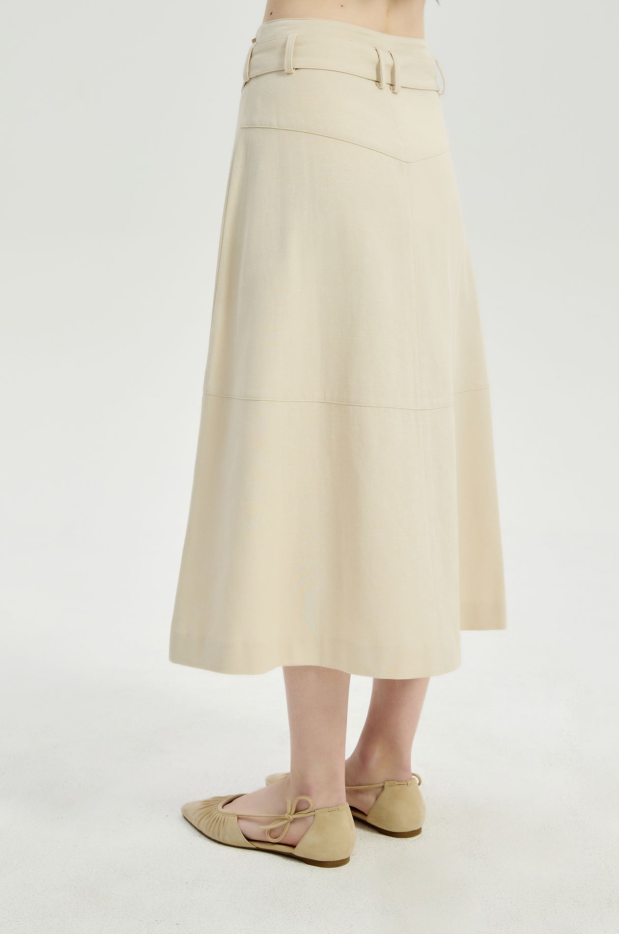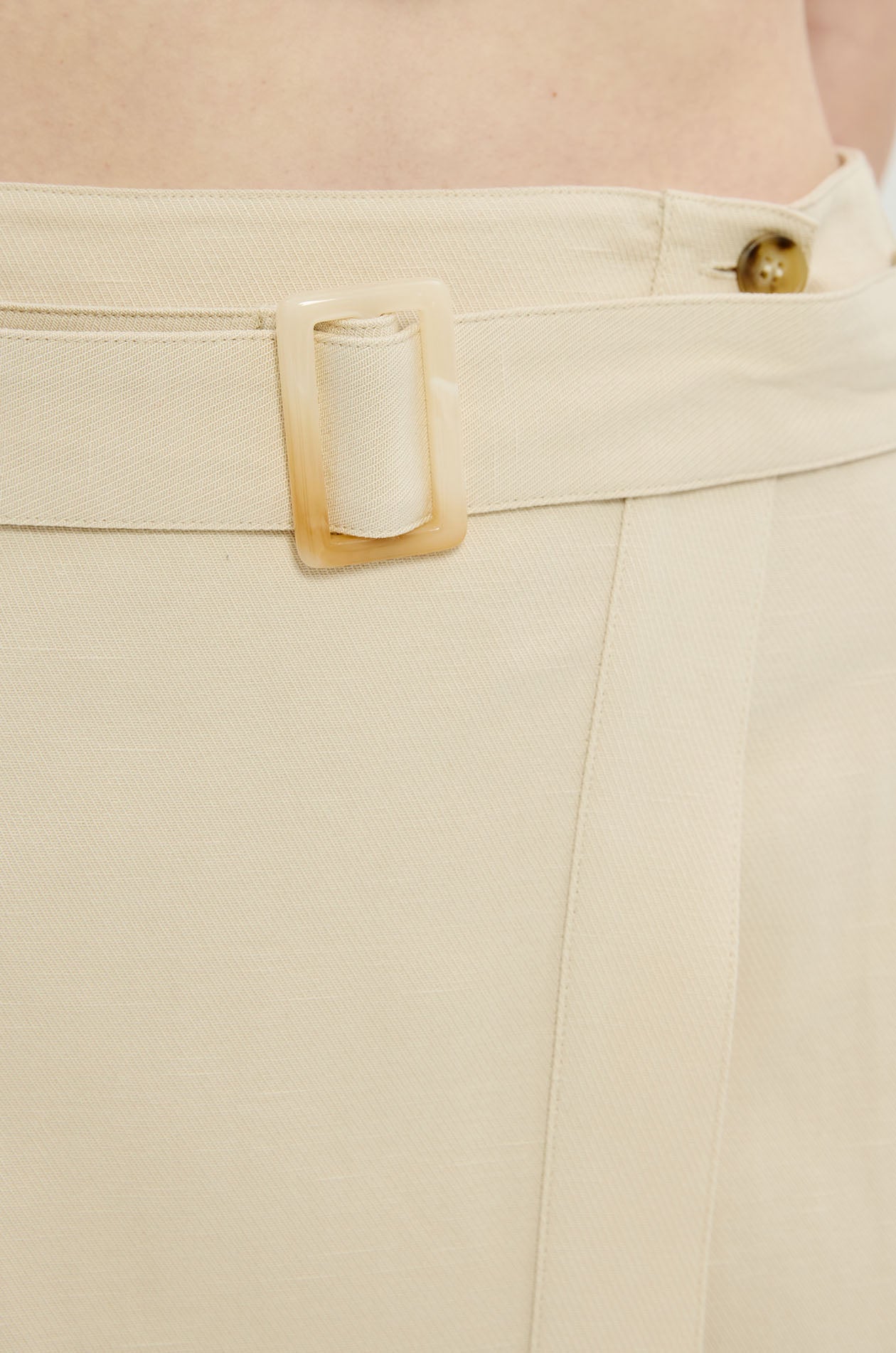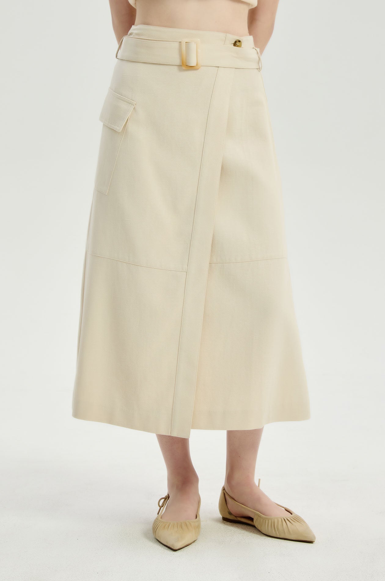 High-rise midi skirt in twill. A-line silhouette with a wrap design, cargo pocket, and matching belt. Front button closure. Available in light beige.