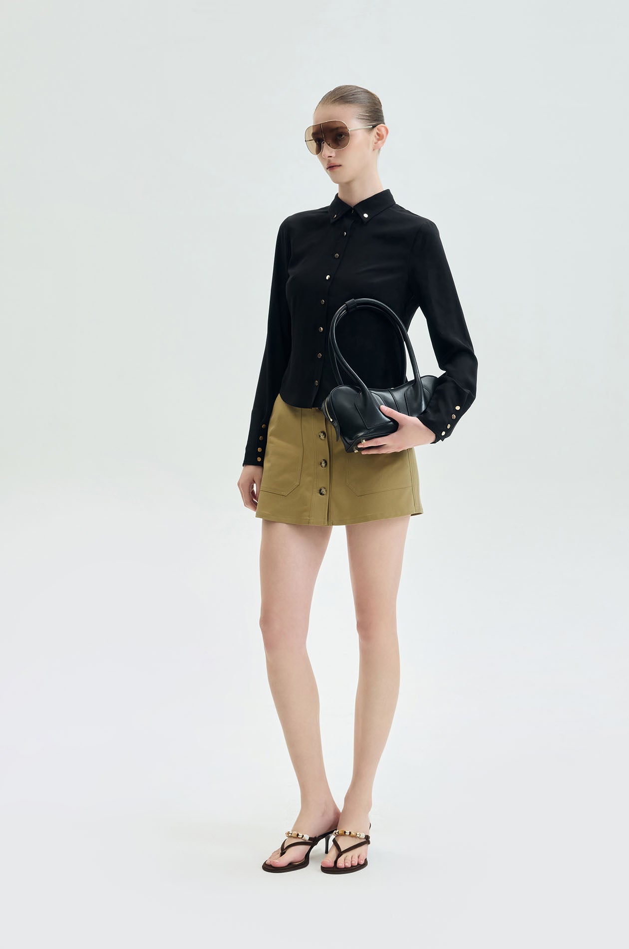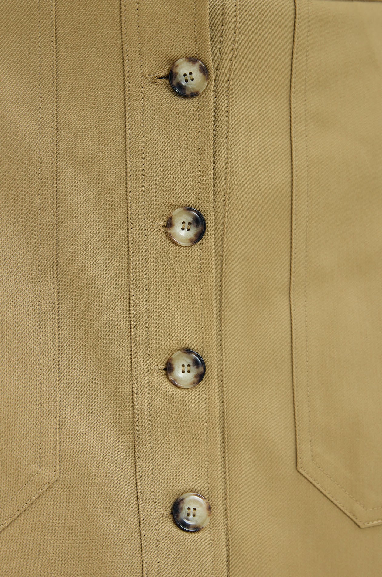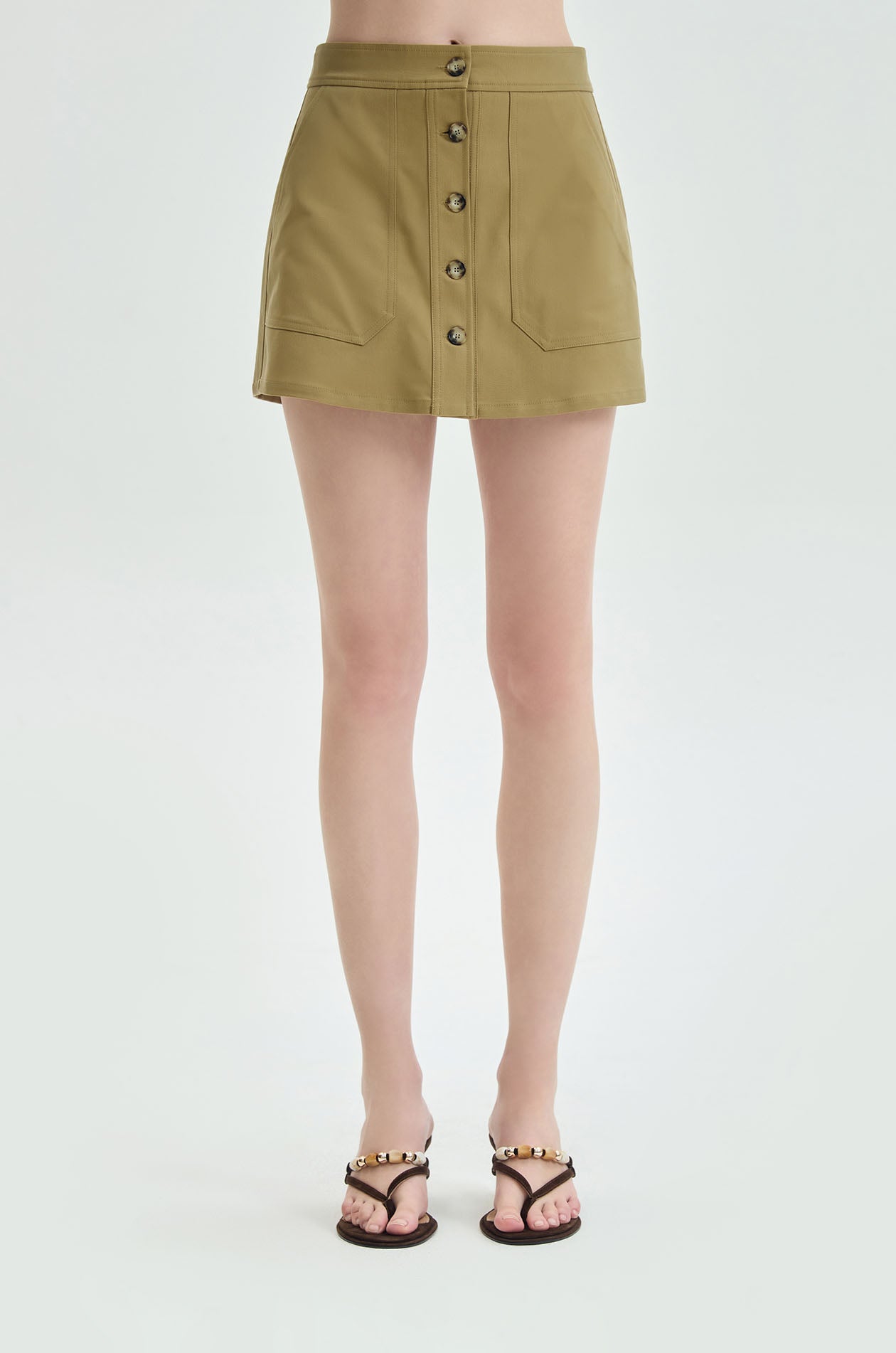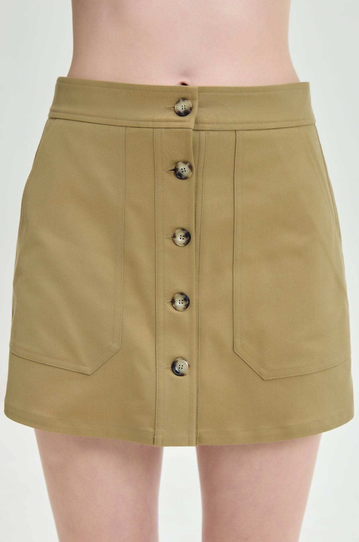 High‑rise skort crafted from structured twill with an A‑line silhouette. Features a front button‑through detail and oversized patch pockets for a structured utility look. Available in light olive brown.