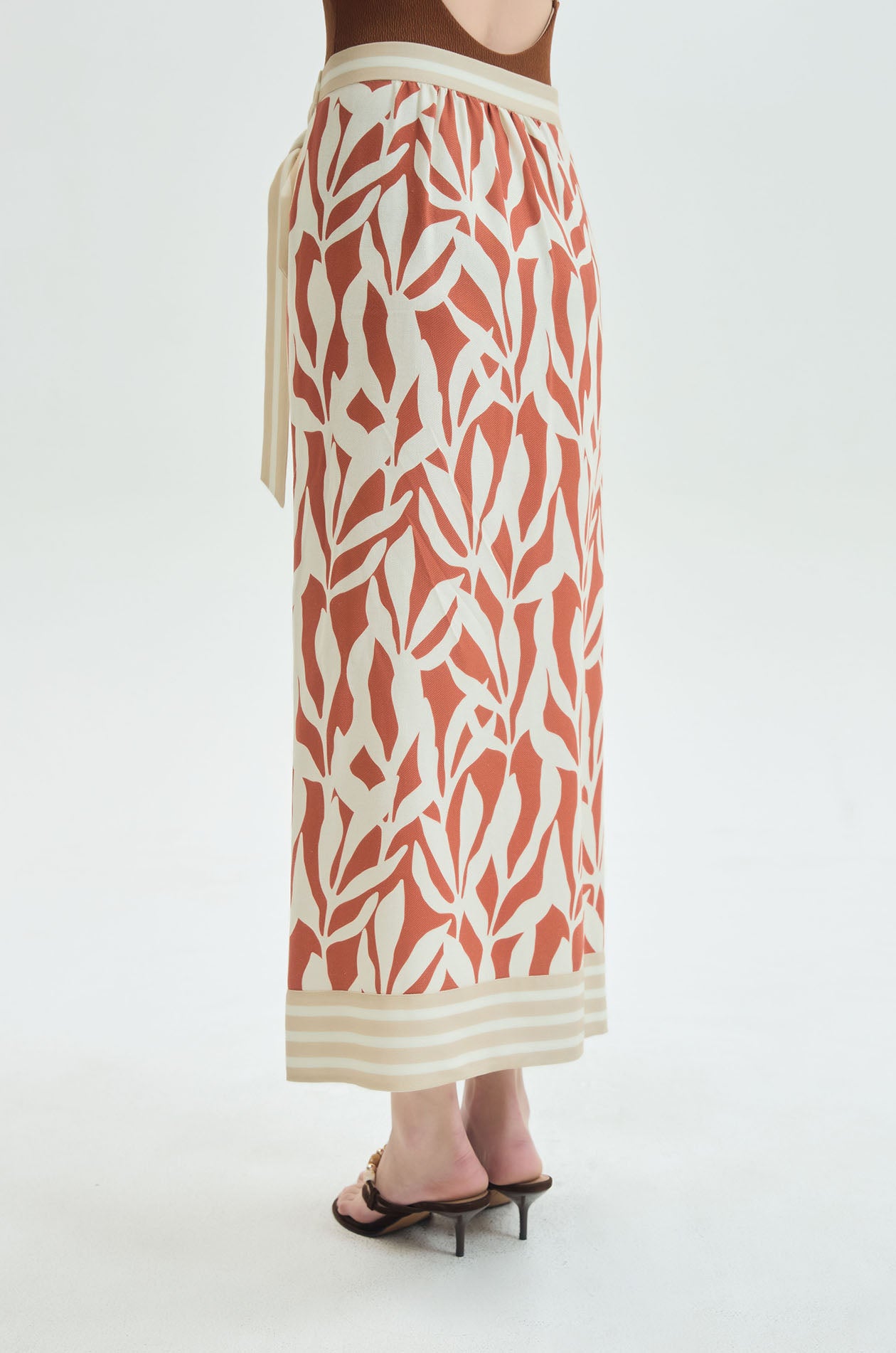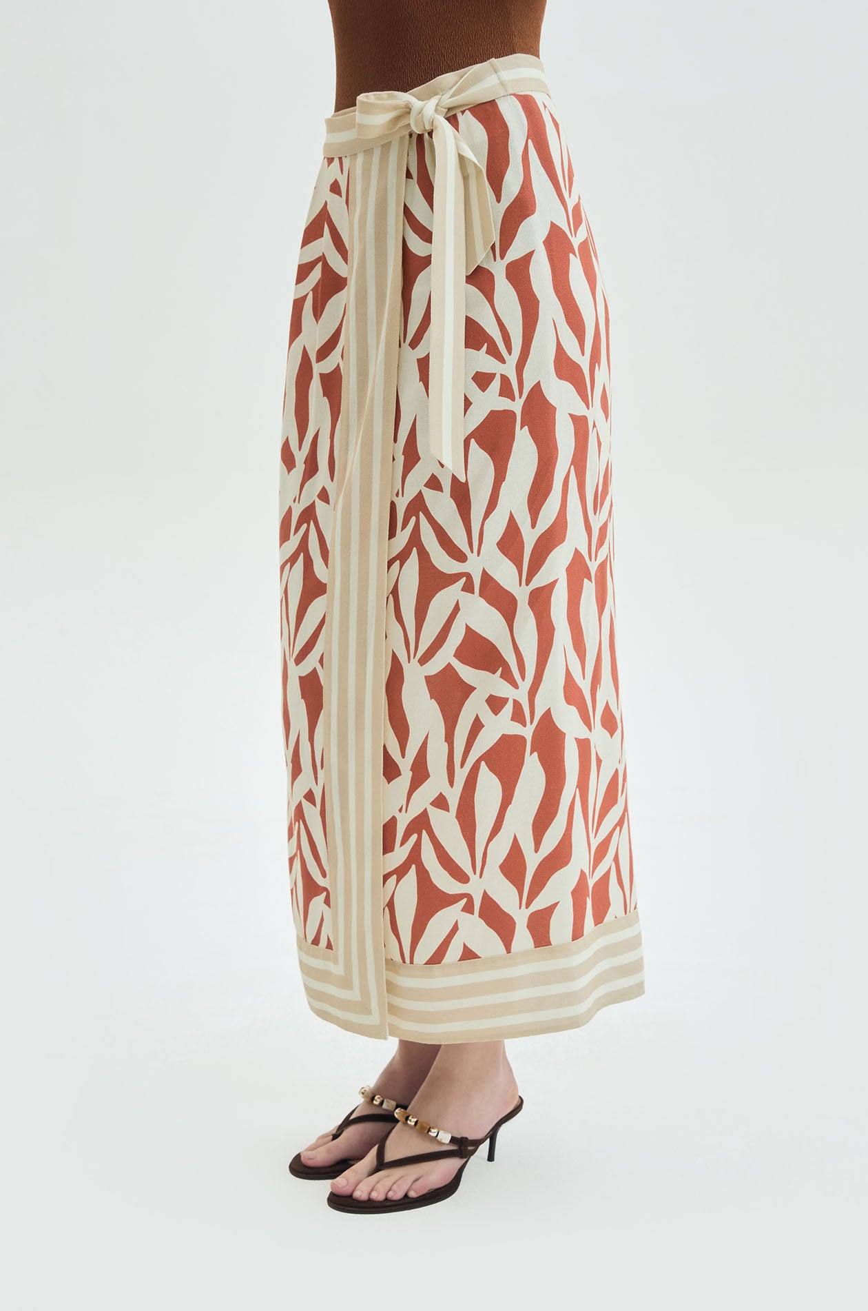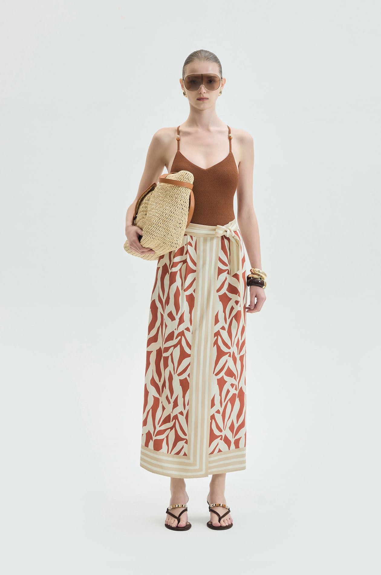 Mid‑rise midi pareo in a soft, silk‑like fabric with a flowing botanical print for effortless resort ease. Designed with striped edges and a wrapped design. Finished with a knot‑tie waistband for a relaxed touch. Available in orange.