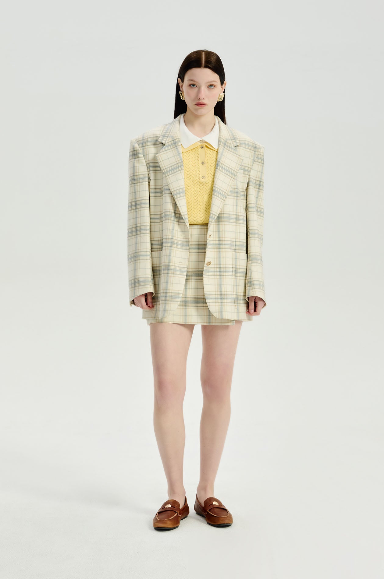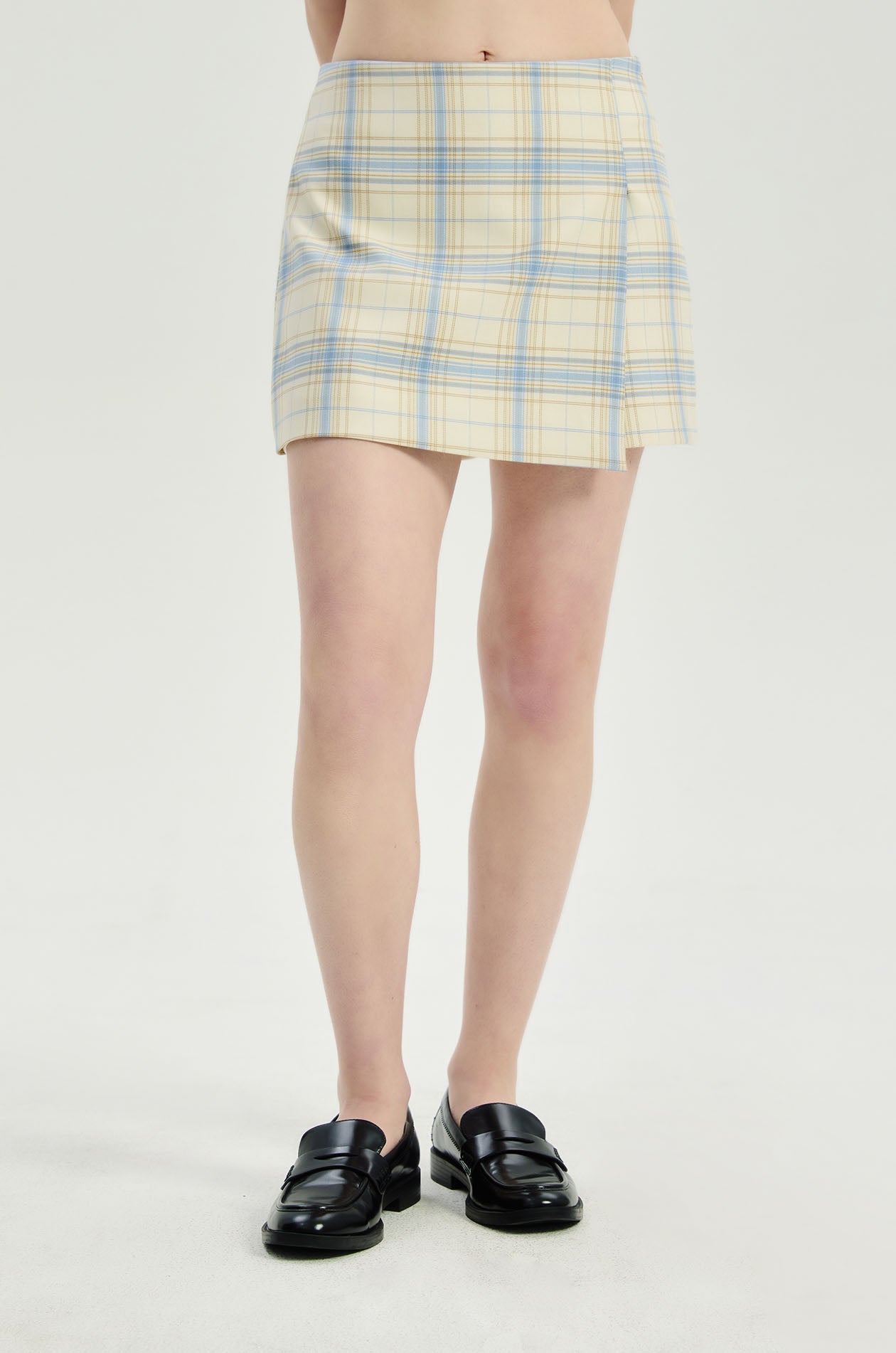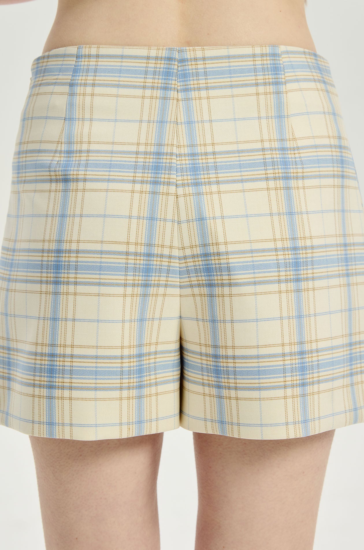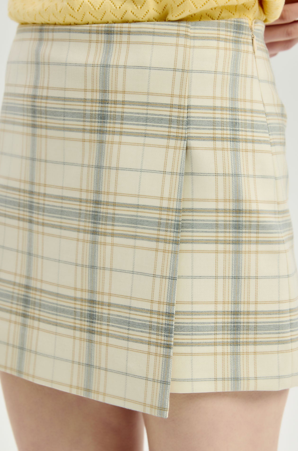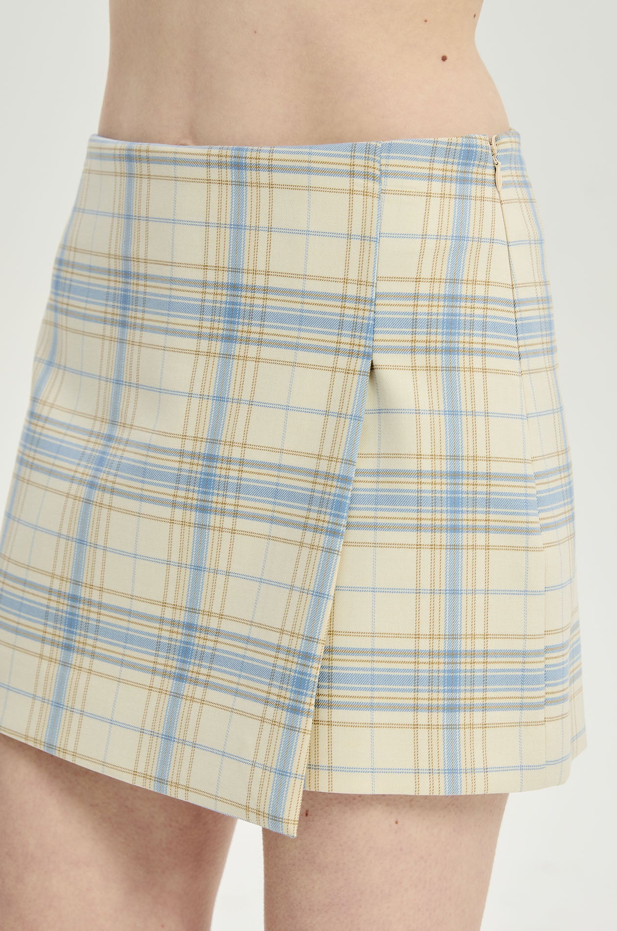High‑rise skort in structured suiting fabric with a plaid pattern, designed with a clean wrap‑front effect for a polished finish. Features an A‑line silhouette and a side zip for ease of wear. Available in pastel yellow/pastel blue and pastel yellow/pastel grey.