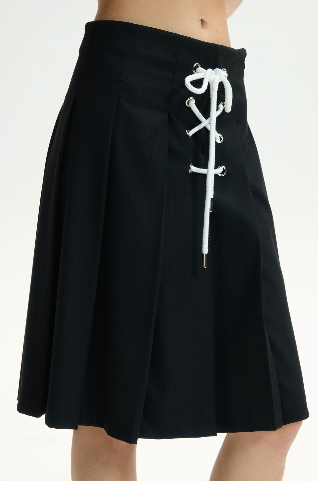 Mid-rise midi skirt crafted from woven fabric. Designed in a flared silhouette with full pleats that create soft movement. Finished with a lace‑up detail at the waistband for a subtle refined touch. Available in black.