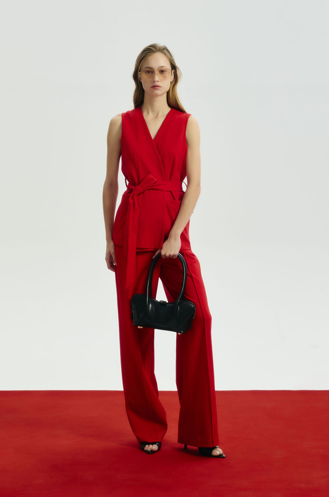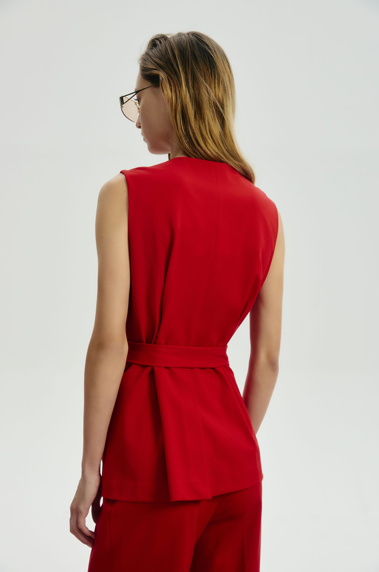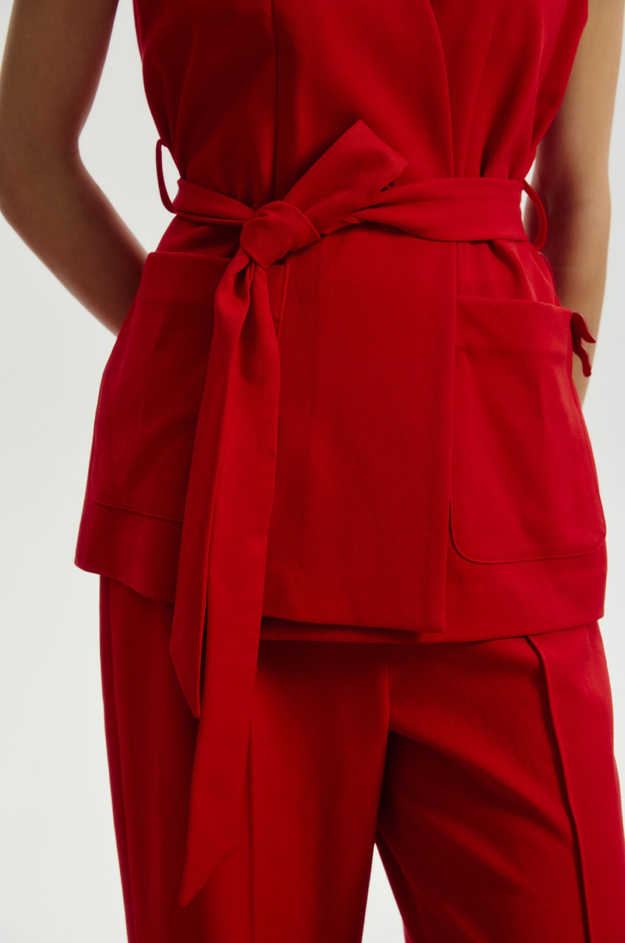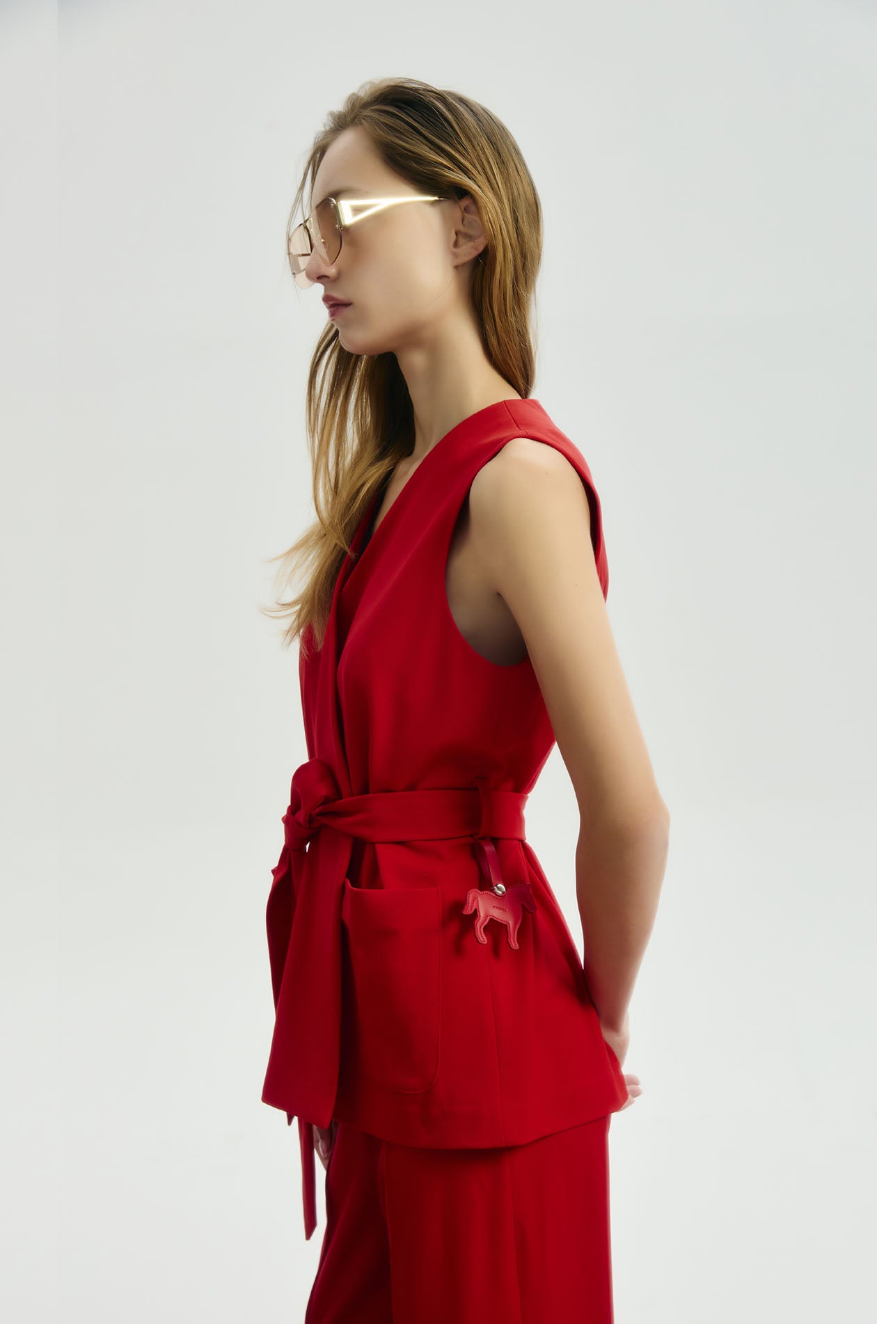 Sleeveless casual blazer in crepe twill. Collarless design, front pockets, and waist tie with faux leather horse charm. Open-front style. Available in Chinese Red.