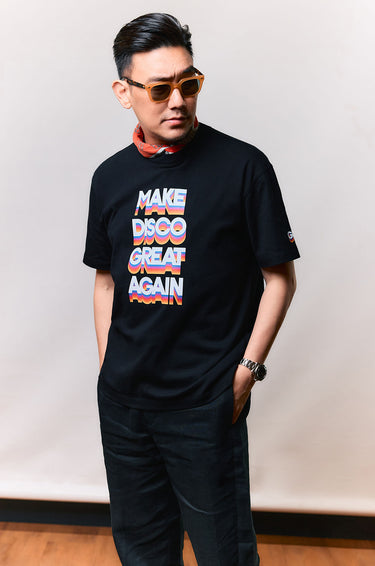 Short-sleeved t-shirt in cotton jersey. Layered typography print gives this cap a vibe of Retro Futuristic. Relax fit. Available in black.