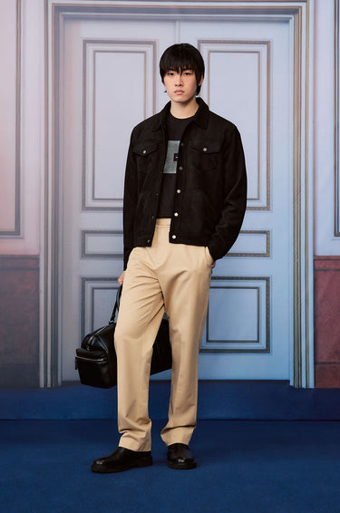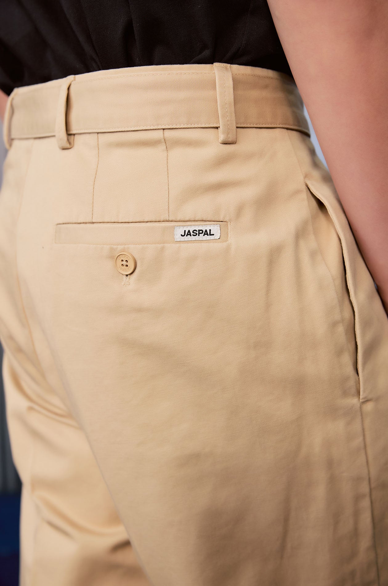Mid-rise pants in cotton chino fabric. Straight legs with side and back pockets. Matching fabric belt. Front button and zip closure. Available in beige.