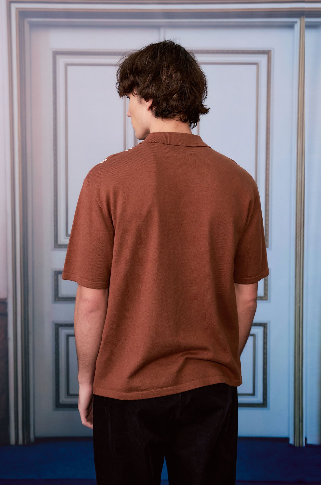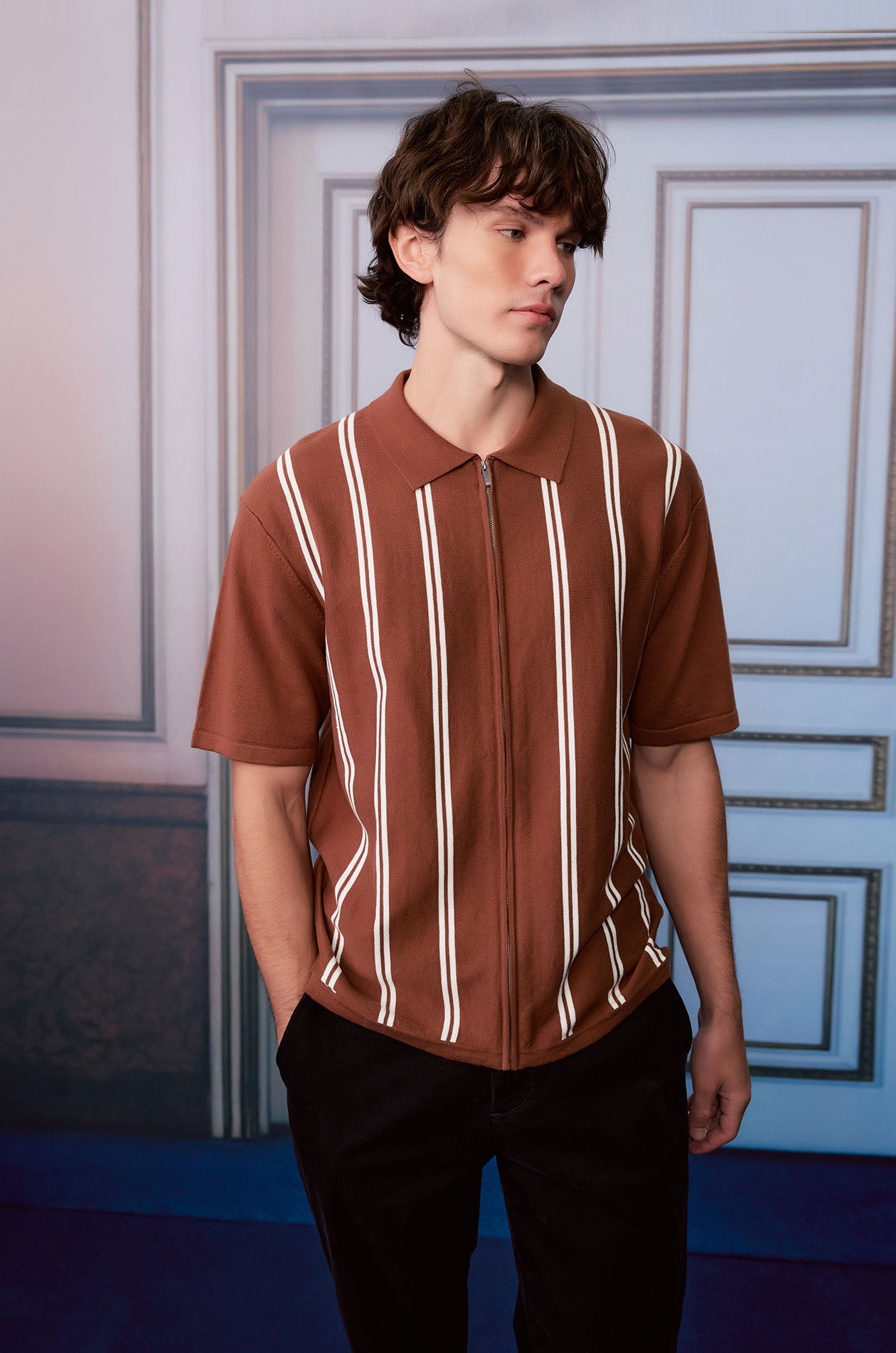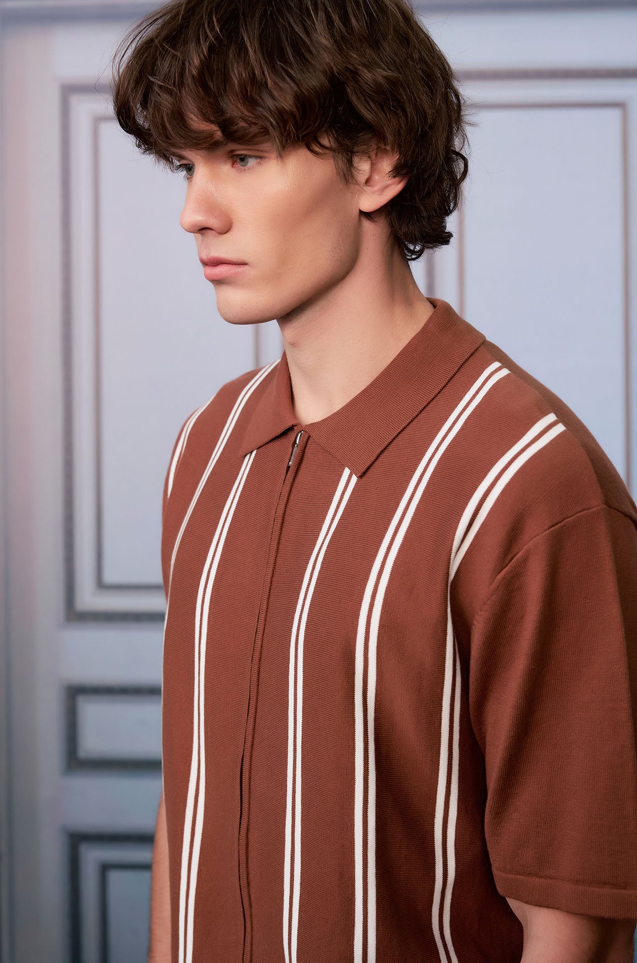 Short-sleeved shirt in cotton knit fabric. Relaxed fit with spread collar and contrast stripes. Full zip closure. Available in brown and navy.