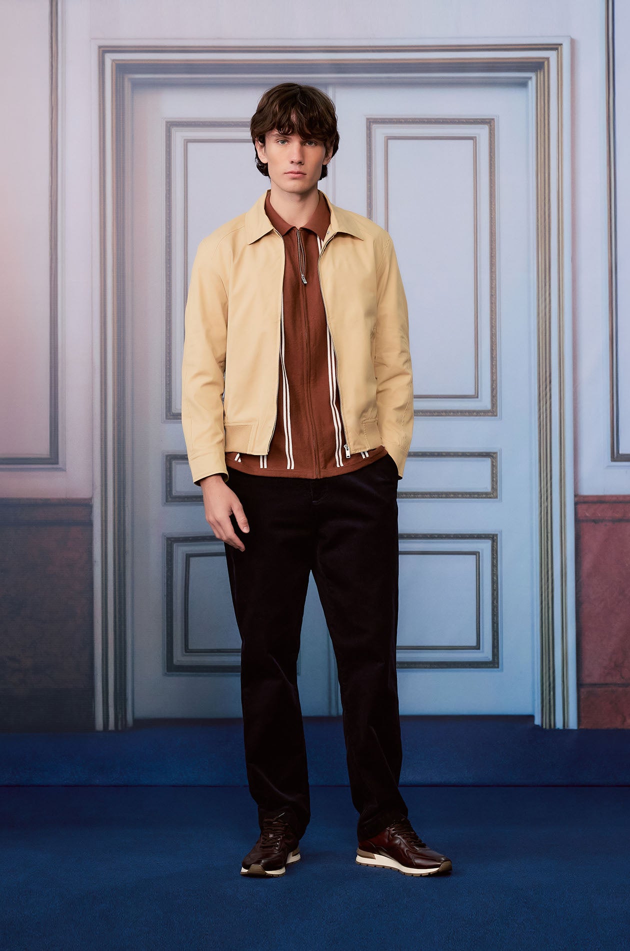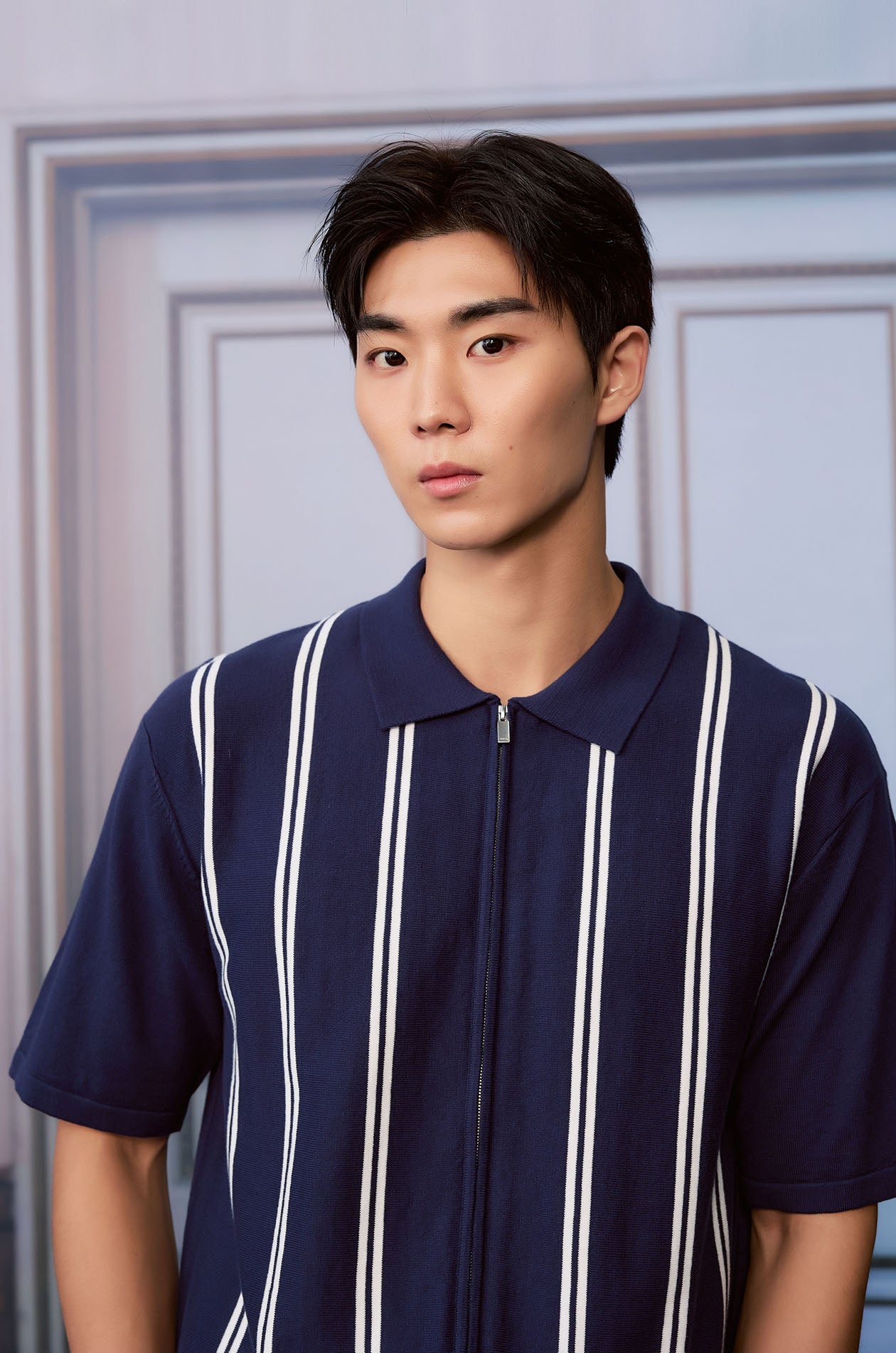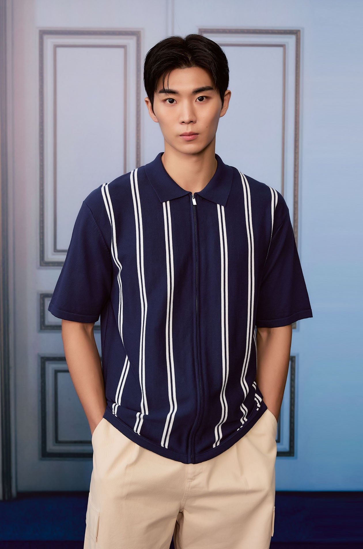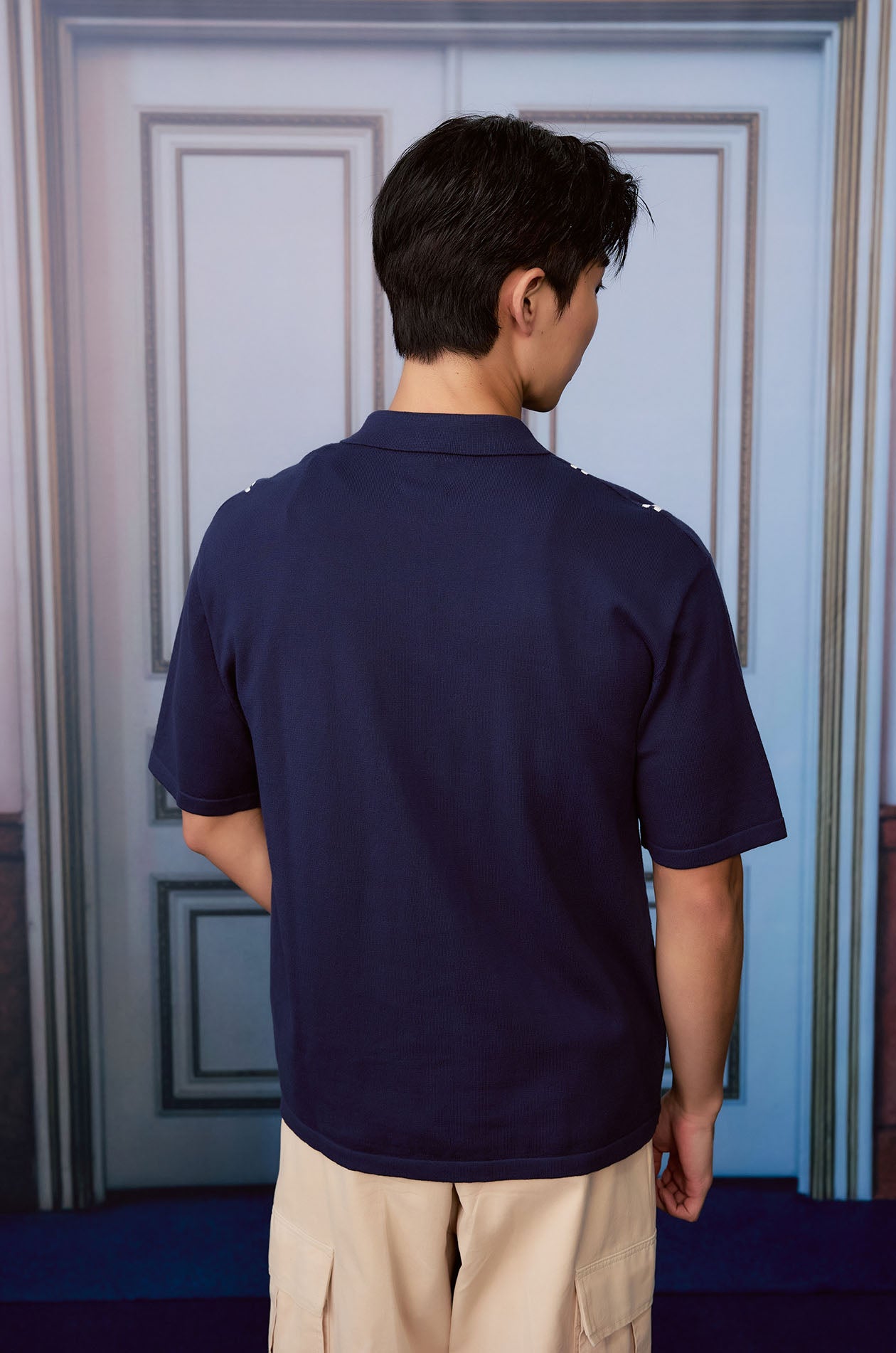 Short-sleeved shirt in cotton knit fabric. Relaxed fit with spread collar and contrast stripes. Full zip closure. Available in brown and navy.