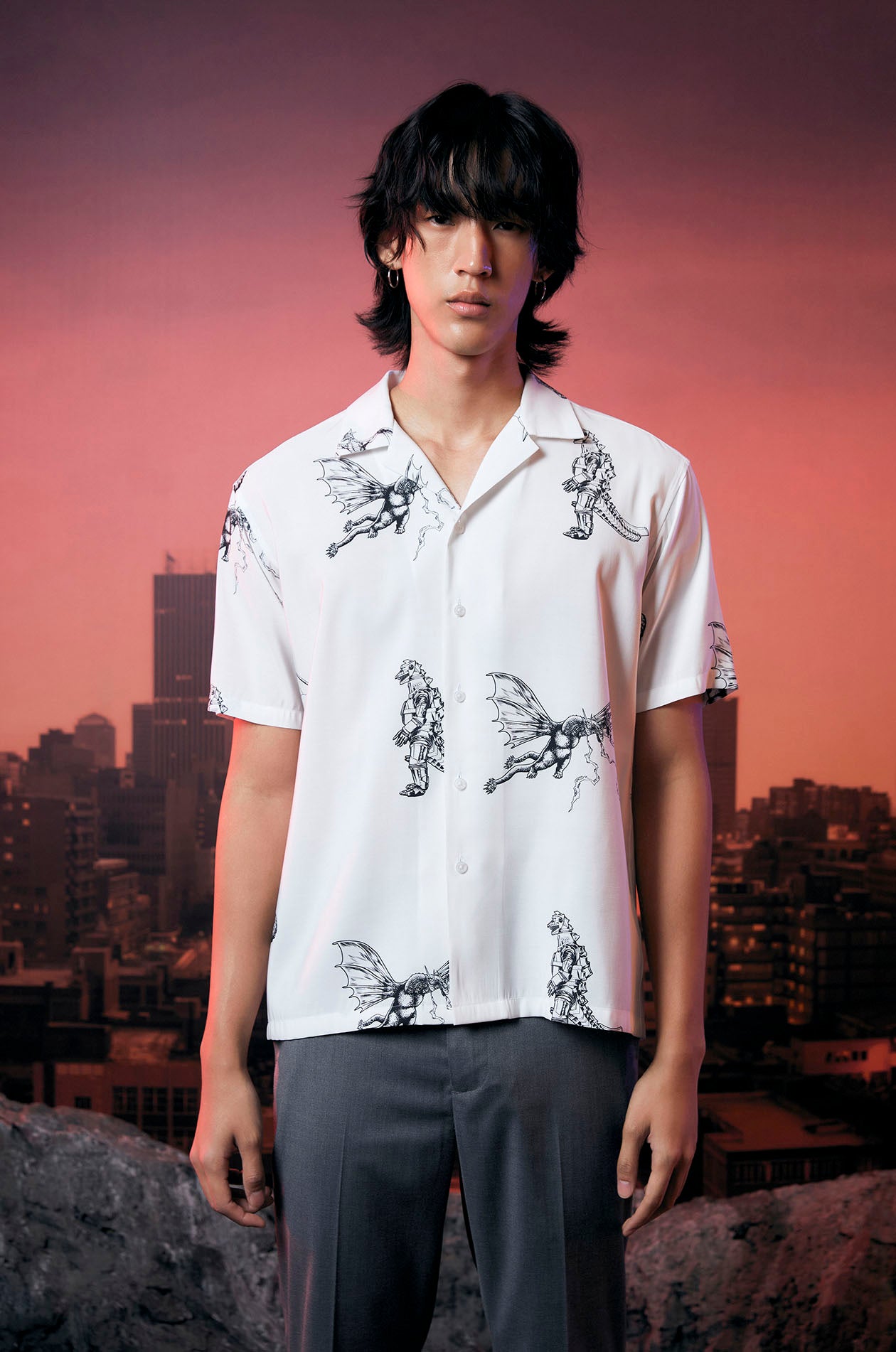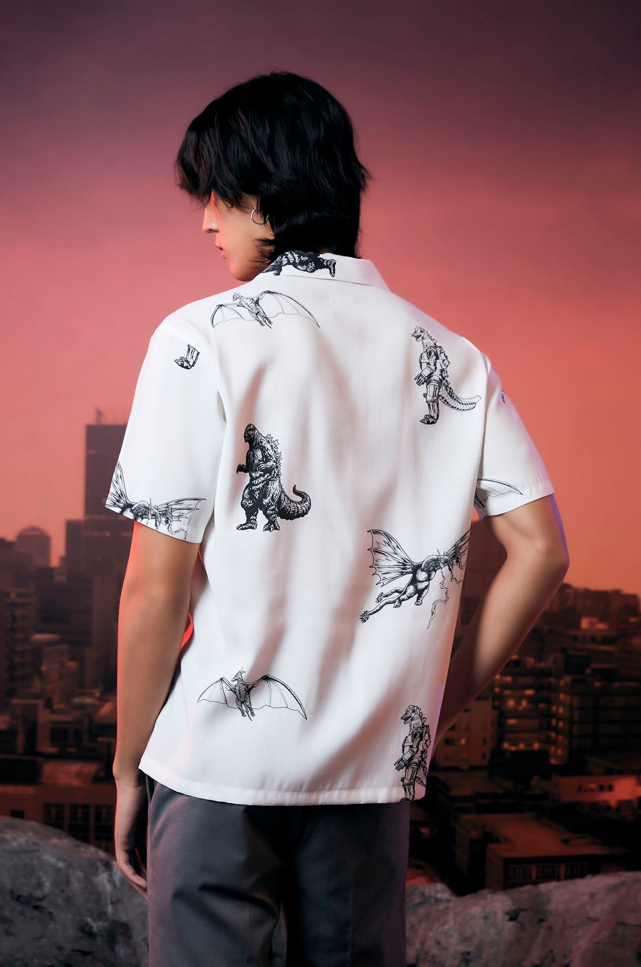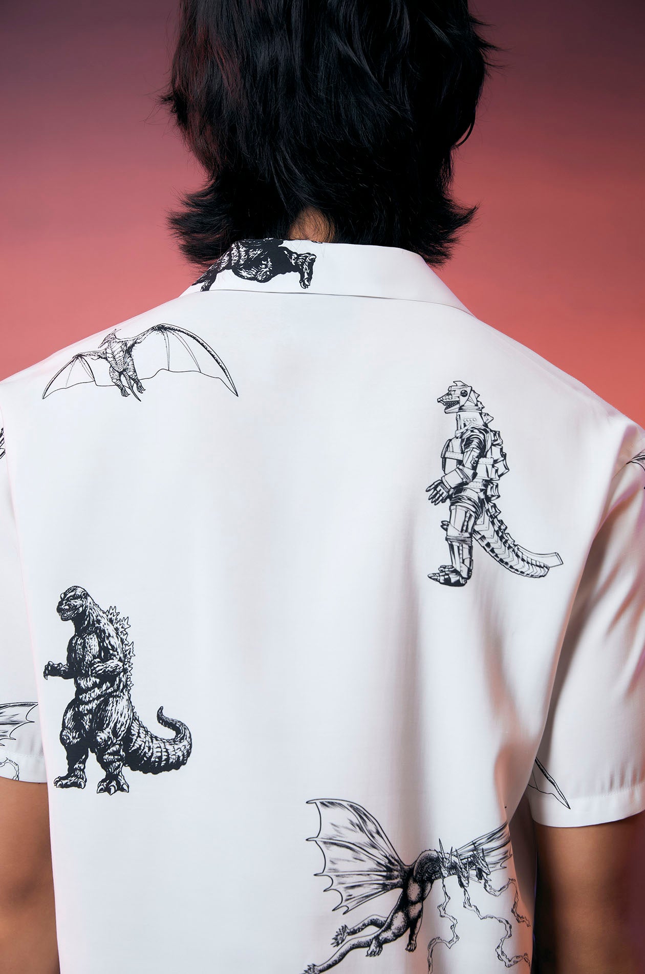 Step into Kaiju chaos with this short-sleeved resort shirt, crafted from viscose blend. Features a bold Godzilla character print. Designed with a regular fit and a camp collar. It’s the perfect fusion of vintage monster movie vibes and modern streetwear edge. Front button closure. Available in off-white.