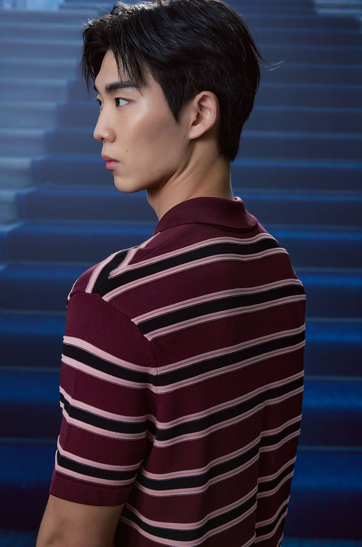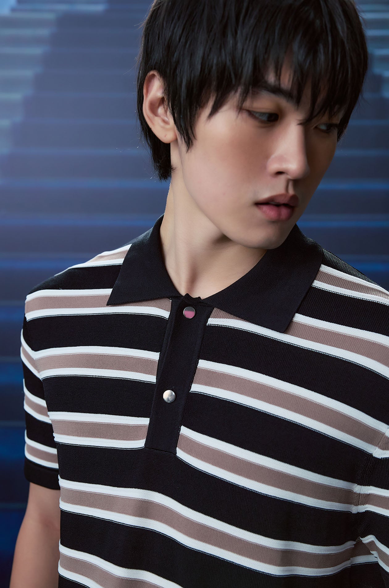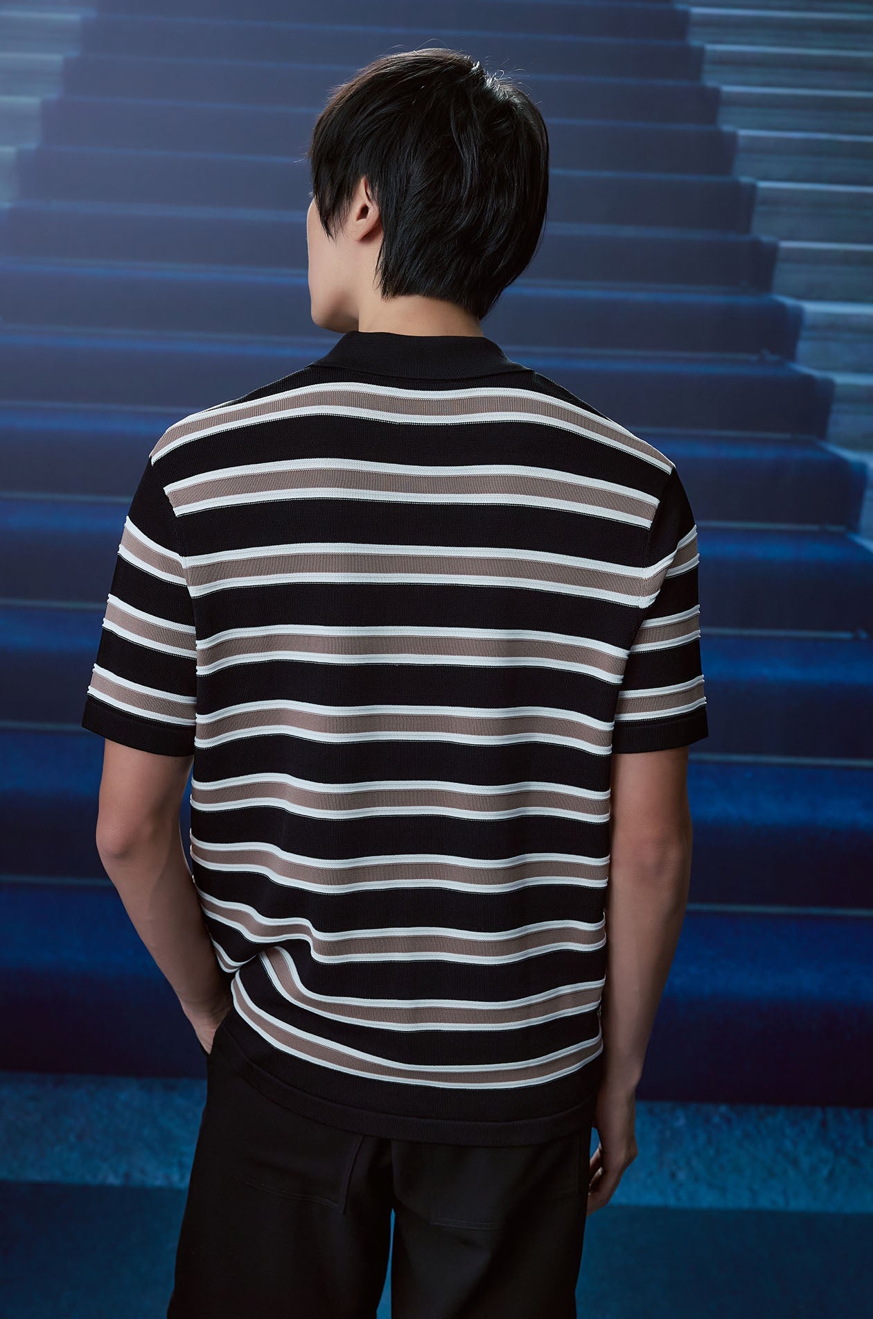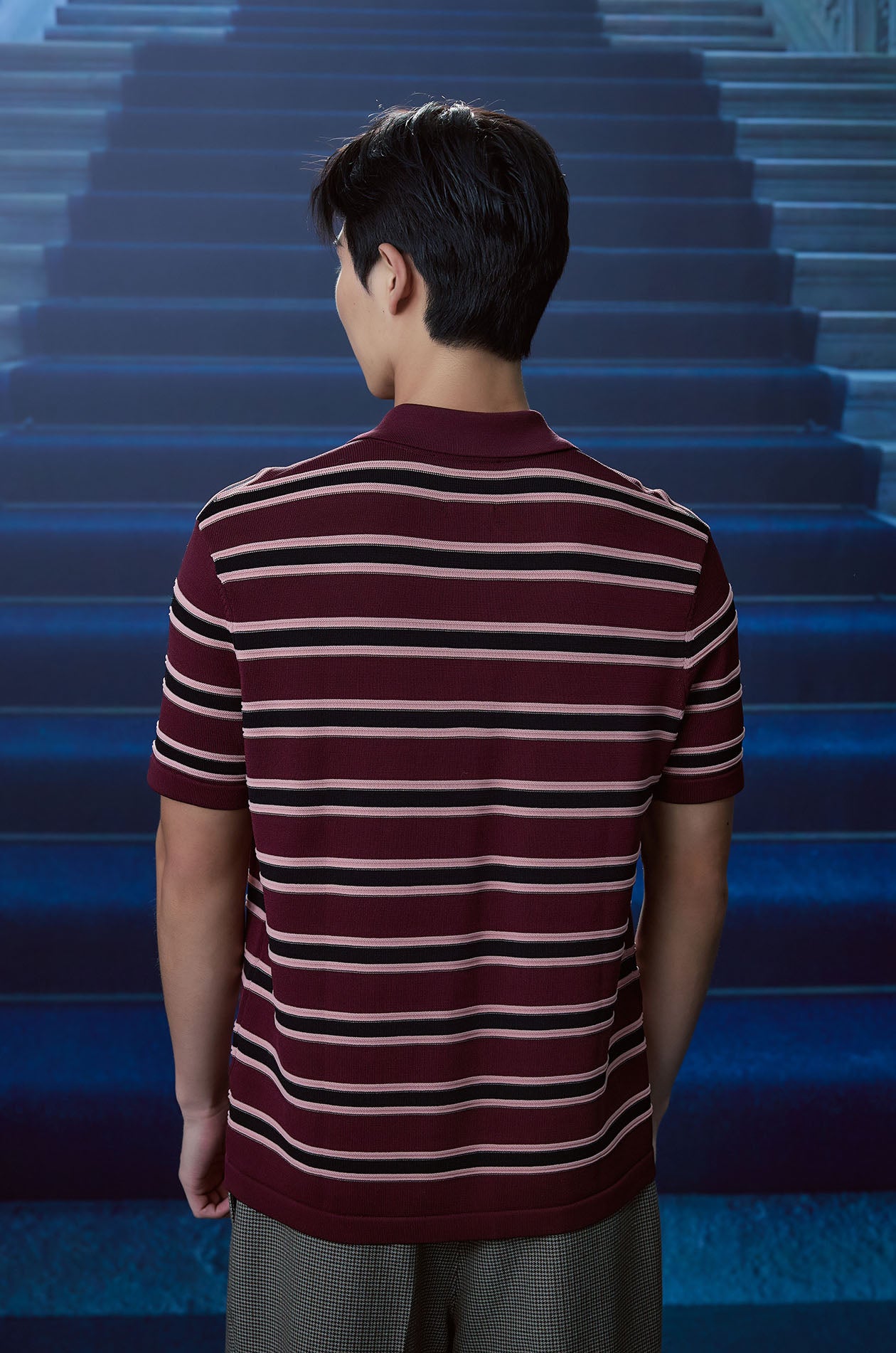 Short-sleeved polo shirt in knit fabric with horizontal stripes. Relaxed fit with spread collar. Front button closure. Available in brown and maroon red.