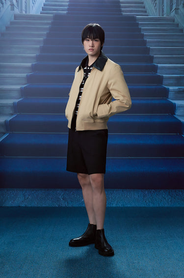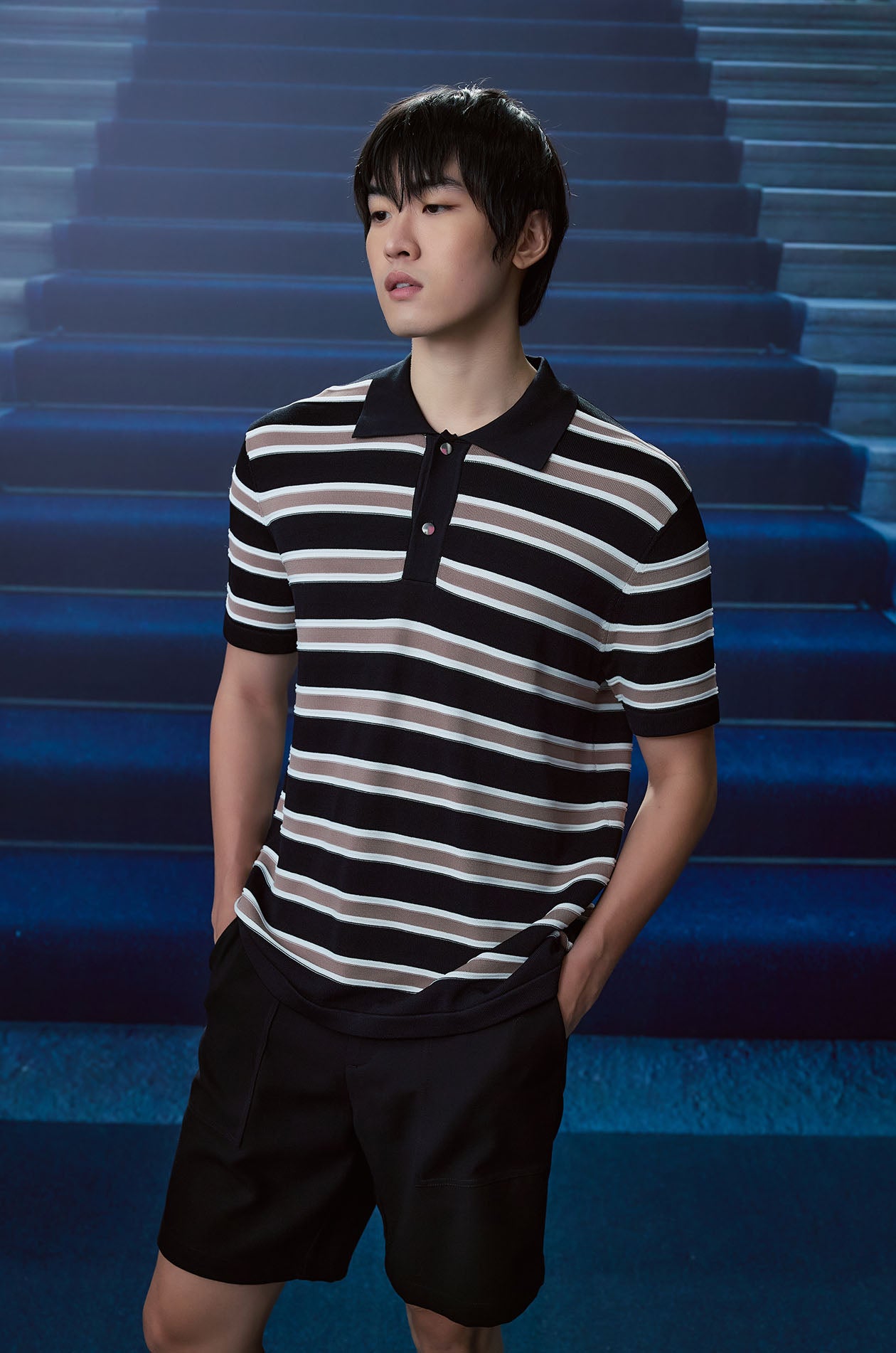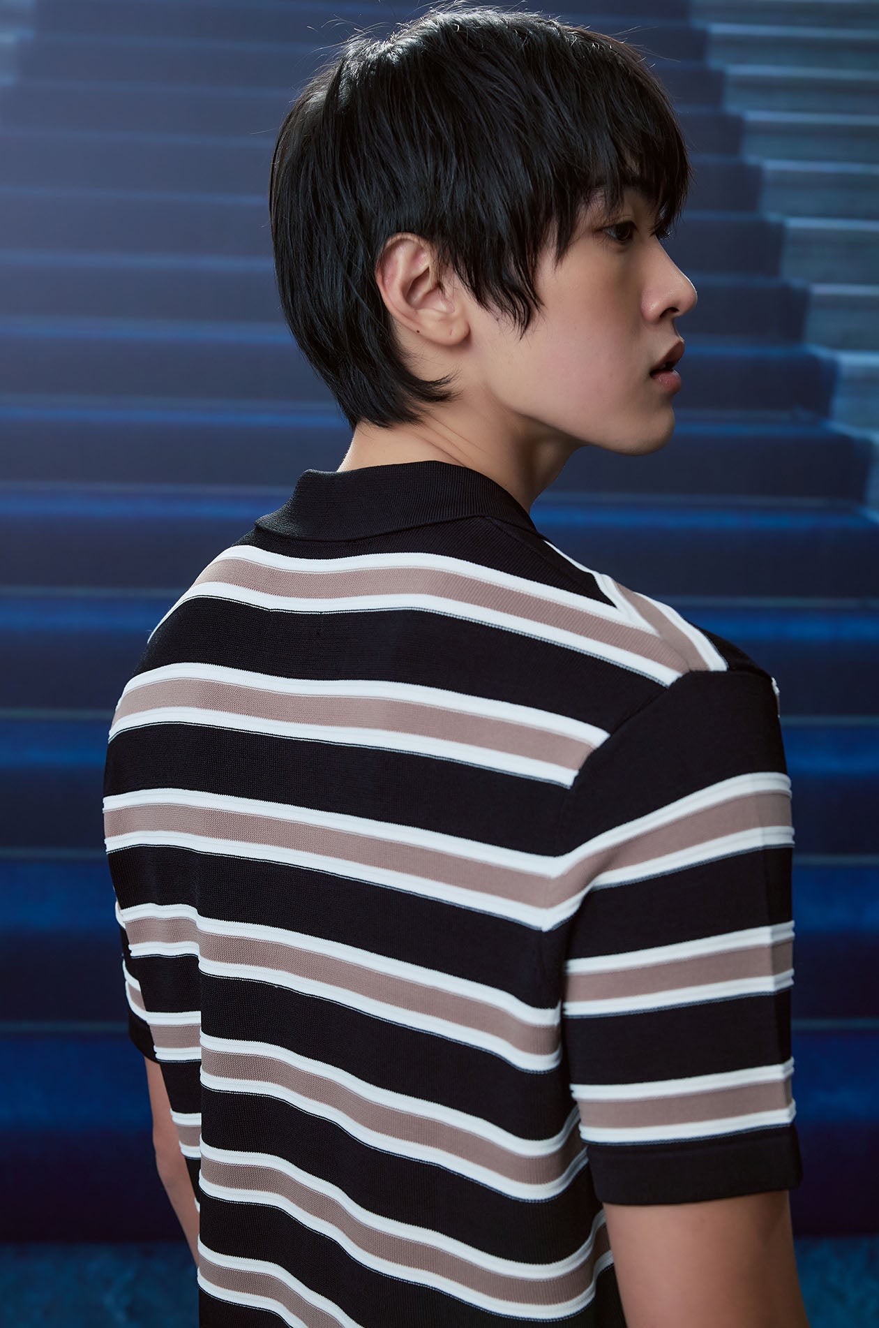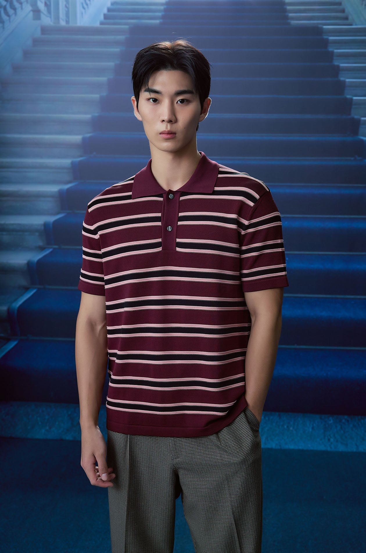Short-sleeved polo shirt in knit fabric with horizontal stripes. Relaxed fit with spread collar. Front button closure. Available in brown and maroon red.