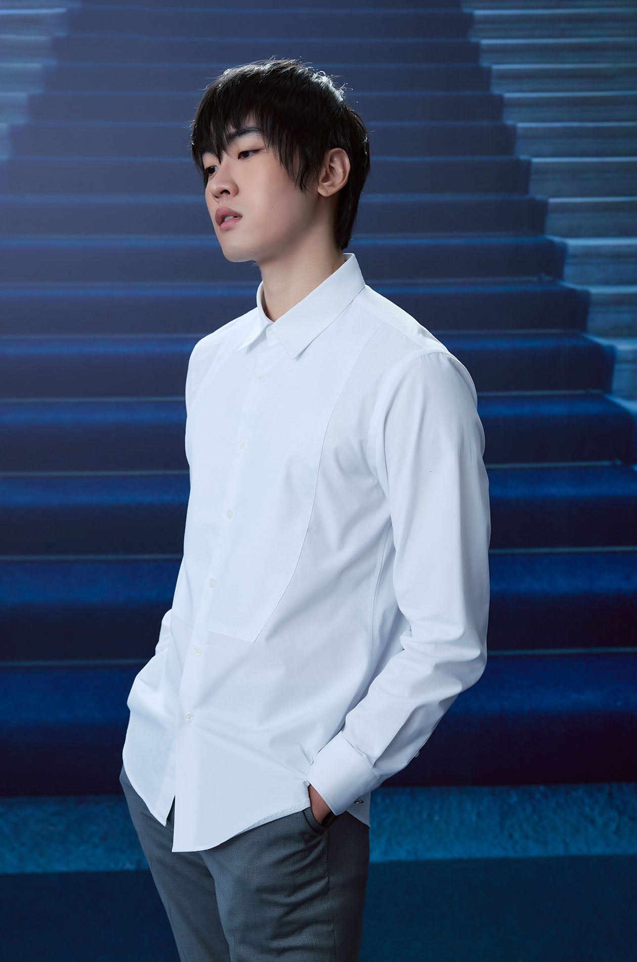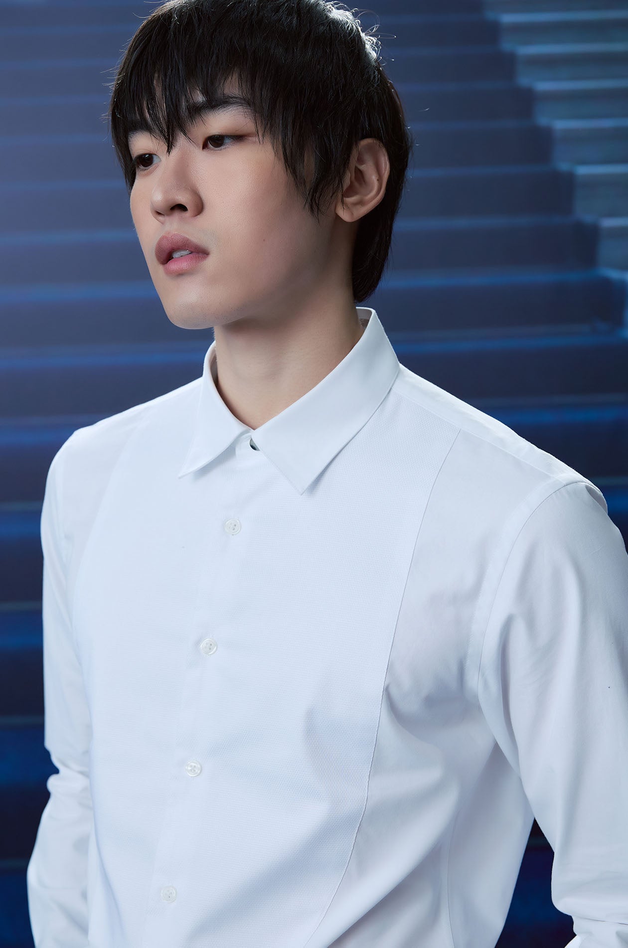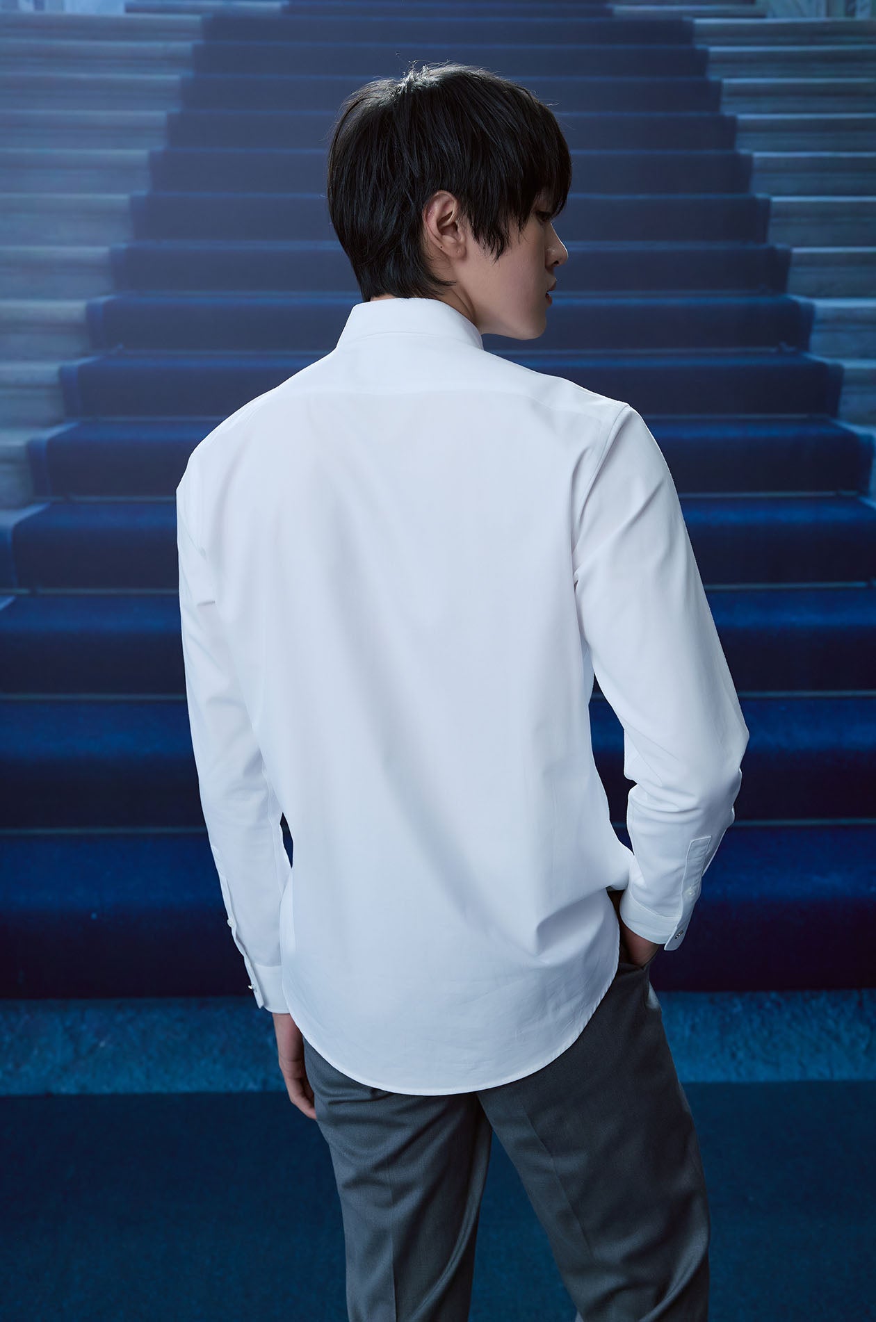 Long-sleeved shirt in cotton-blend poplin. Regular fit with classic collar and a bib panel. Front button closure. Available in white.