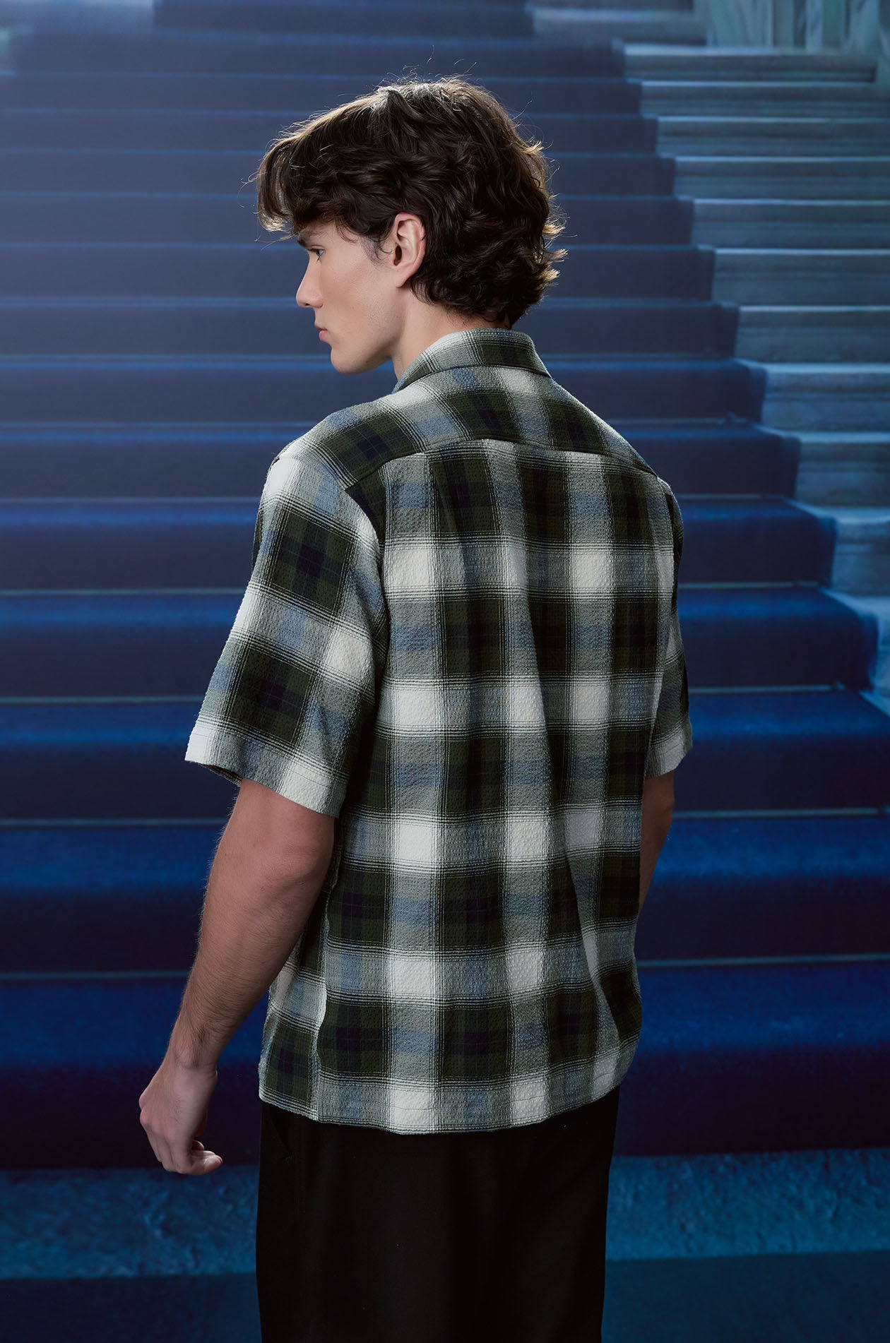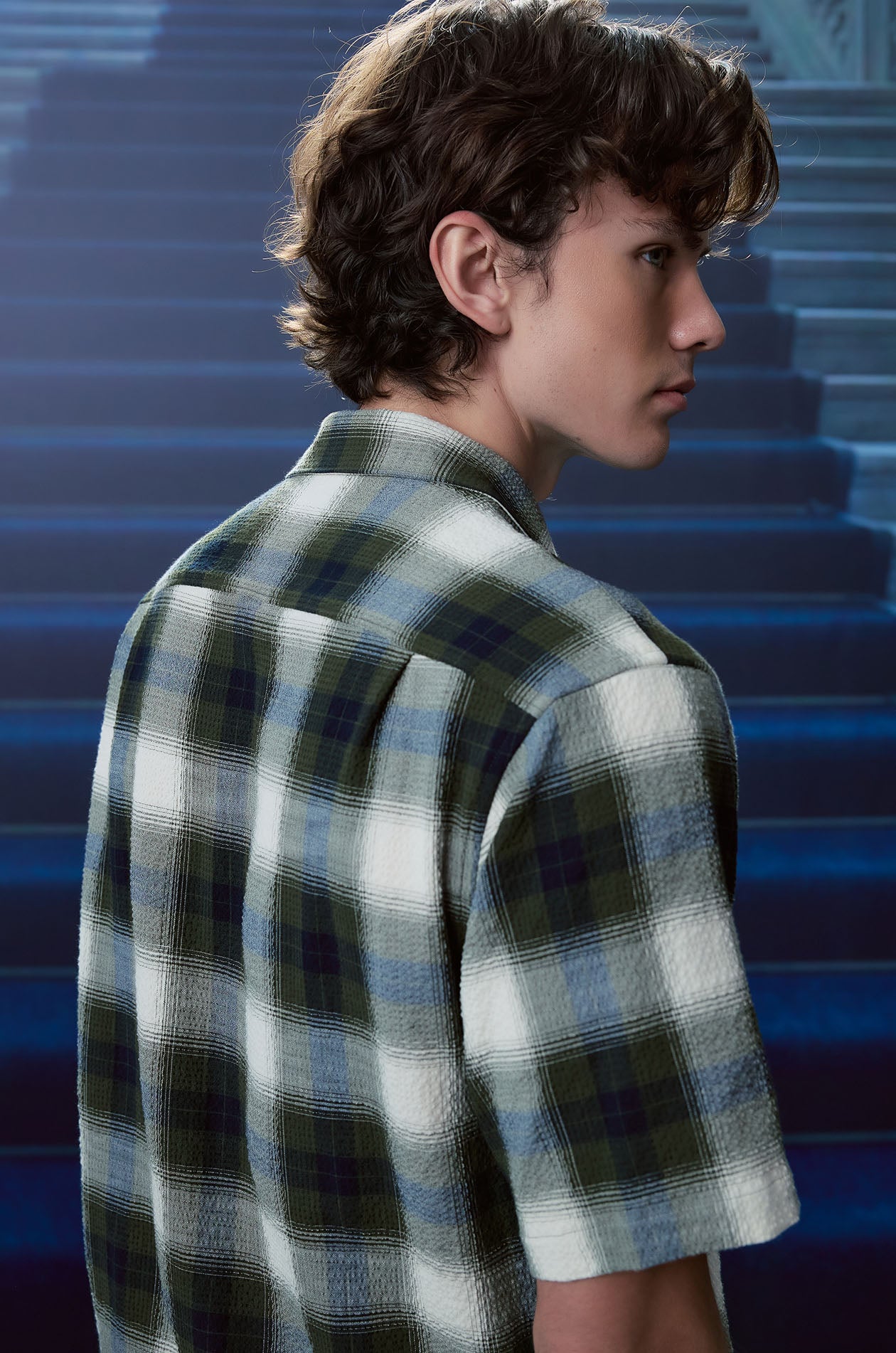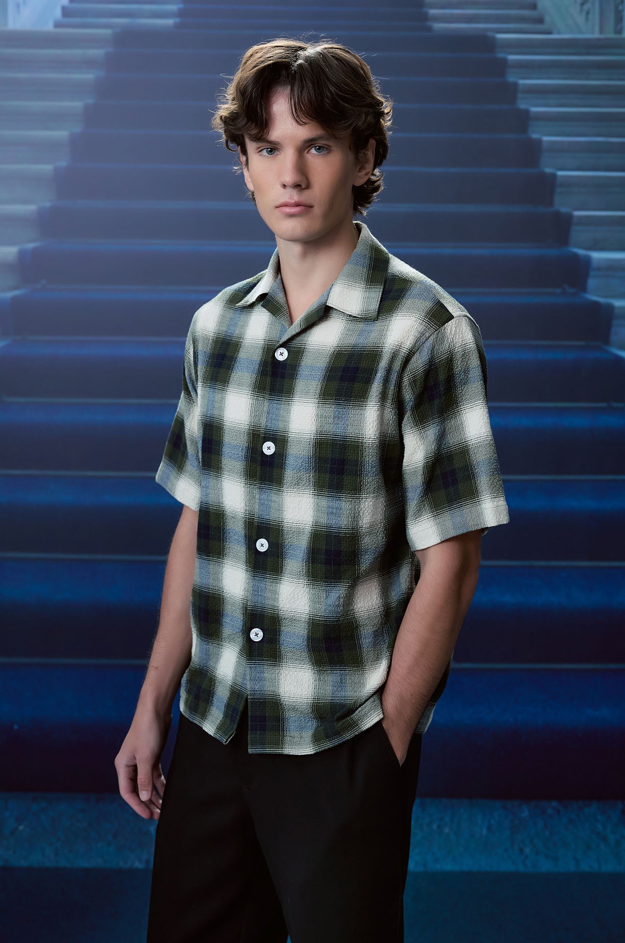Long-sleeved resort shirt in seersucker with plaid pattern. Relaxed fit with classic collar. Front button closure. Available in green.