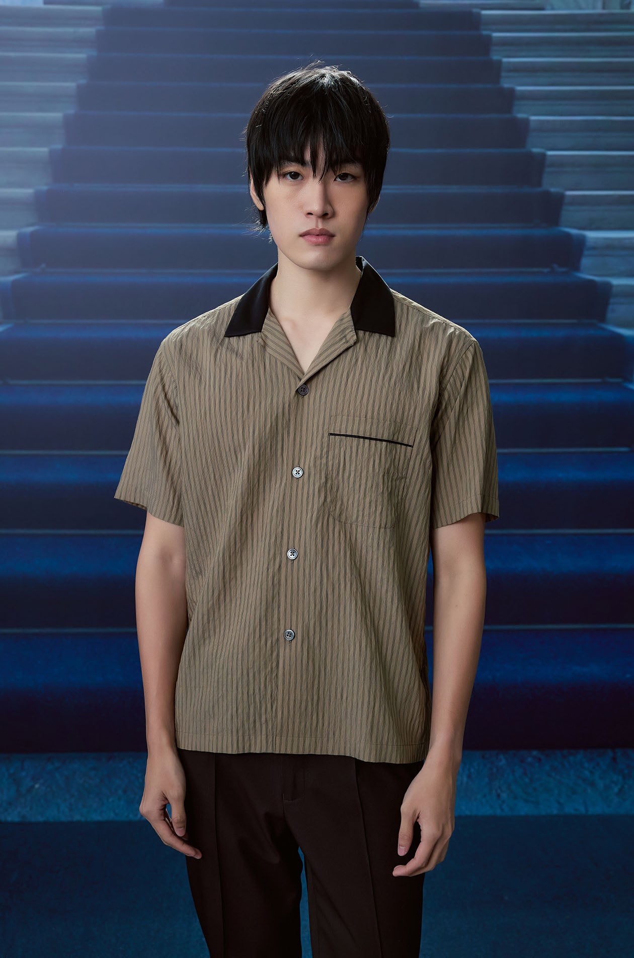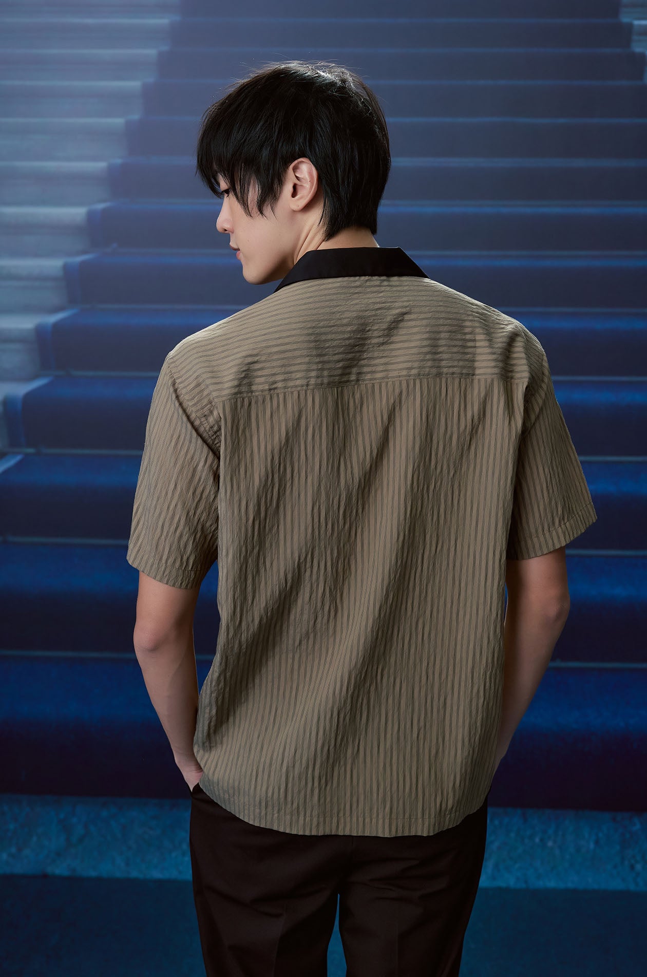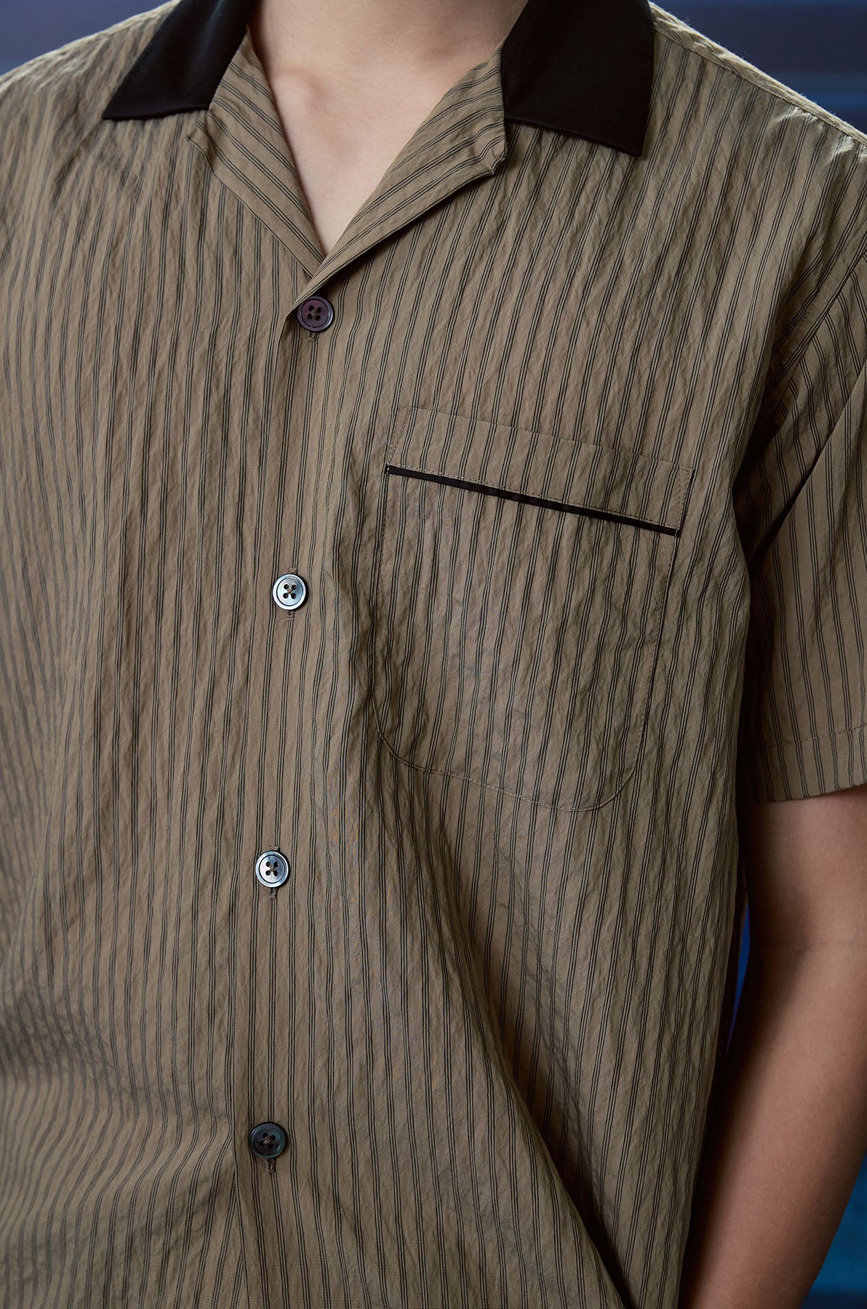 Short-sleeved resort shirt in TENCEL™ micro modal blend with crinkled effect. Regular fit with contrast camp collar and chest pockets. Front button closure. Available in khaki.
