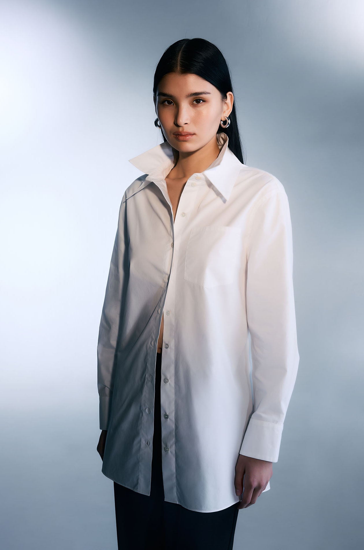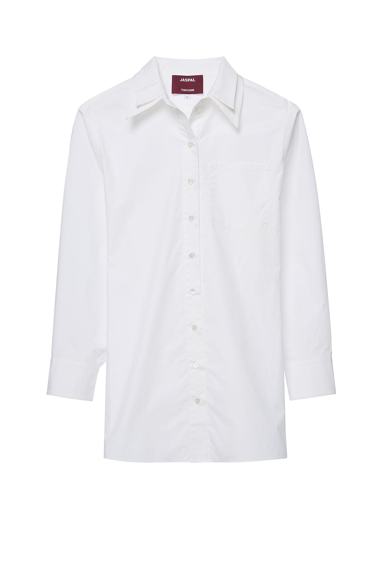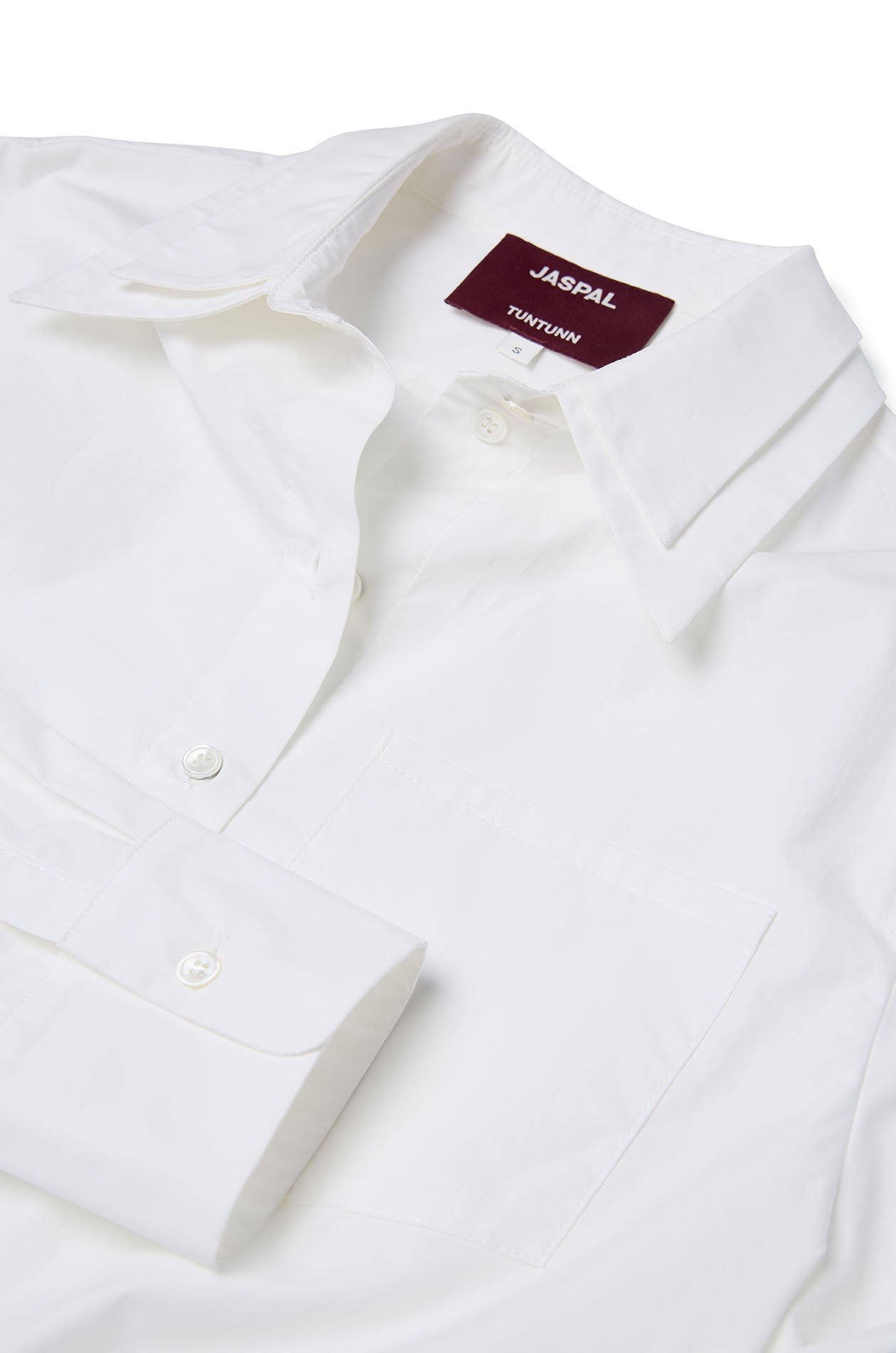 Jaspal X TunTunn | Long-sleeved shirt in cotton poplin. Drop shoulder silhouette with double collars, chest pocket, and tapered waistline. Front button closure. Available in white.