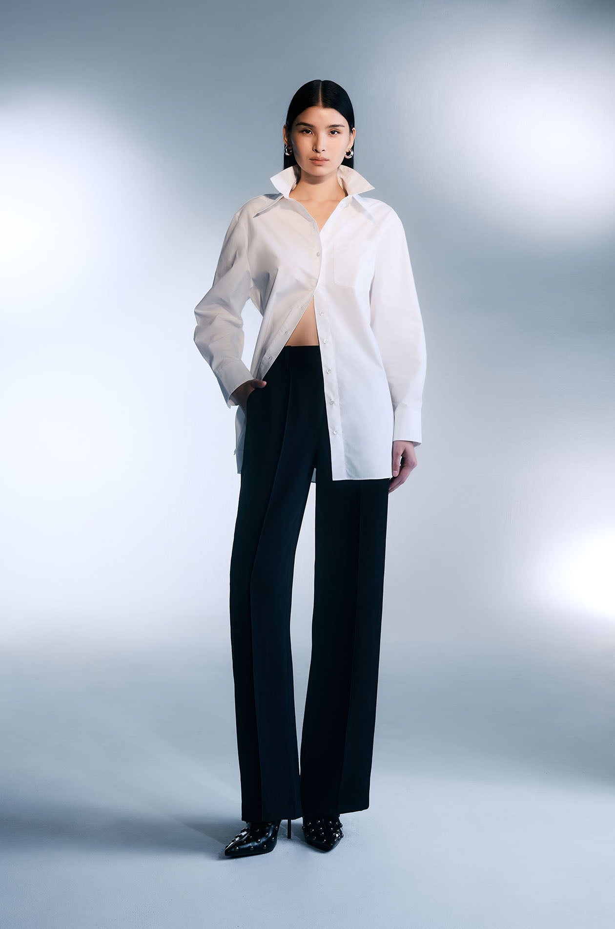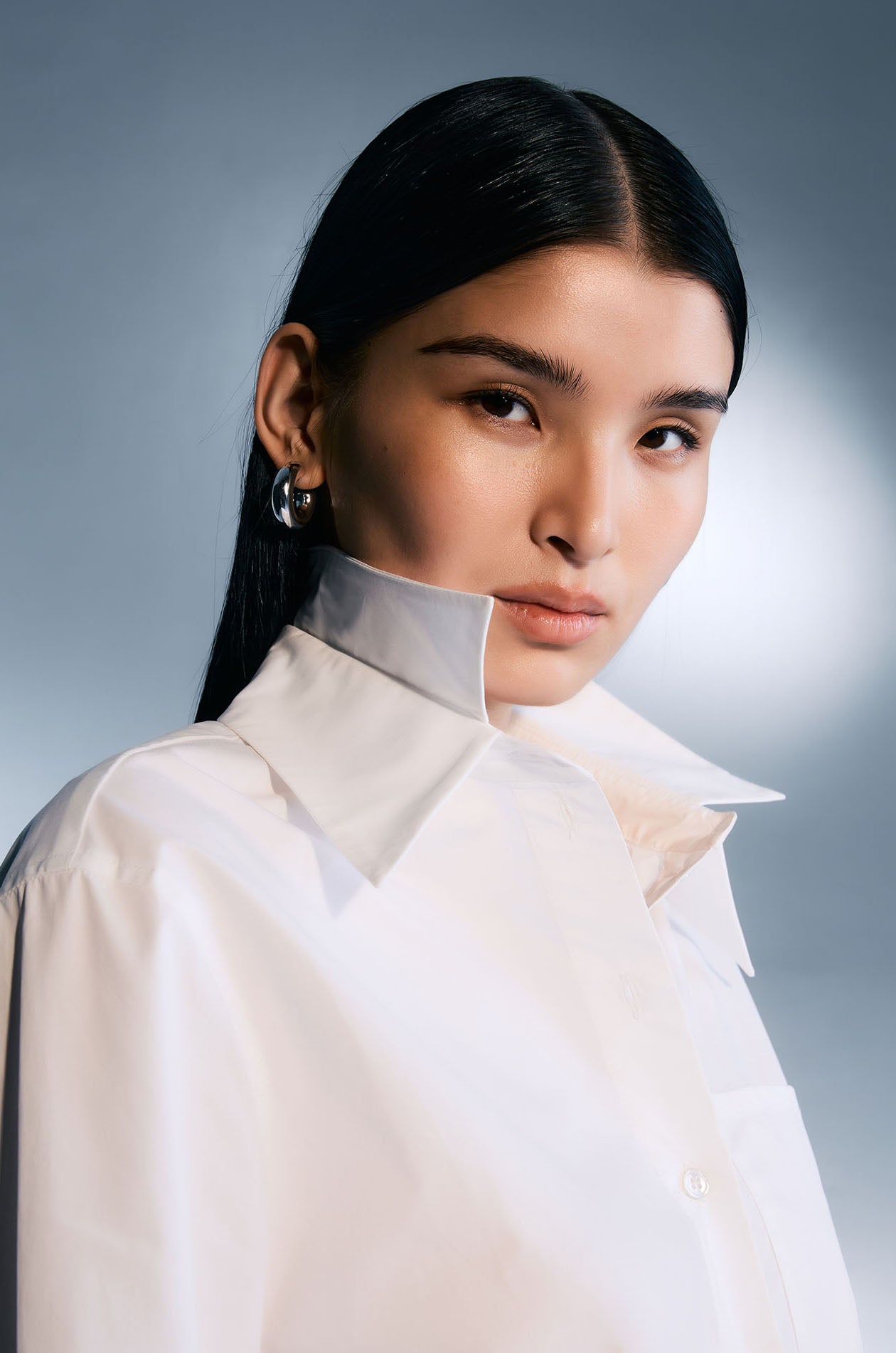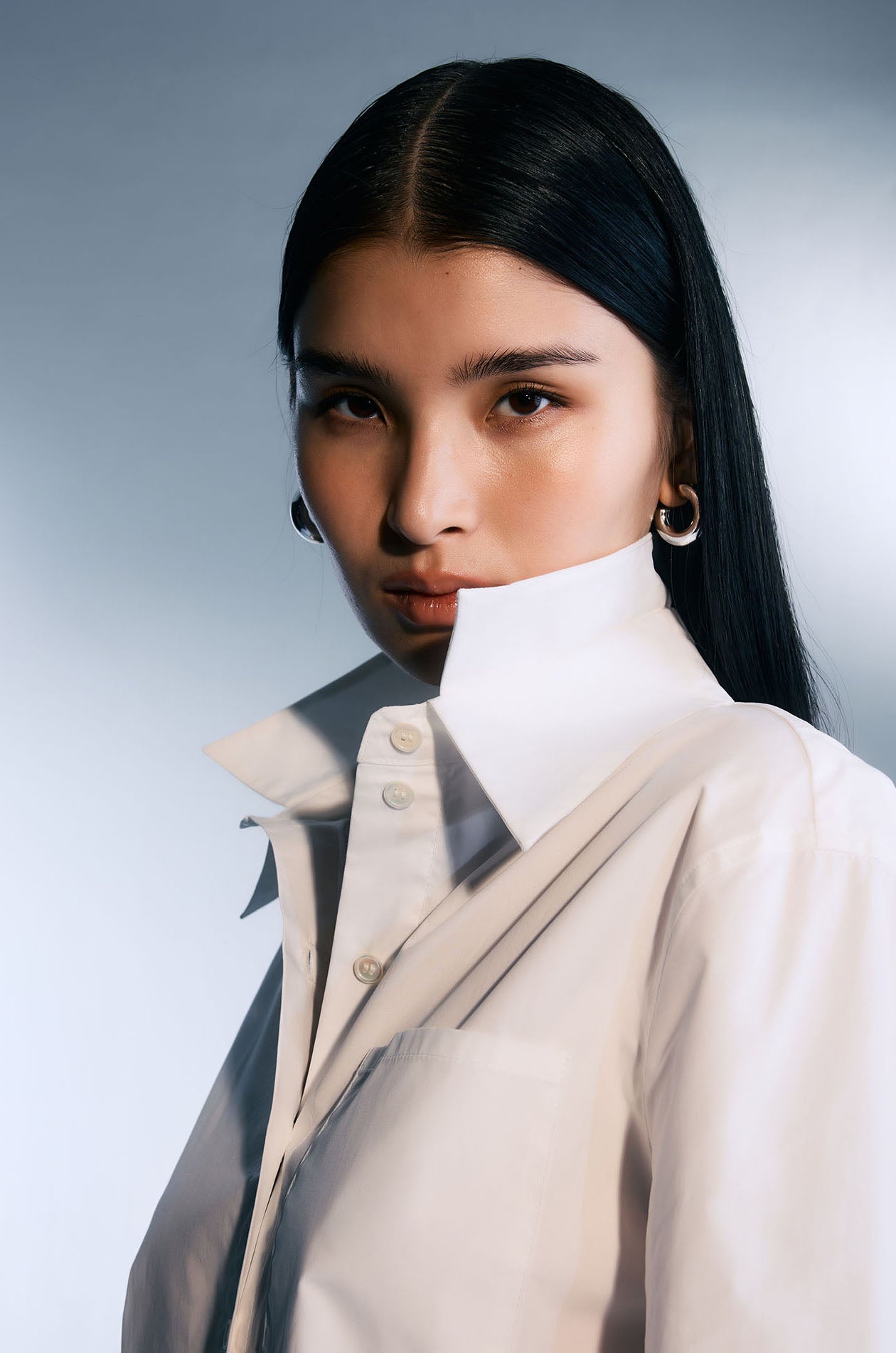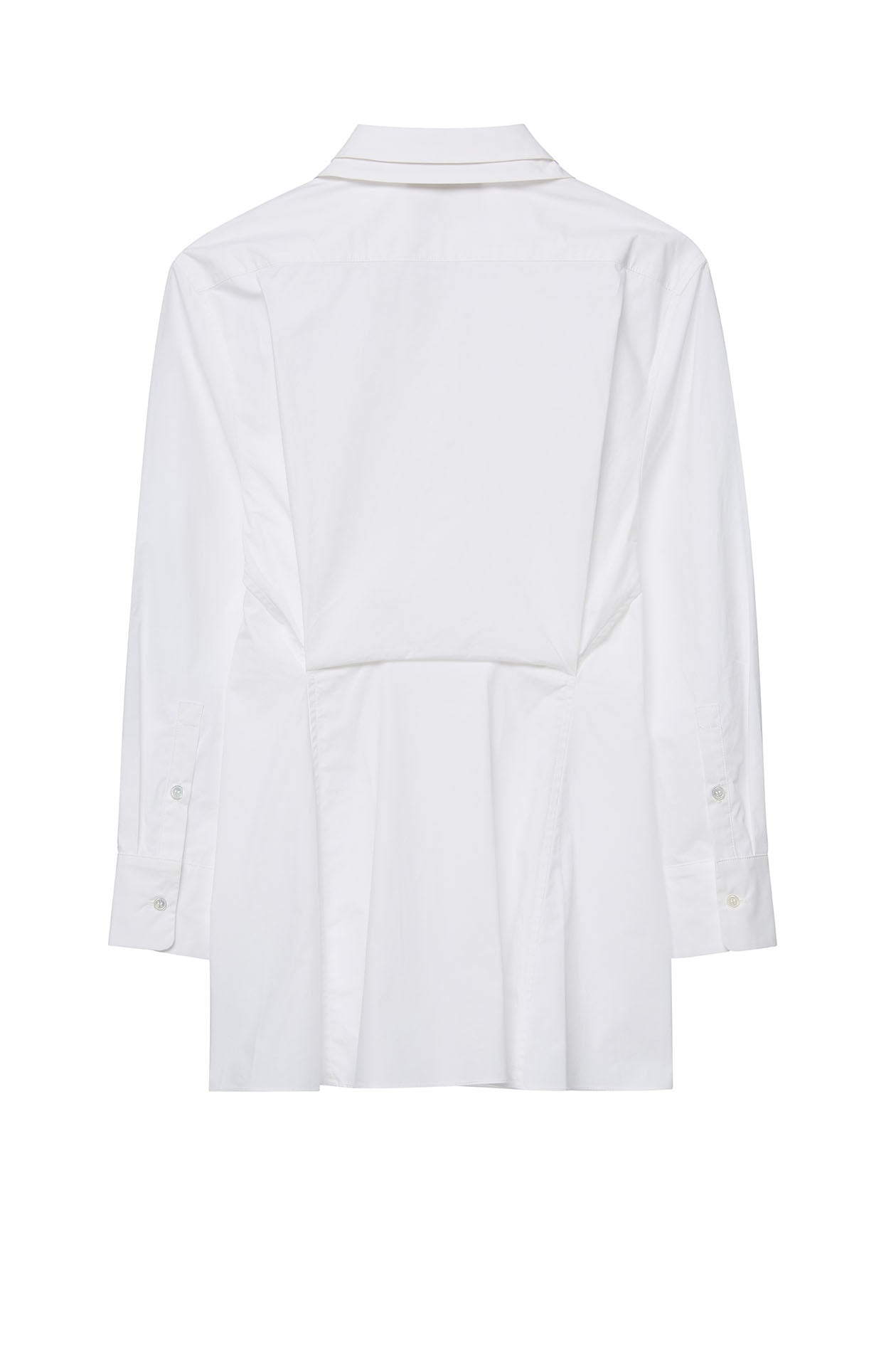 Jaspal X TunTunn | Long-sleeved shirt in cotton poplin. Drop shoulder silhouette with double collars, chest pocket, and tapered waistline. Front button closure. Available in white.