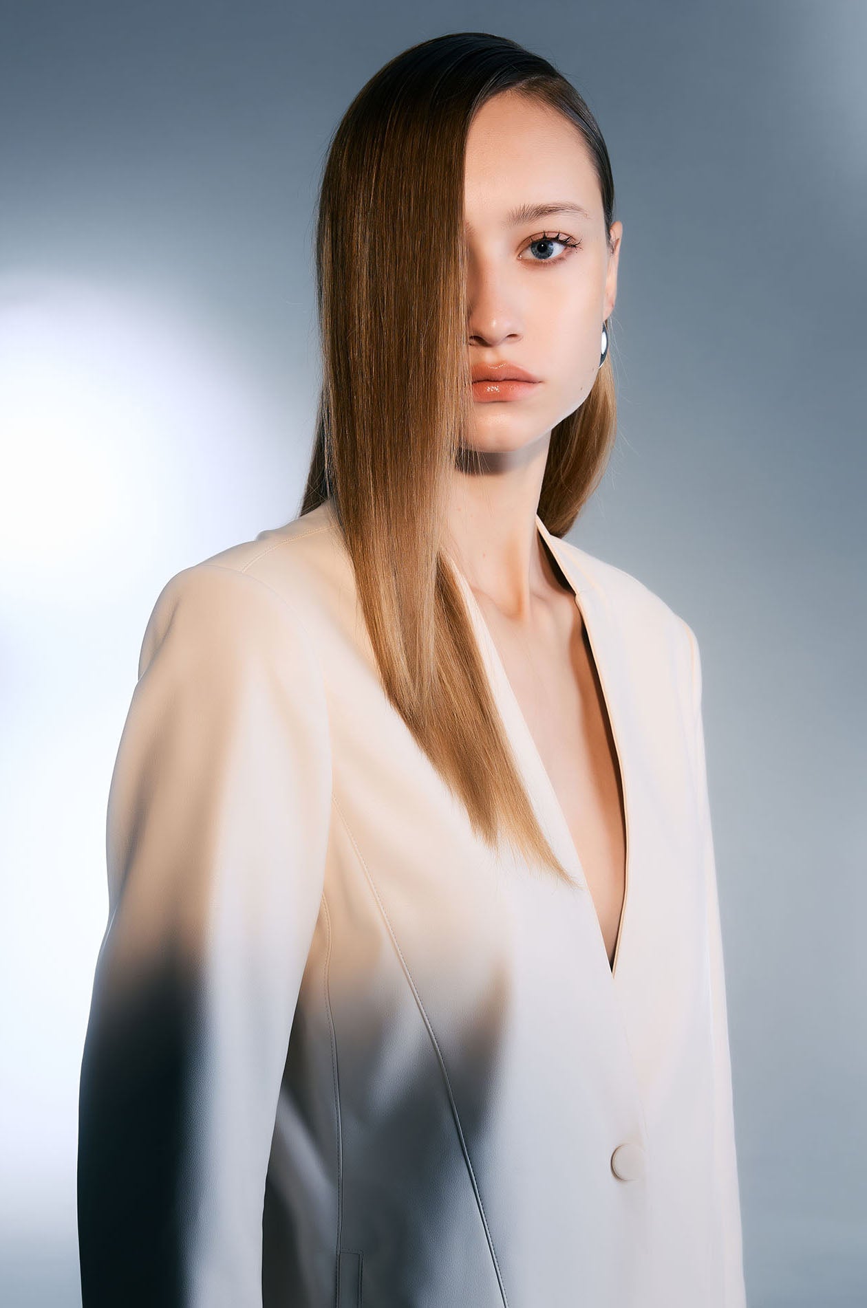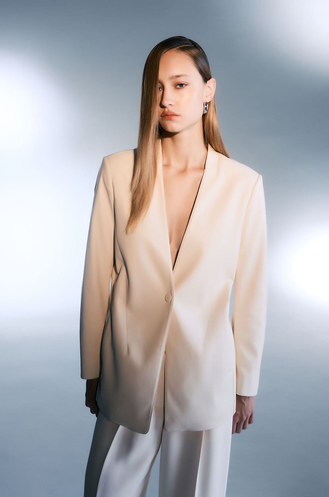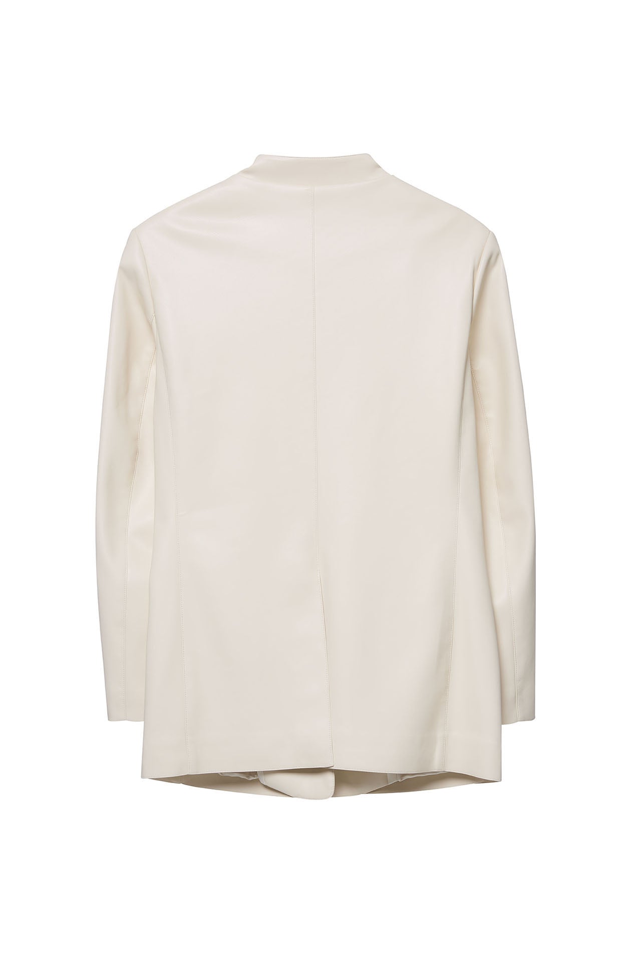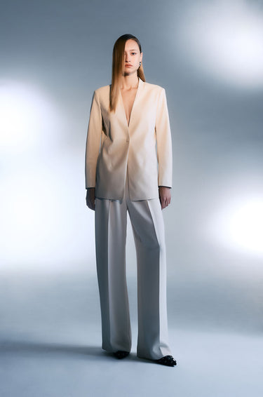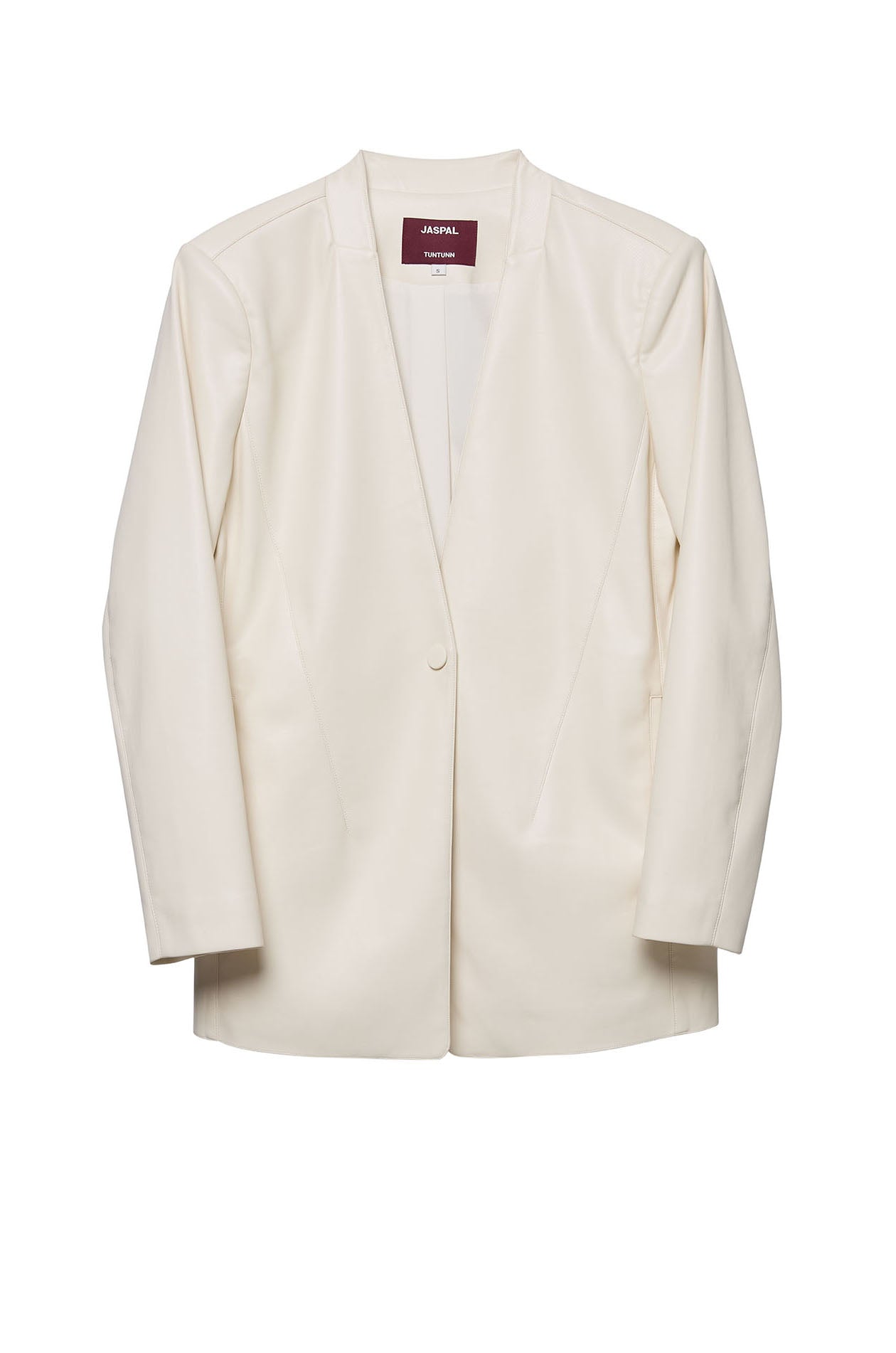 Jaspal X TunTunn | Single-breasted longline blazer in woven fabric. Regular fit with collarless design and padded shoulders. Front button closure. Available in cream.
