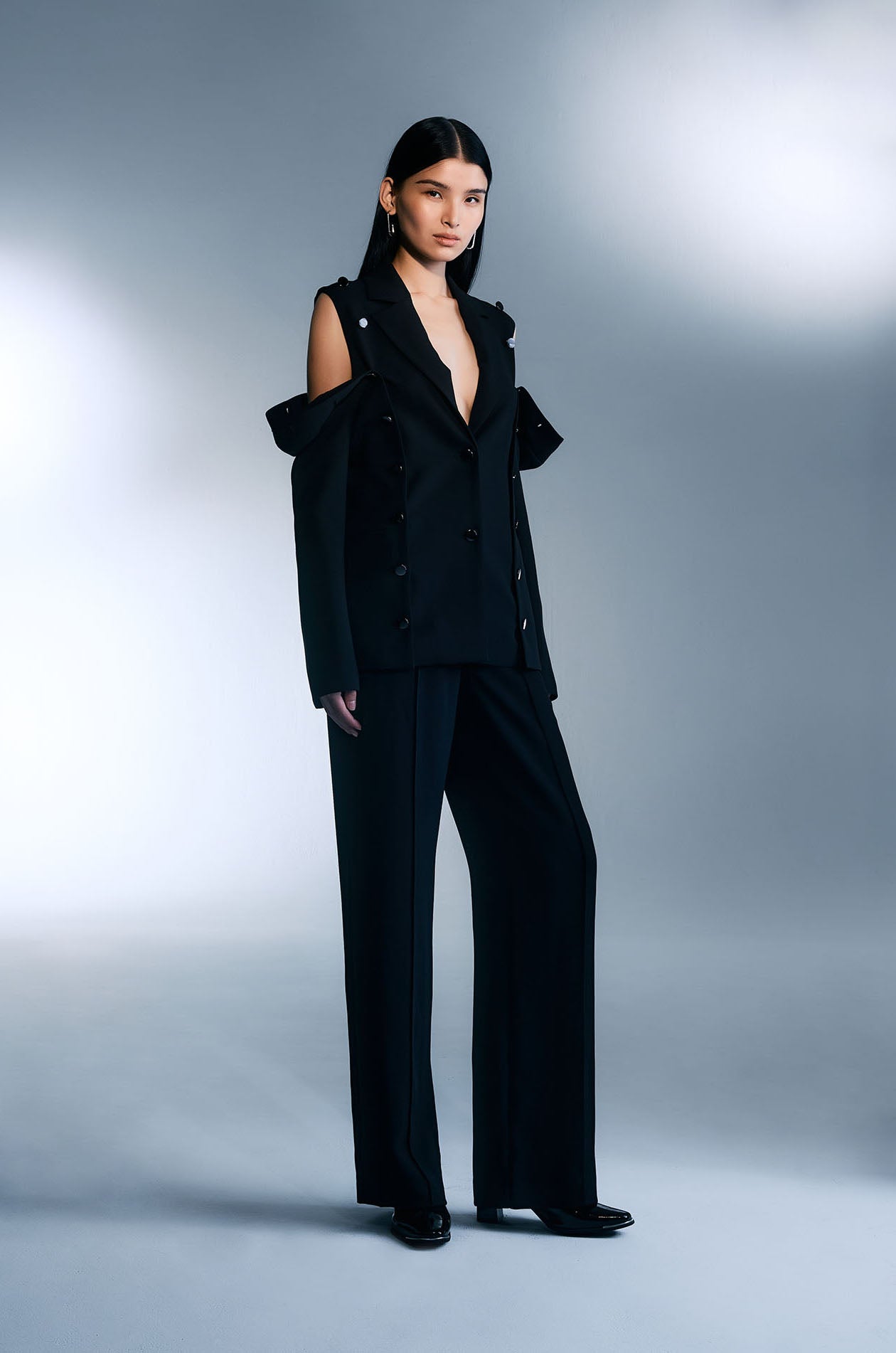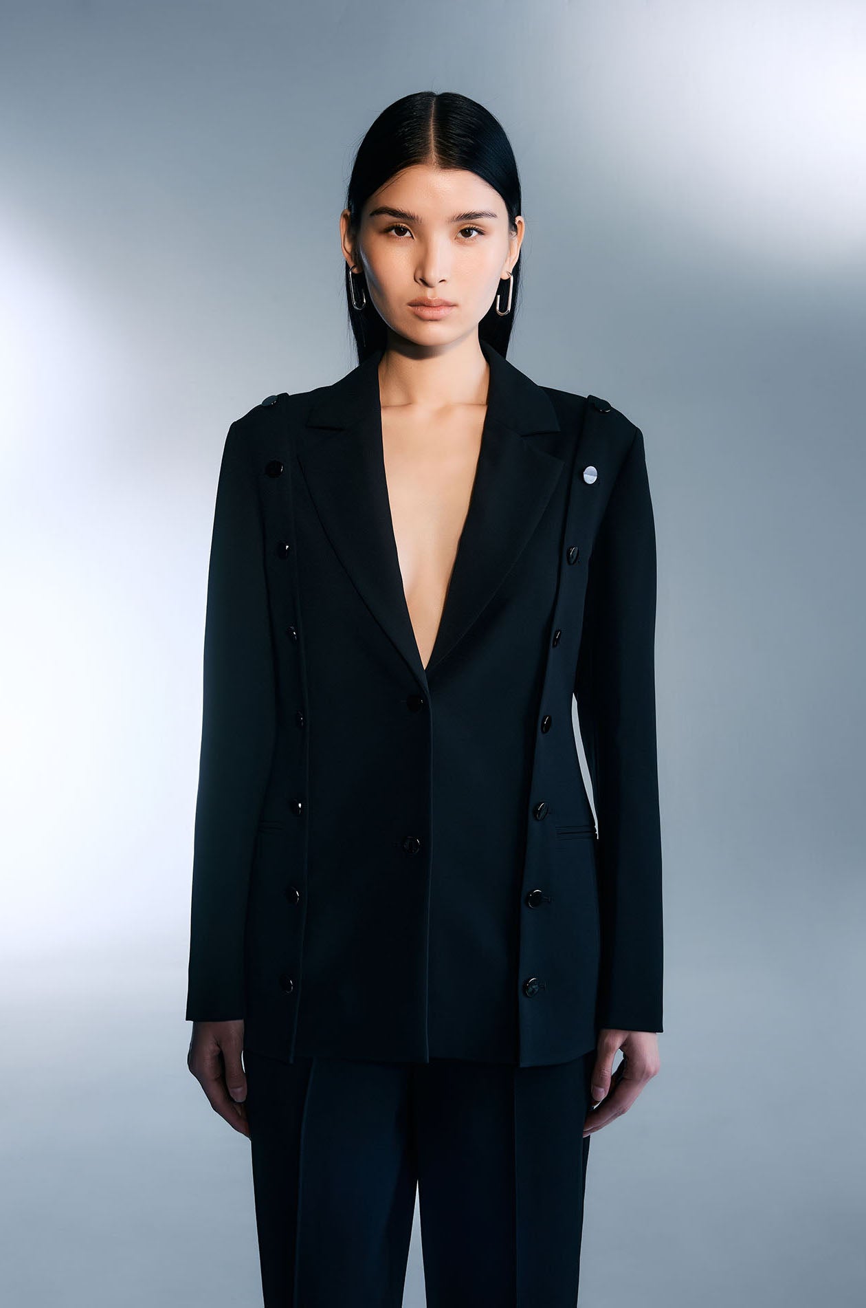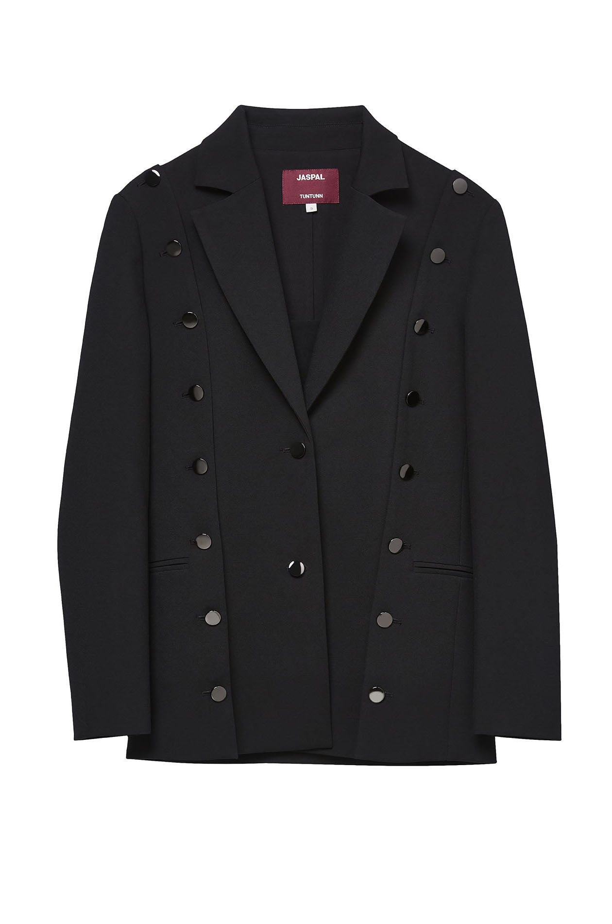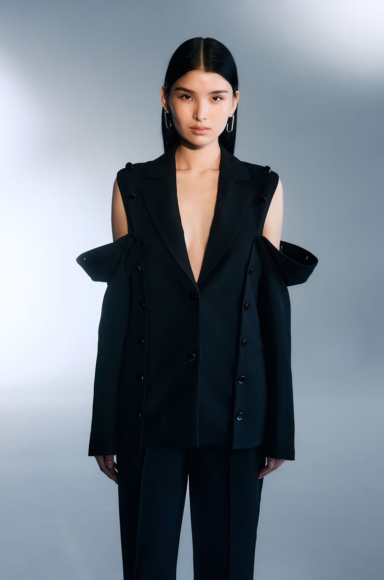 Jaspal X TunTunn | Single-breasted blazer in woven fabric. Avant-garde design featuring architectural button lines along shoulder panels that can be opened to transform into a sleeveless blazer. Front button closure. Available in black.