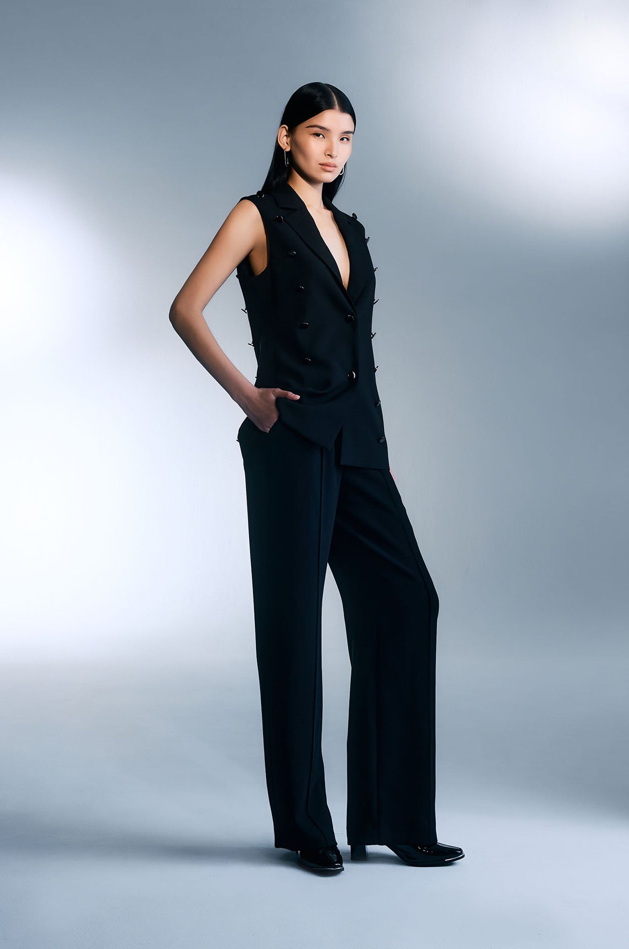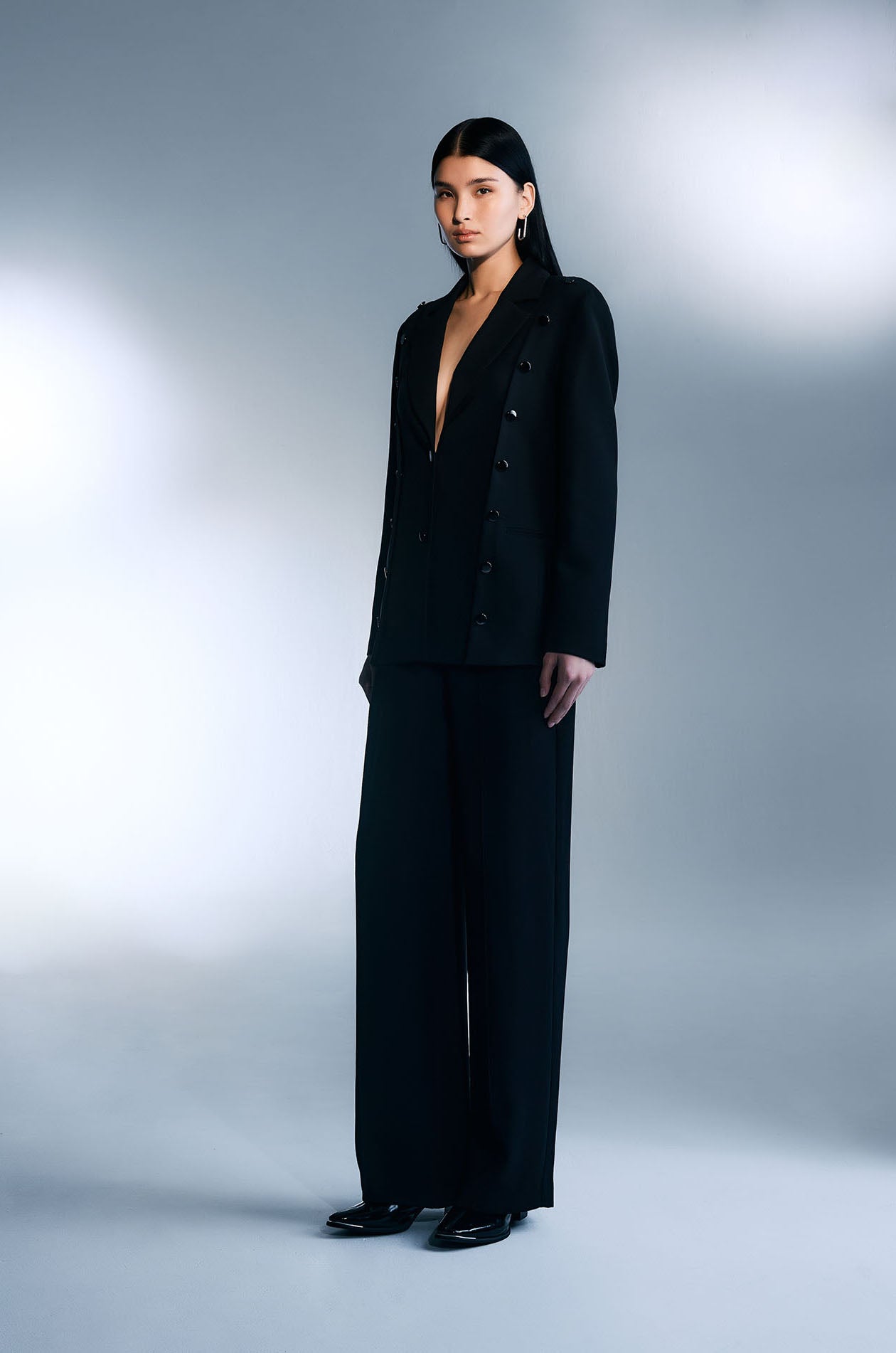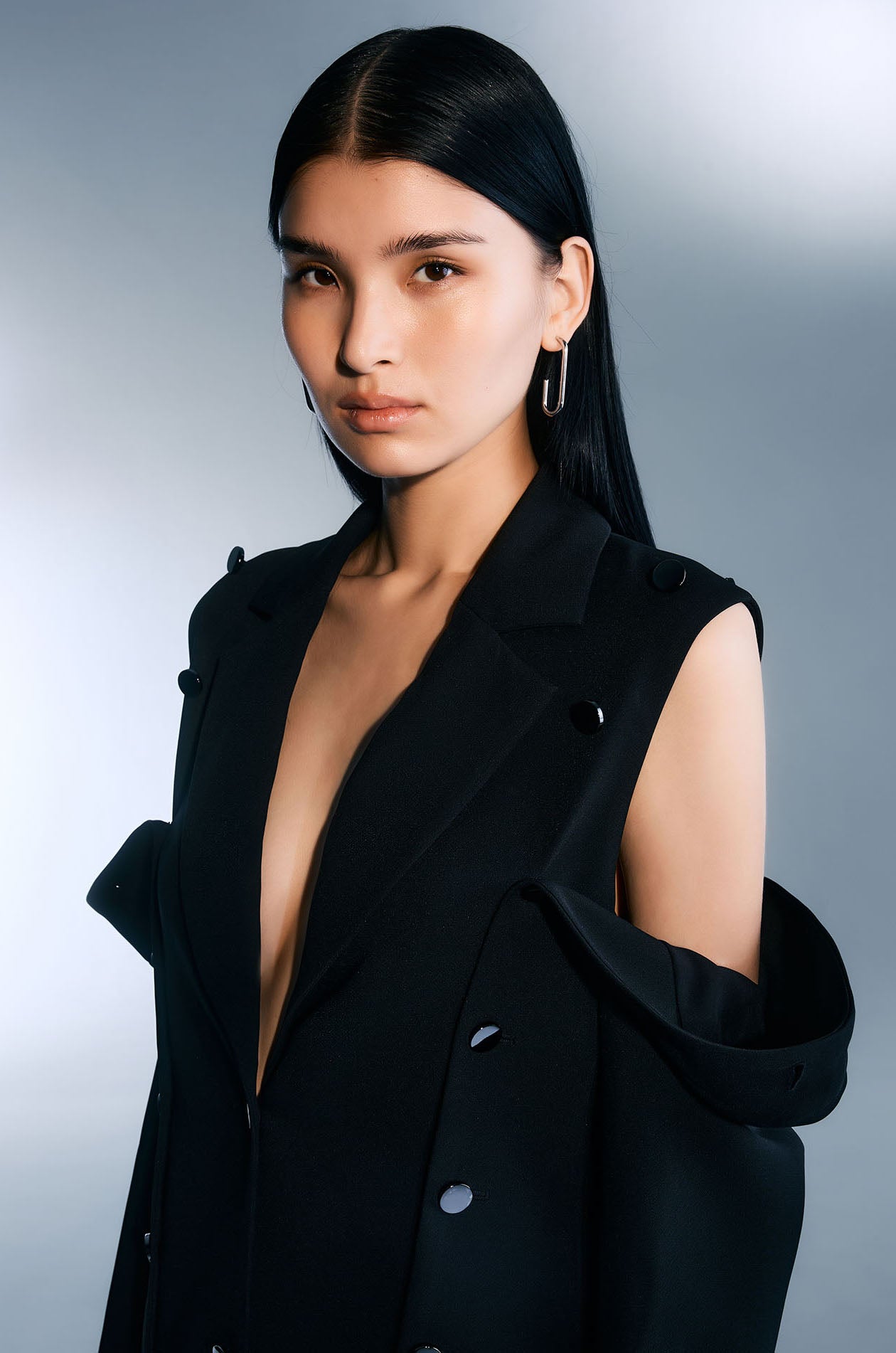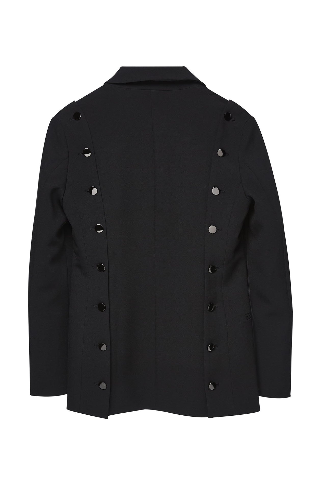 Jaspal X TunTunn | Single-breasted blazer in woven fabric. Avant-garde design featuring architectural button lines along shoulder panels that can be opened to transform into a sleeveless blazer. Front button closure. Available in black.