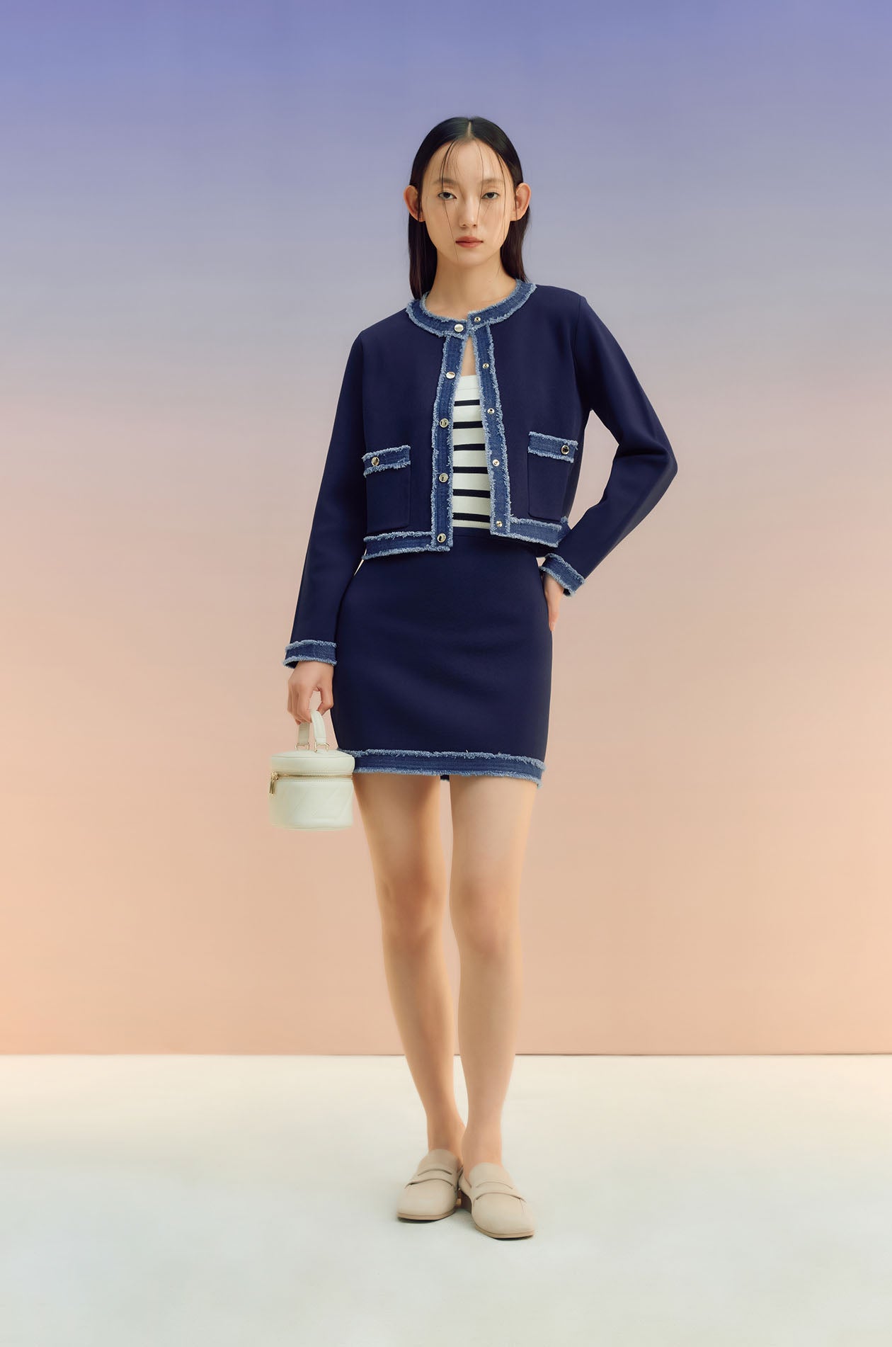 Long-sleeved cardigan in knit fabric with denim trim. Regular fit with round neckline and front pockets. Front button closure. Available in off-white and indigo.